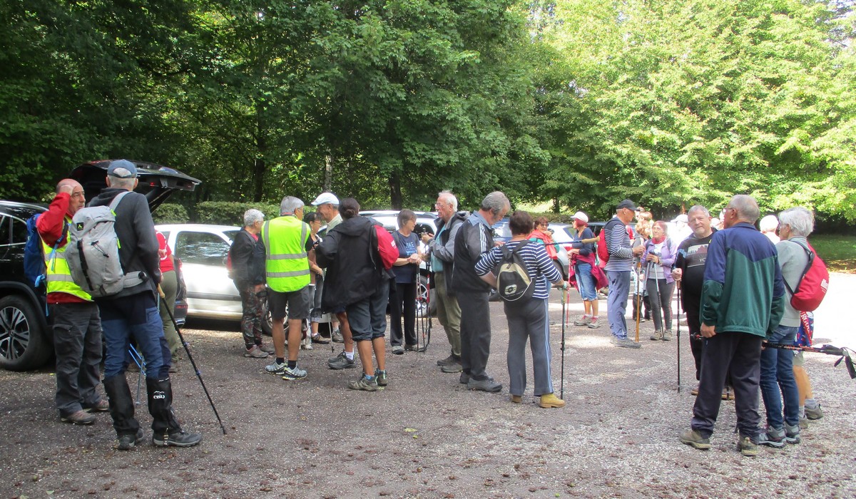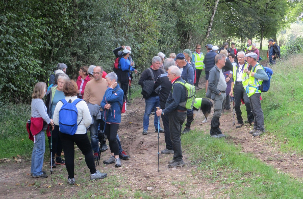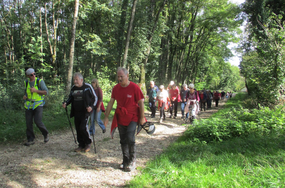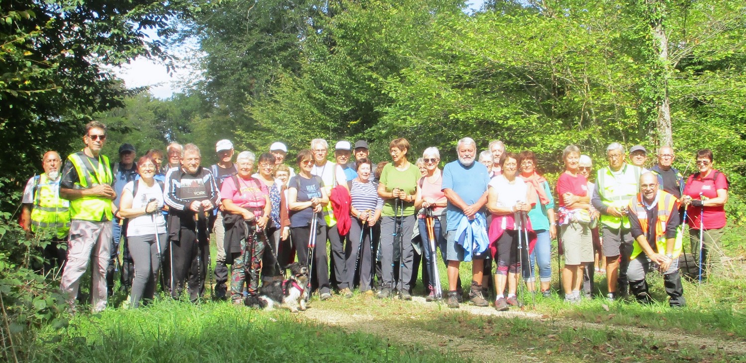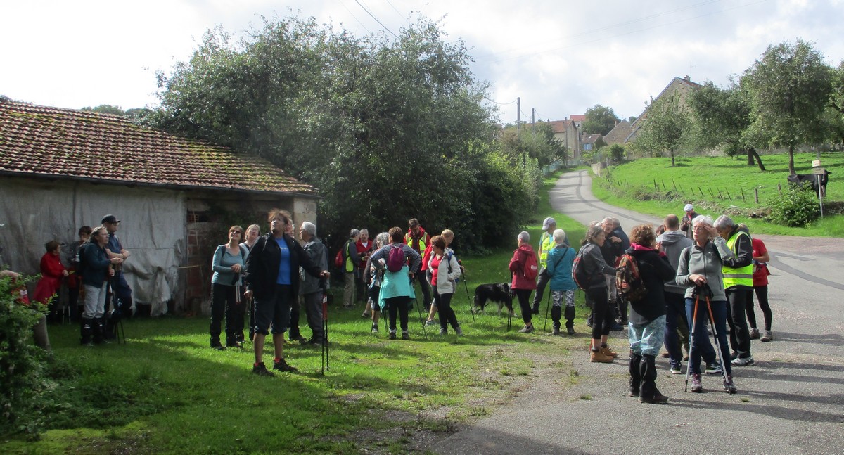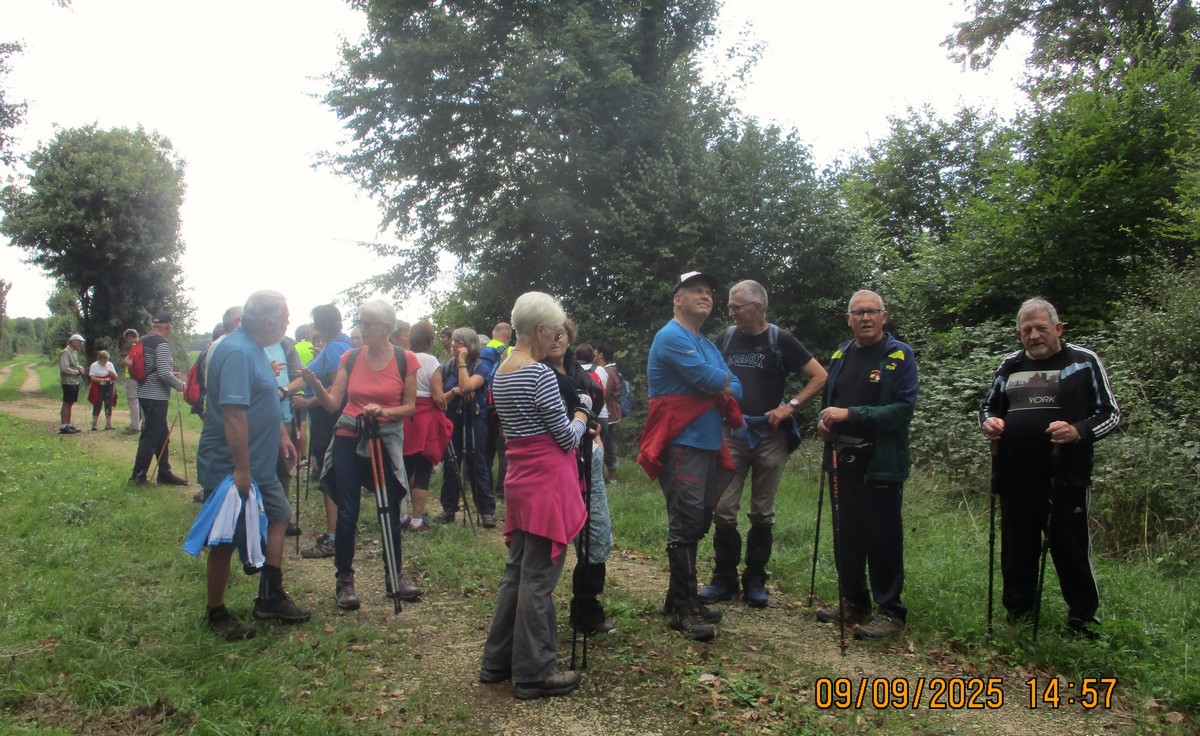 Nous voici de retour de vacances sous le soleil. Nous sommes une cinquantaine de valeureux marcheurs à venir à Vieux-Moulins pour repartir du bon pied ou plutôt de bons pieds. Après s’être raconté nos périples de la semaine passée, nous partons en direction de Perrancey et plus précisément du hameau du « Moulin des Pères », lequel nous traversons pour rejoindre le bois. Les sentiers sont légèrement humides, mais pas gouillasseux. Quelques entraves barrent notre parcours par endroits, mais Noël nous fait le chemin. Nous sortons du bois pour traverser le ruisseau de Lanvau (Lanvas disent certains) qui coule fort après les dernières pluies tombées. Une bonne grimpette pour le cardio et nous voici sur le plateau où nous décidons de faire la photo de groupe ; ça en fait du monde sur la pellicule. Nous finissons tranquillement notre balade, toujours sous le soleil, jusqu’à redescendre en direction du village en suivant le cours de la « Mouche ». Et pour finir, un dicton local : « Tout est bien à Vieux-Moulins. Si tu y viens, tu y reviens » signé Gilberte !