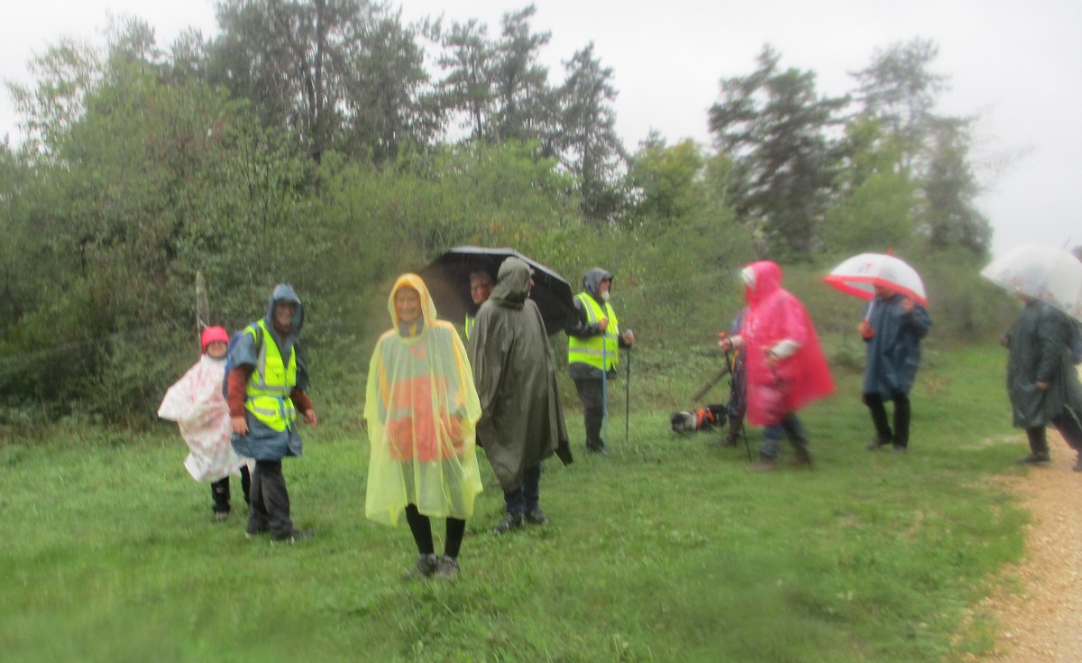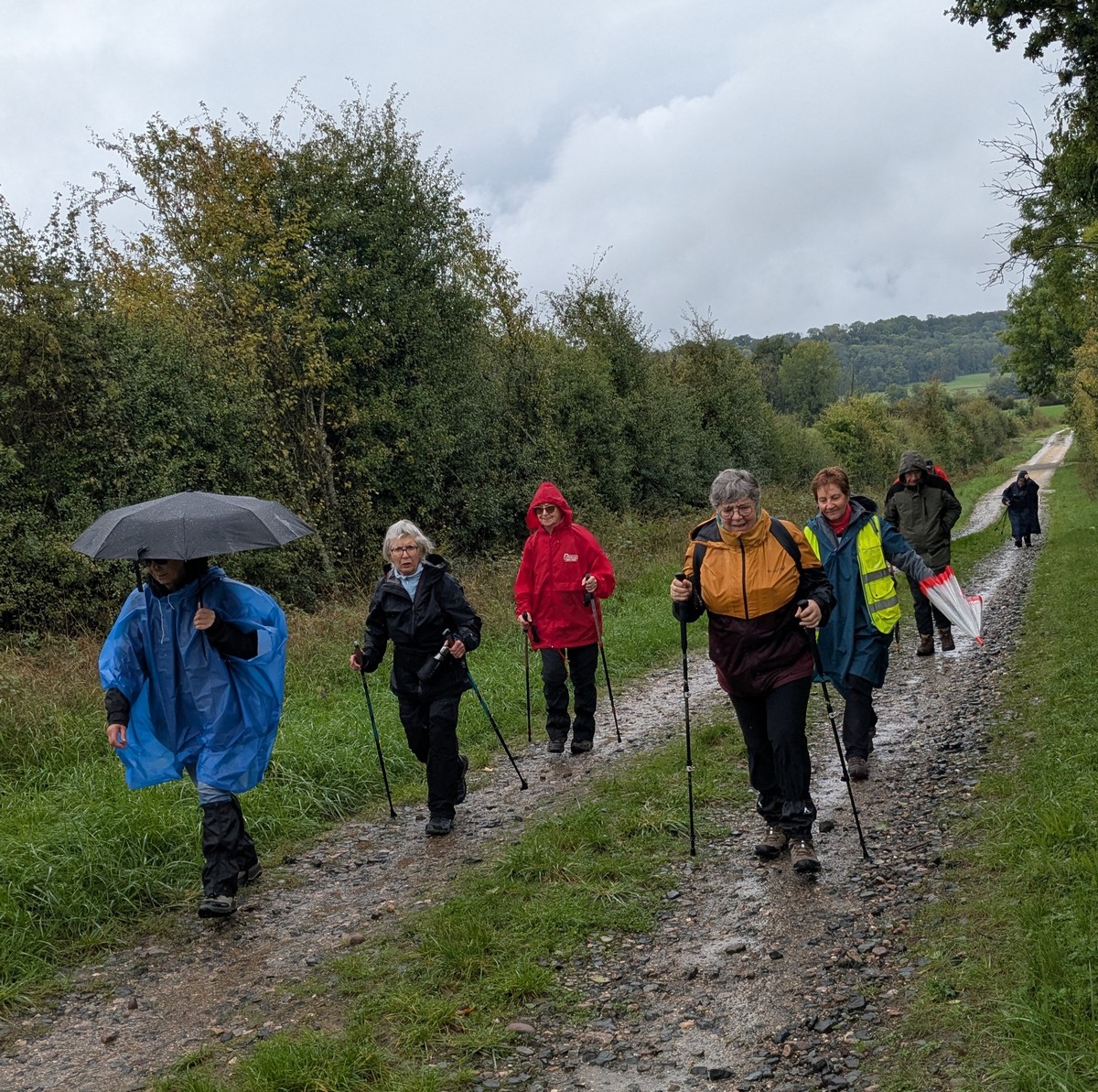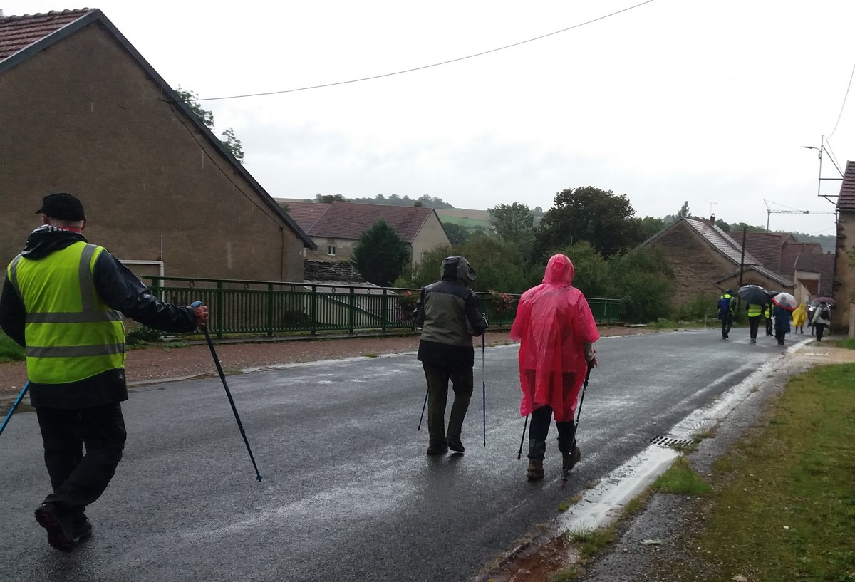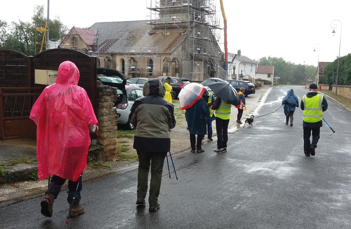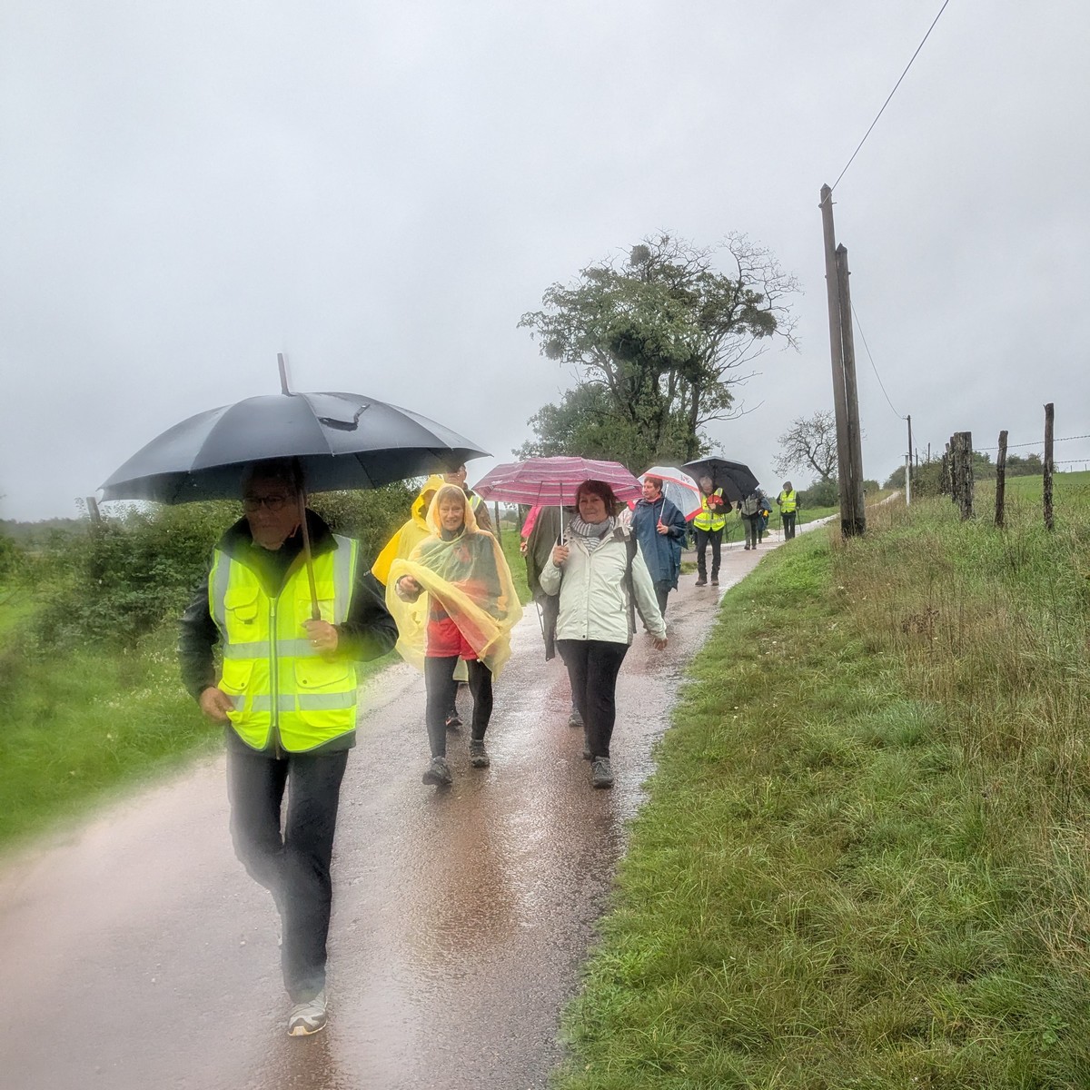 C’est parti pour 10 kilomètres autour de Plesnoy, nous sommes une bonne dizaine et demie de marcheurs. Comme vous pouvez le remarquer la pluie est toujours là (ça manquait !). Nous sortons du village par une petite route goudronnée puis prenons un petit chemin accompagné d’une « bonne grimpette » dans le bois assez gras. Plus loin, nous empruntons une portion du GR7 (qui mène des Vosges aux Pyrénées) en mode descente. Tiens, voilà une éclaircie pour nous accompagner afin de rejoindre le village par un chemin blanc. Nous souhaitons la bienvenue aux nouveaux marcheurs.