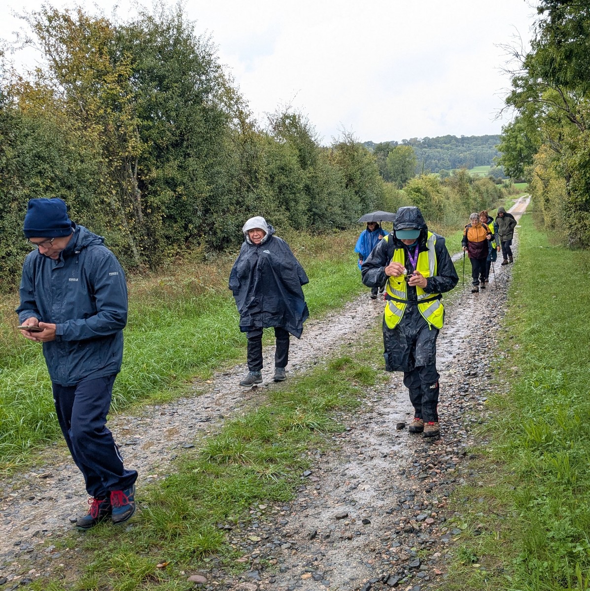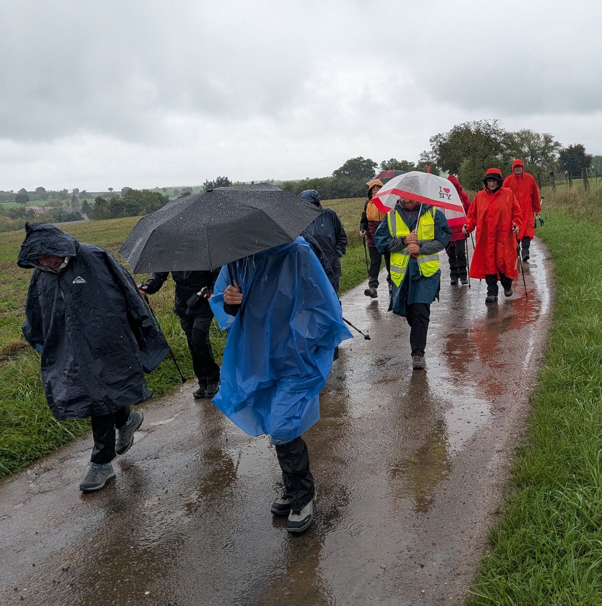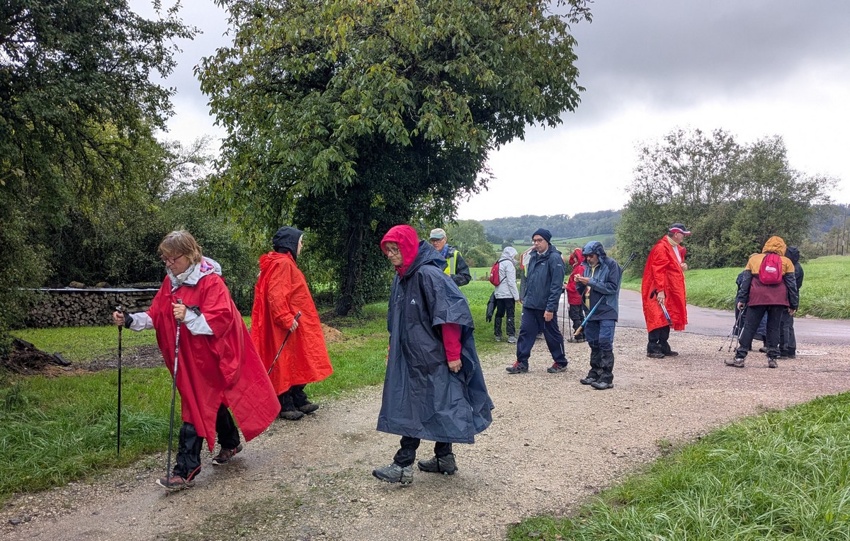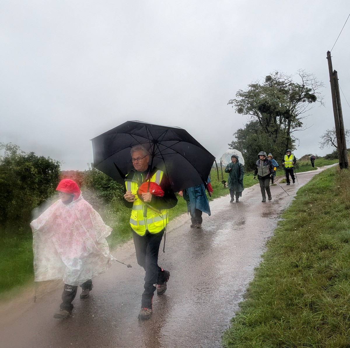 C’est parti pour 10 kilomètres autour de Plesnoy, nous sommes une bonne dizaine et demie de marcheurs. Comme vous pouvez le remarquer la pluie est toujours là (ça manquait !). Nous sortons du village par une petite route goudronnée puis prenons un petit chemin accompagné d’une « bonne grimpette » dans le bois assez gras. Plus loin, nous empruntons une portion du GR7 (qui mène des Vosges aux Pyrénées) en mode descente. Tiens, voilà une éclaircie pour nous accompagner afin de rejoindre le village par un chemin blanc. Nous souhaitons la bienvenue aux nouveaux marcheurs.