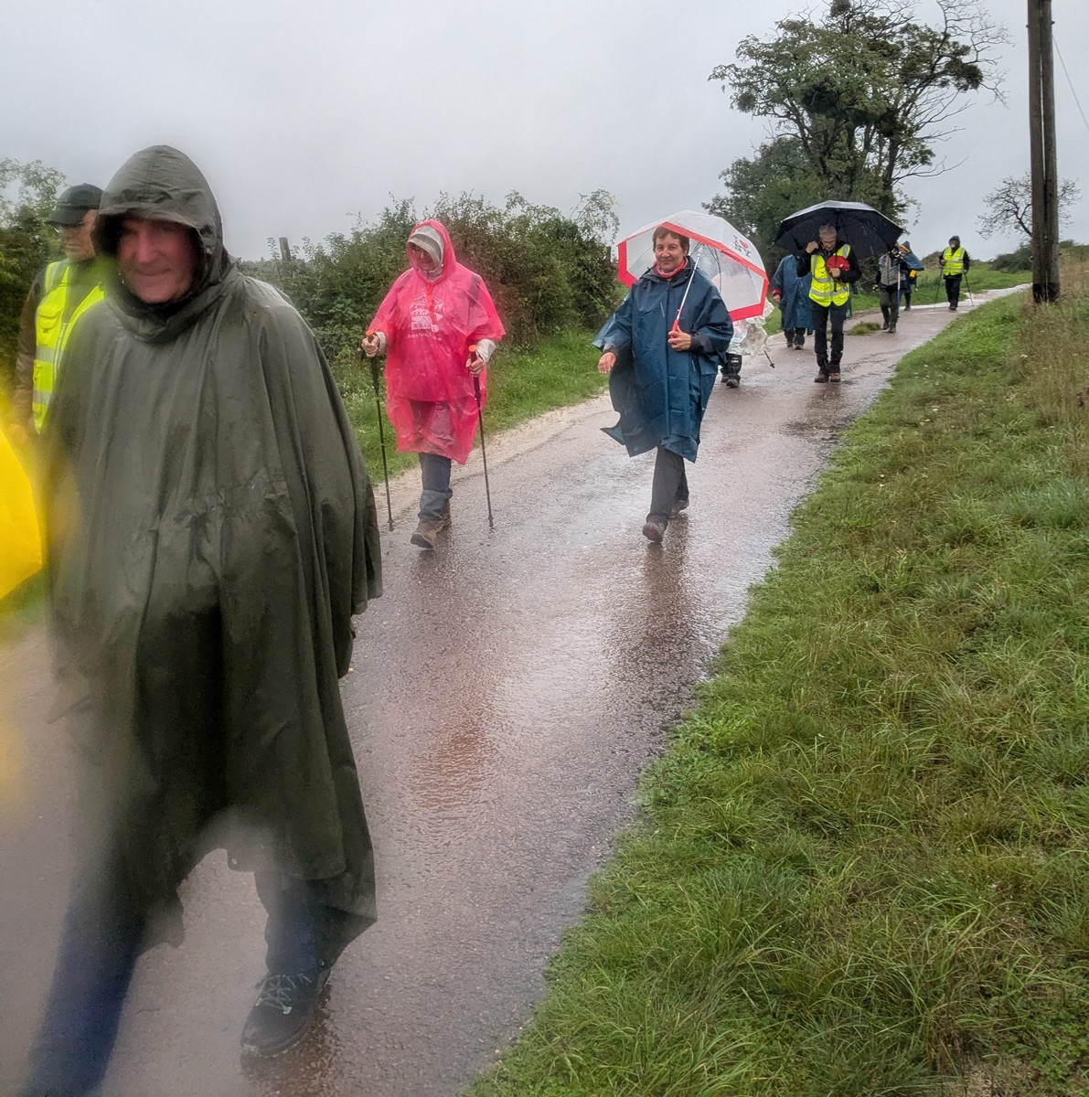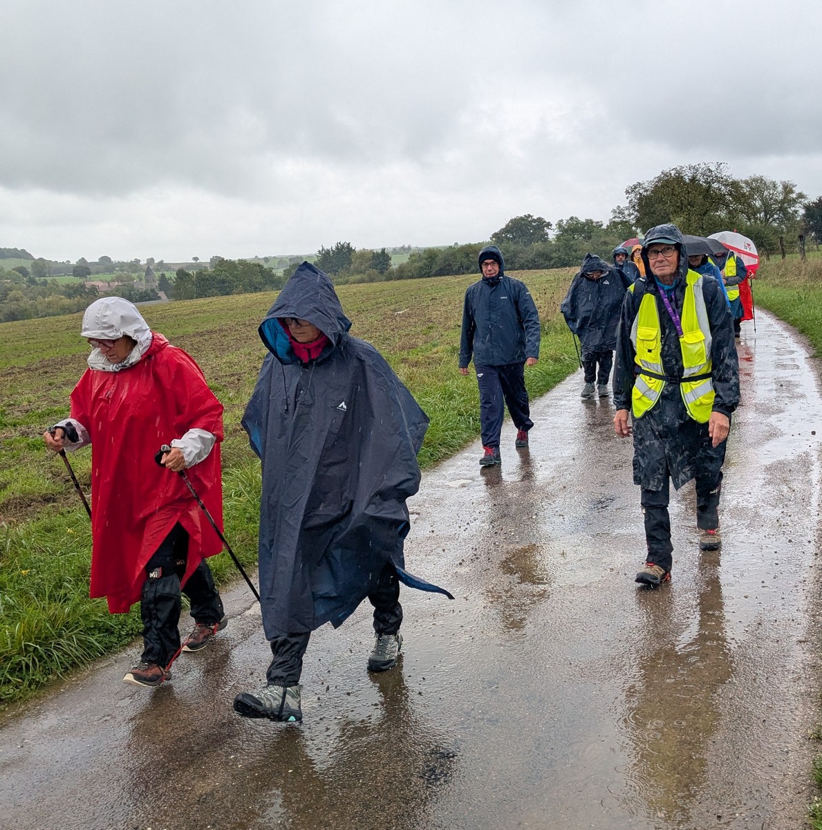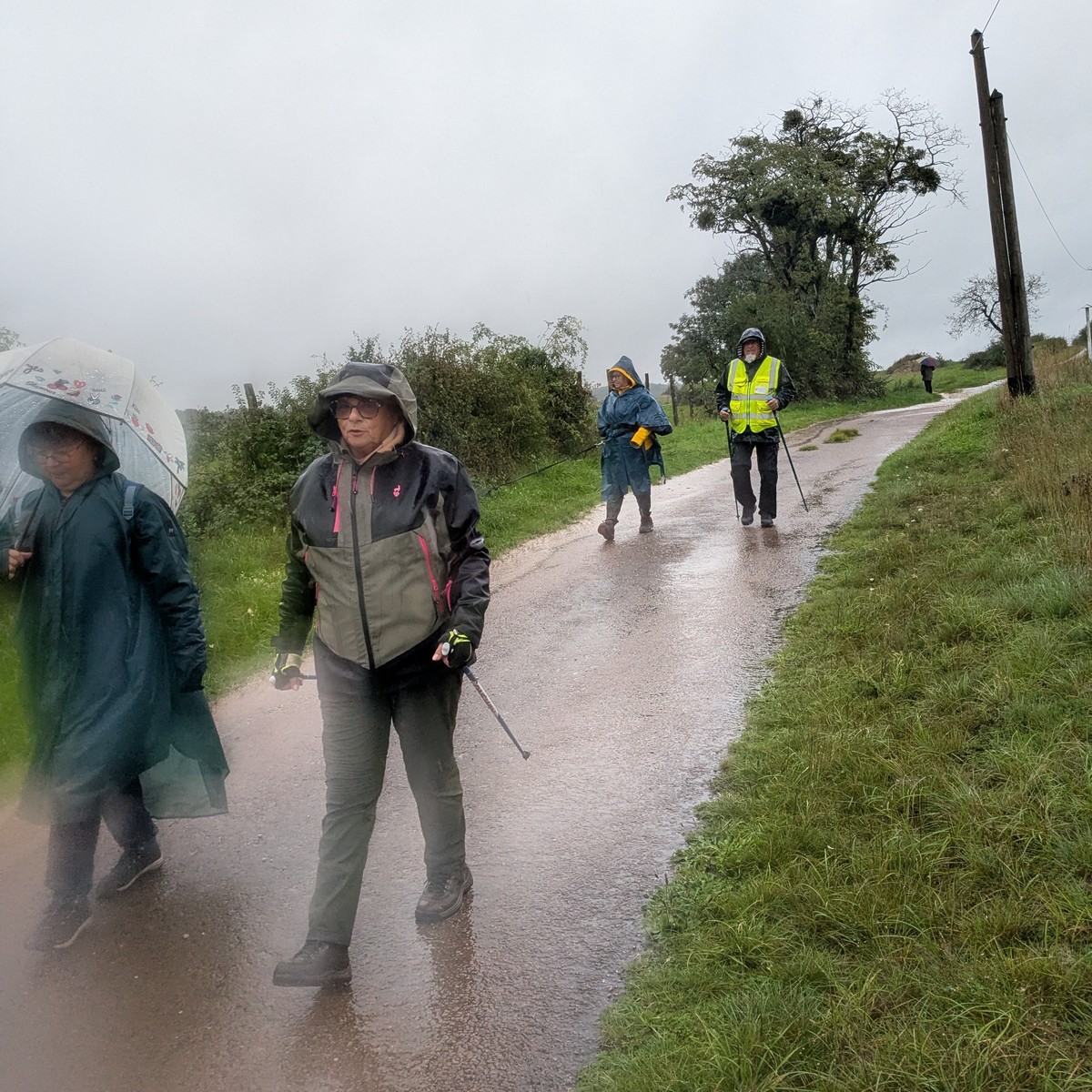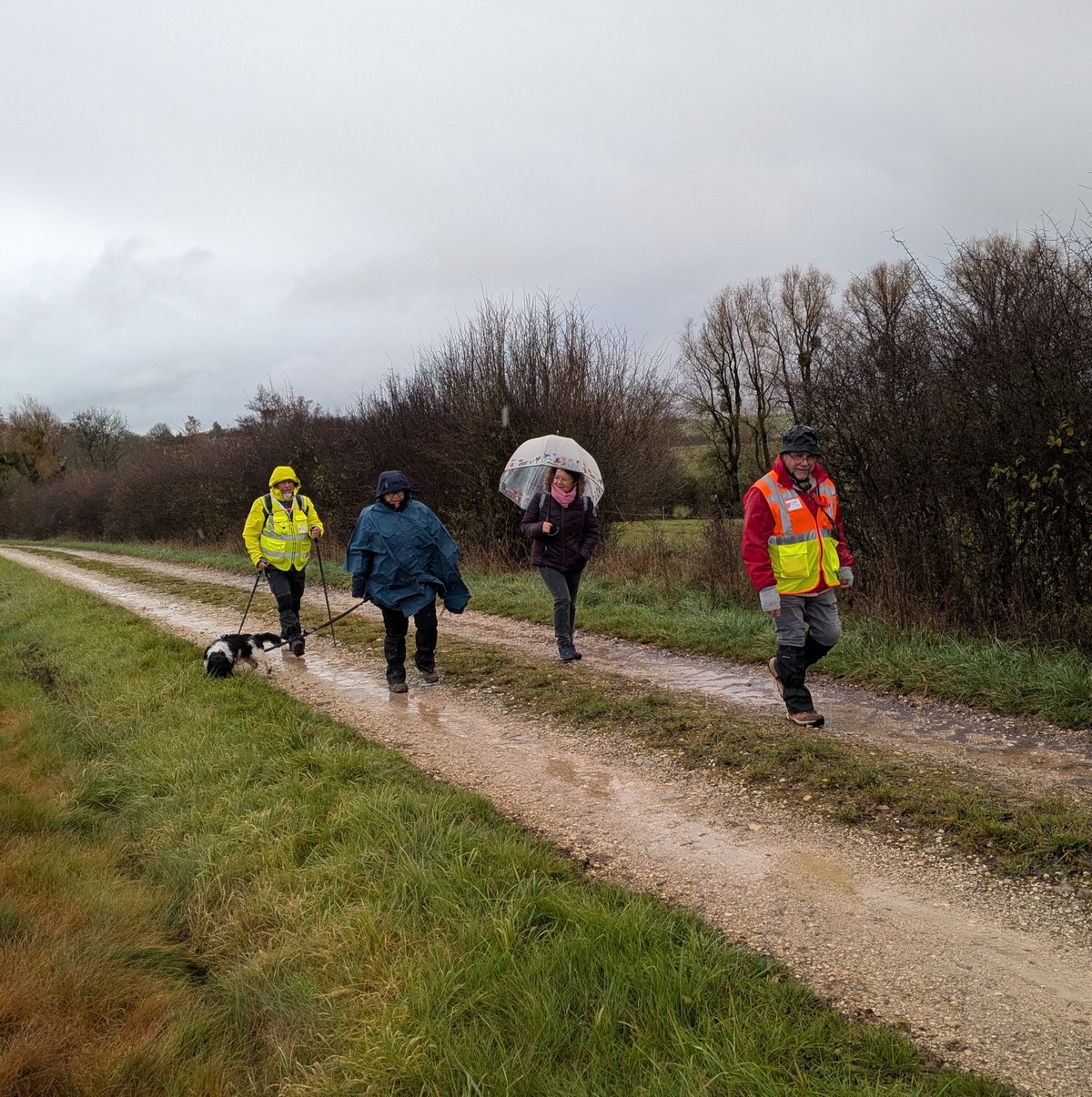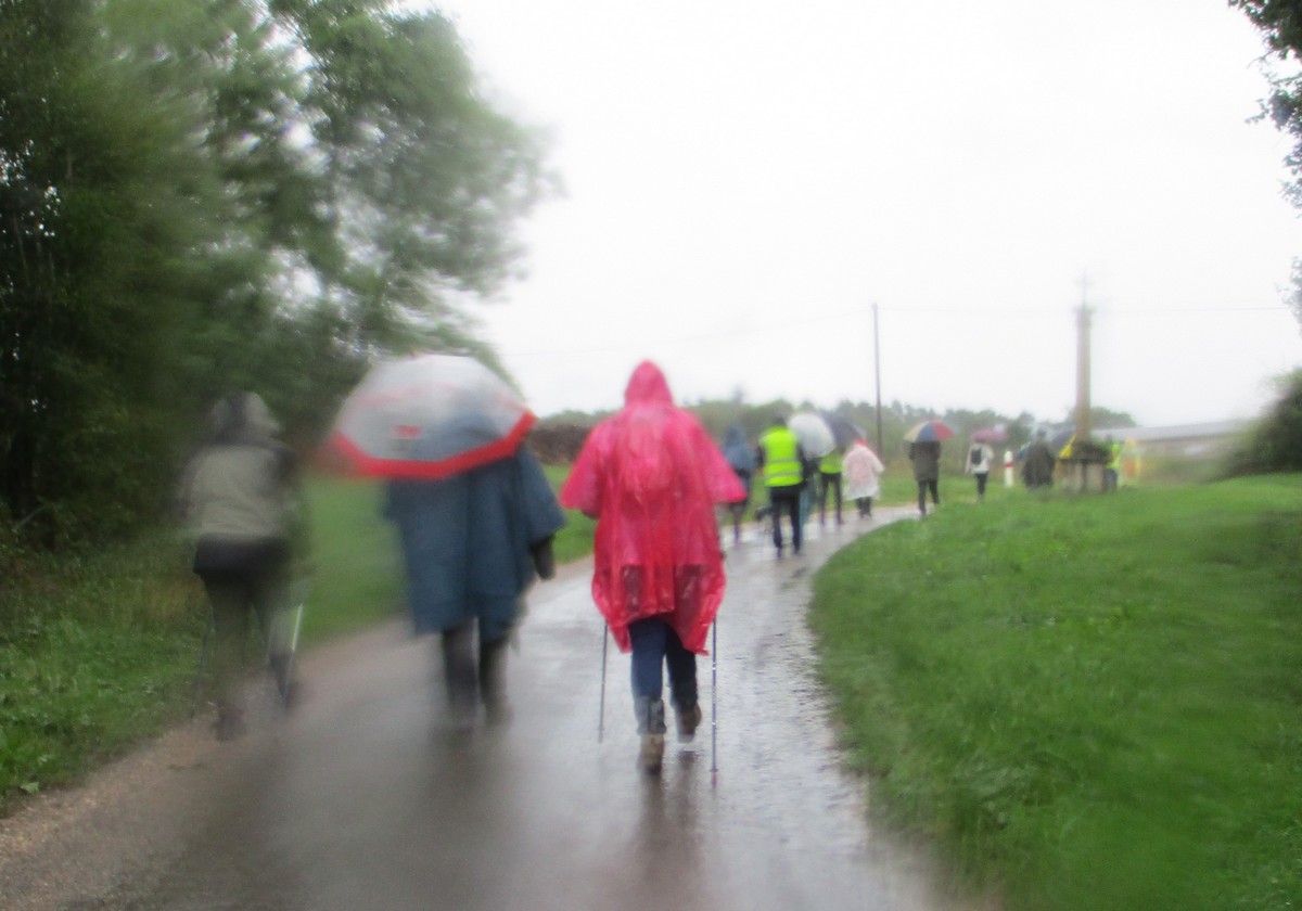 C’est parti pour 10 kilomètres autour de Plesnoy, nous sommes une bonne dizaine et demie de marcheurs. Comme vous pouvez le remarquer la pluie est toujours là (ça manquait !). Nous sortons du village par une petite route goudronnée puis prenons un petit chemin accompagné d’une « bonne grimpette » dans le bois assez gras. Plus loin, nous empruntons une portion du GR7 (qui mène des Vosges aux Pyrénées) en mode descente. Tiens, voilà une éclaircie pour nous accompagner afin de rejoindre le village par un chemin blanc. Nous souhaitons la bienvenue aux nouveaux marcheurs.
