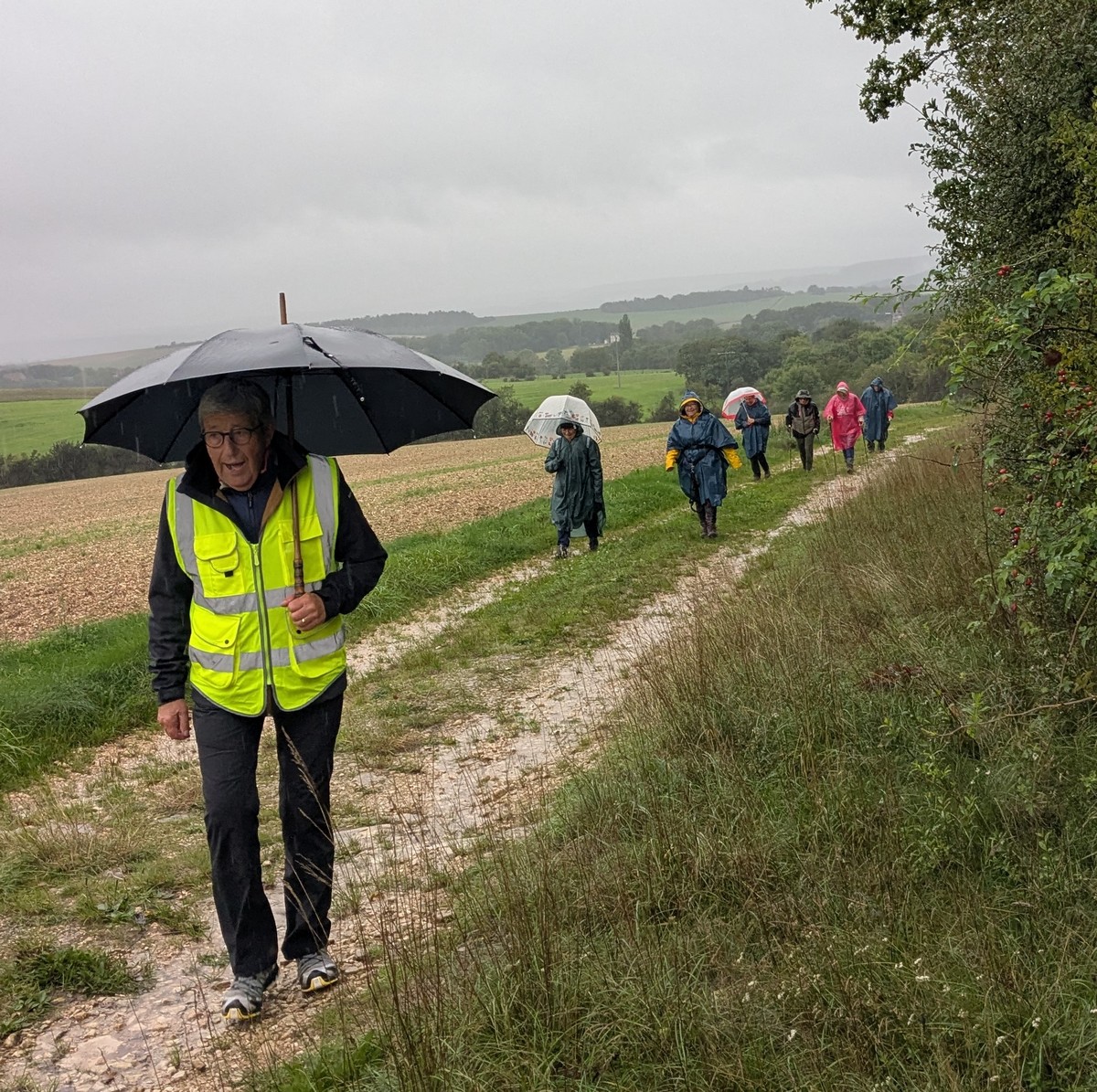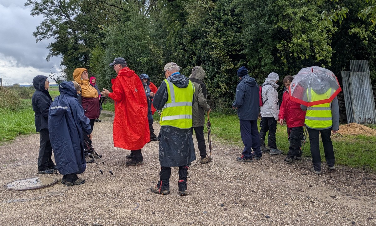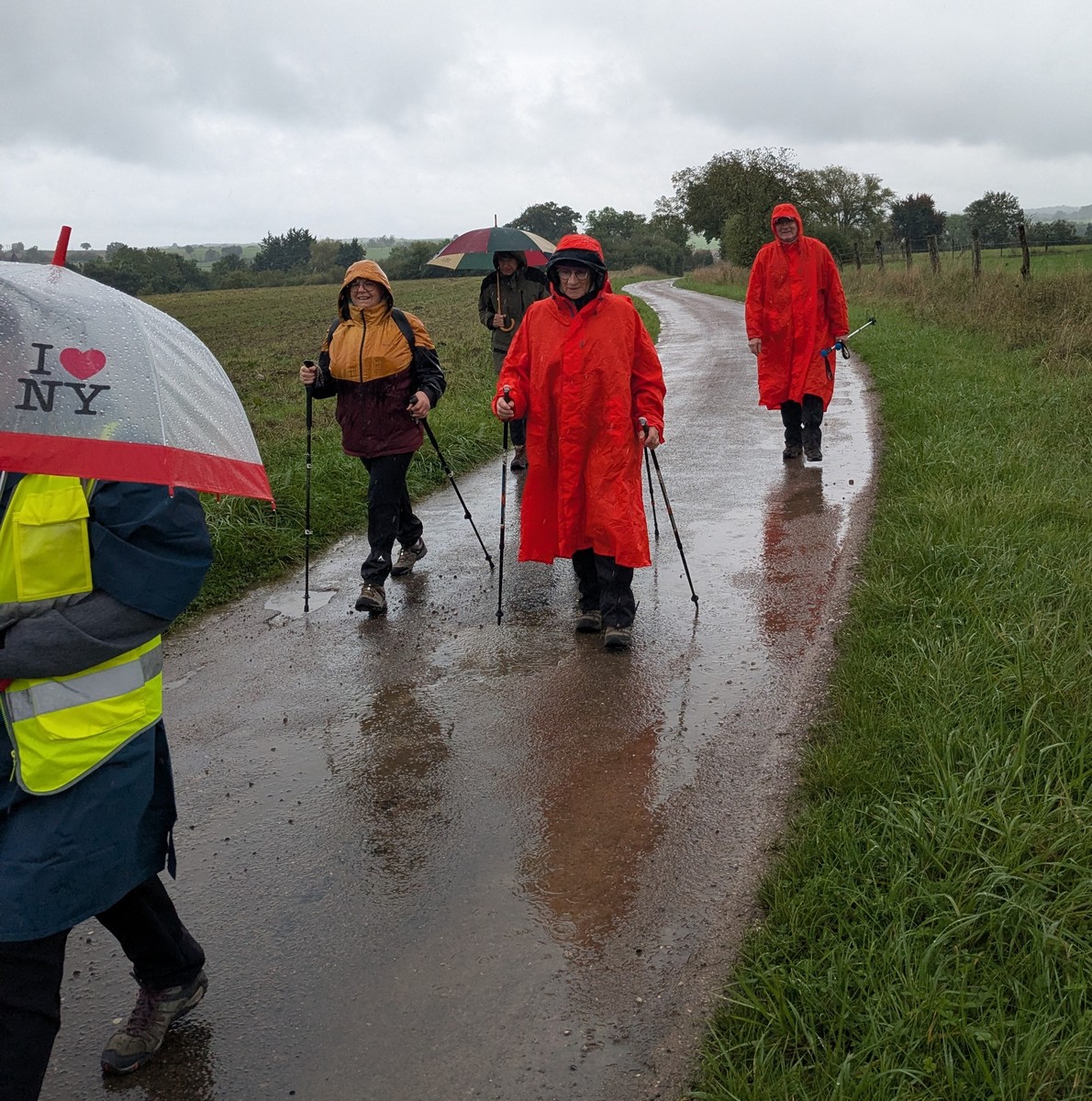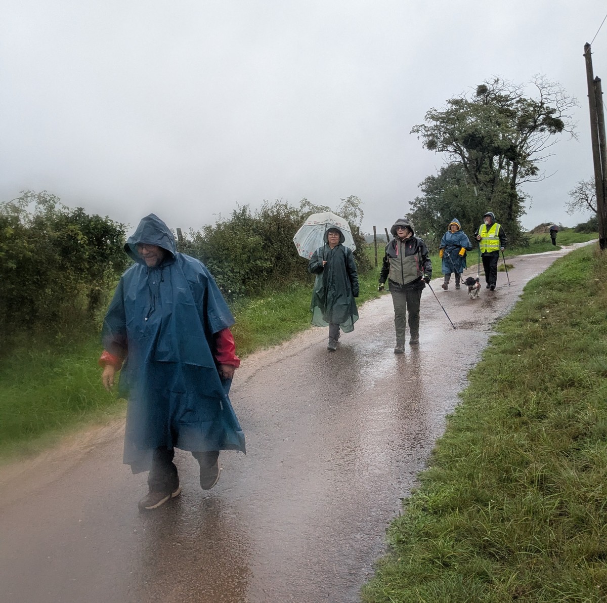 C’est parti pour 10 kilomètres autour de Plesnoy, nous sommes une bonne dizaine et demie de marcheurs. Comme vous pouvez le remarquer la pluie est toujours là (ça manquait !). Nous sortons du village par une petite route goudronnée puis prenons un petit chemin accompagné d’une « bonne grimpette » dans le bois assez gras. Plus loin, nous empruntons une portion du GR7 (qui mène des Vosges aux Pyrénées) en mode descente. Tiens, voilà une éclaircie pour nous accompagner afin de rejoindre le village par un chemin blanc. Nous souhaitons la bienvenue aux nouveaux marcheurs.
