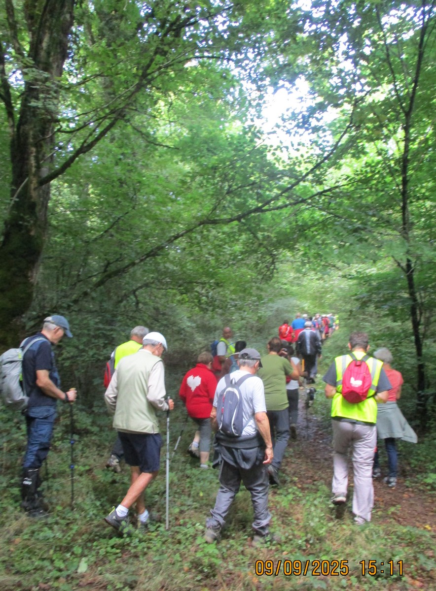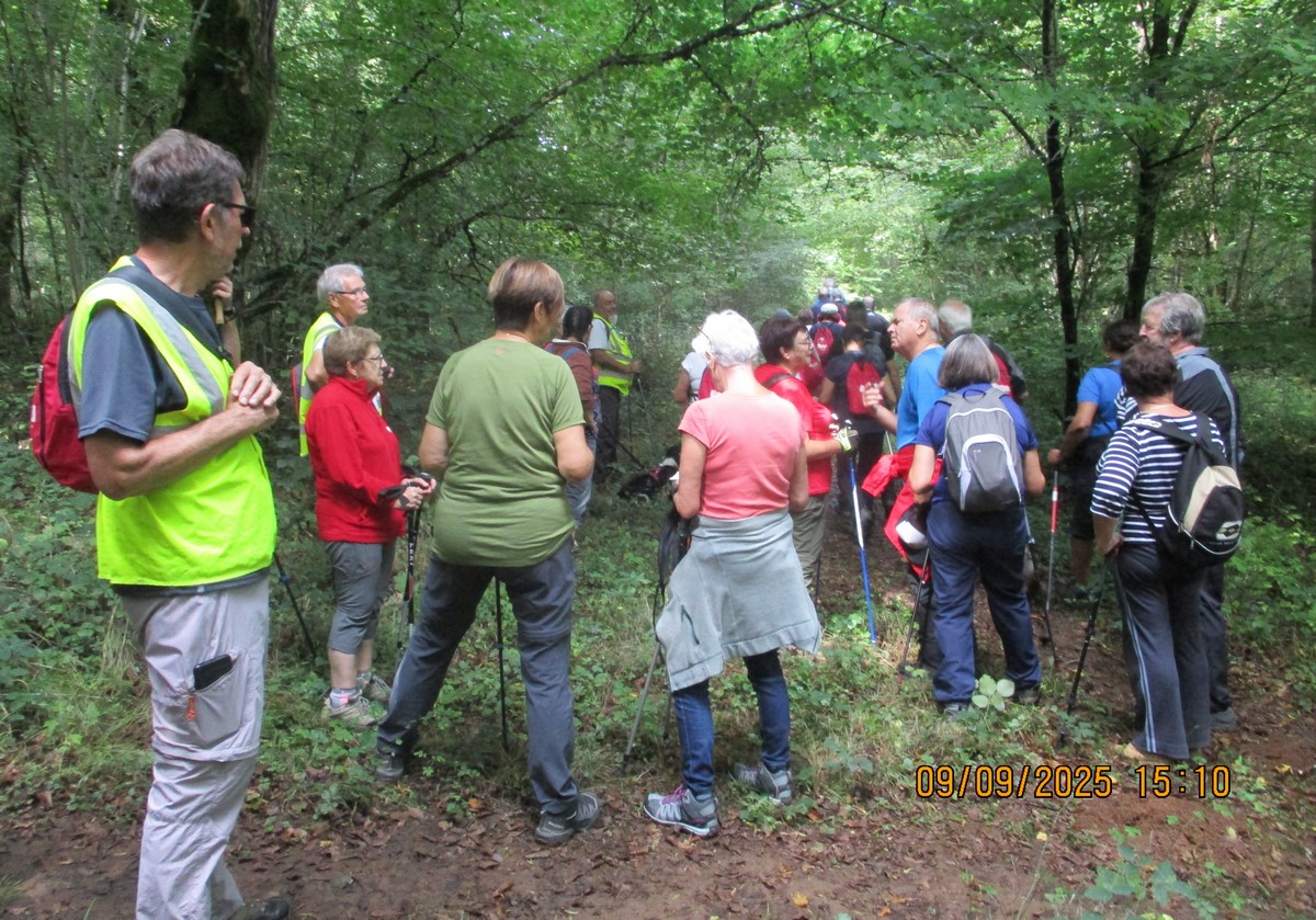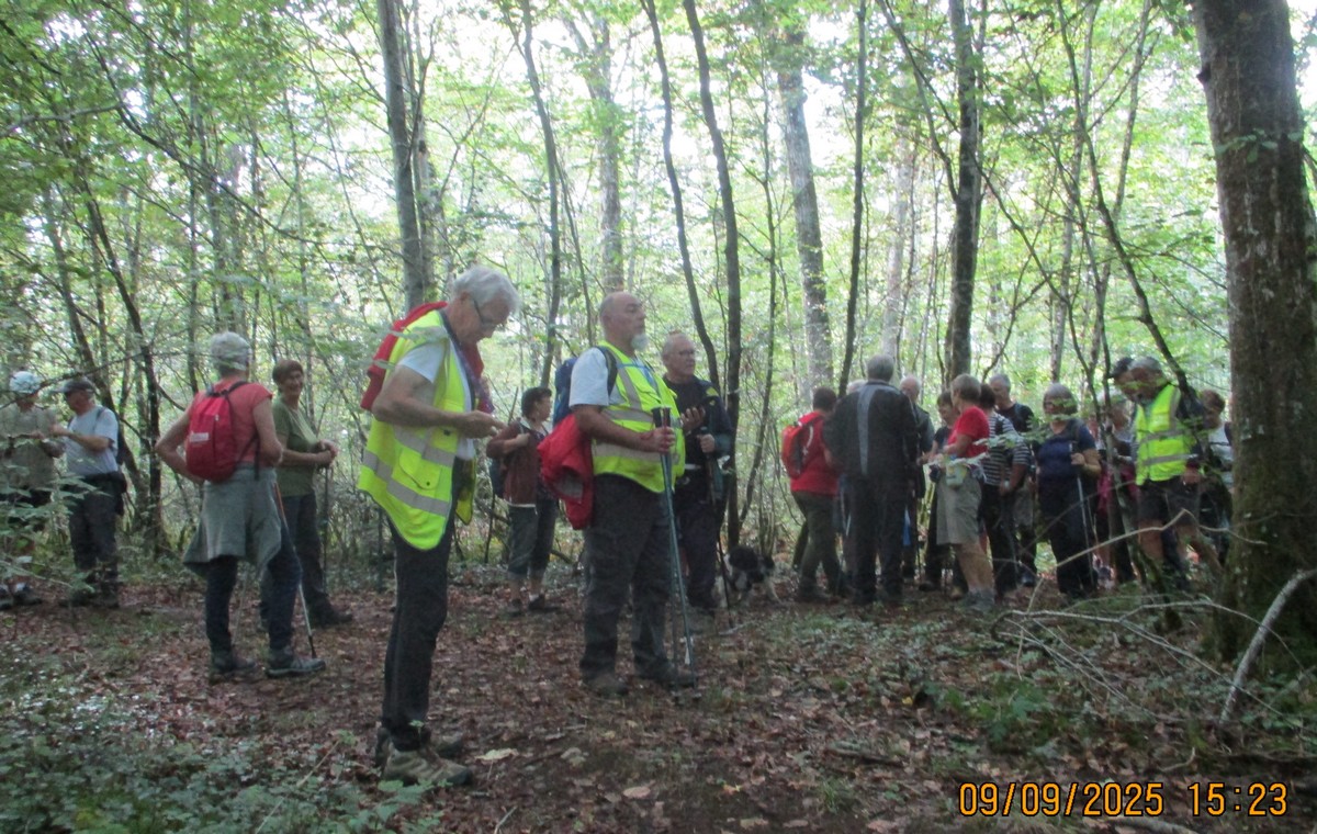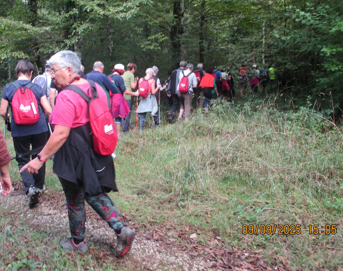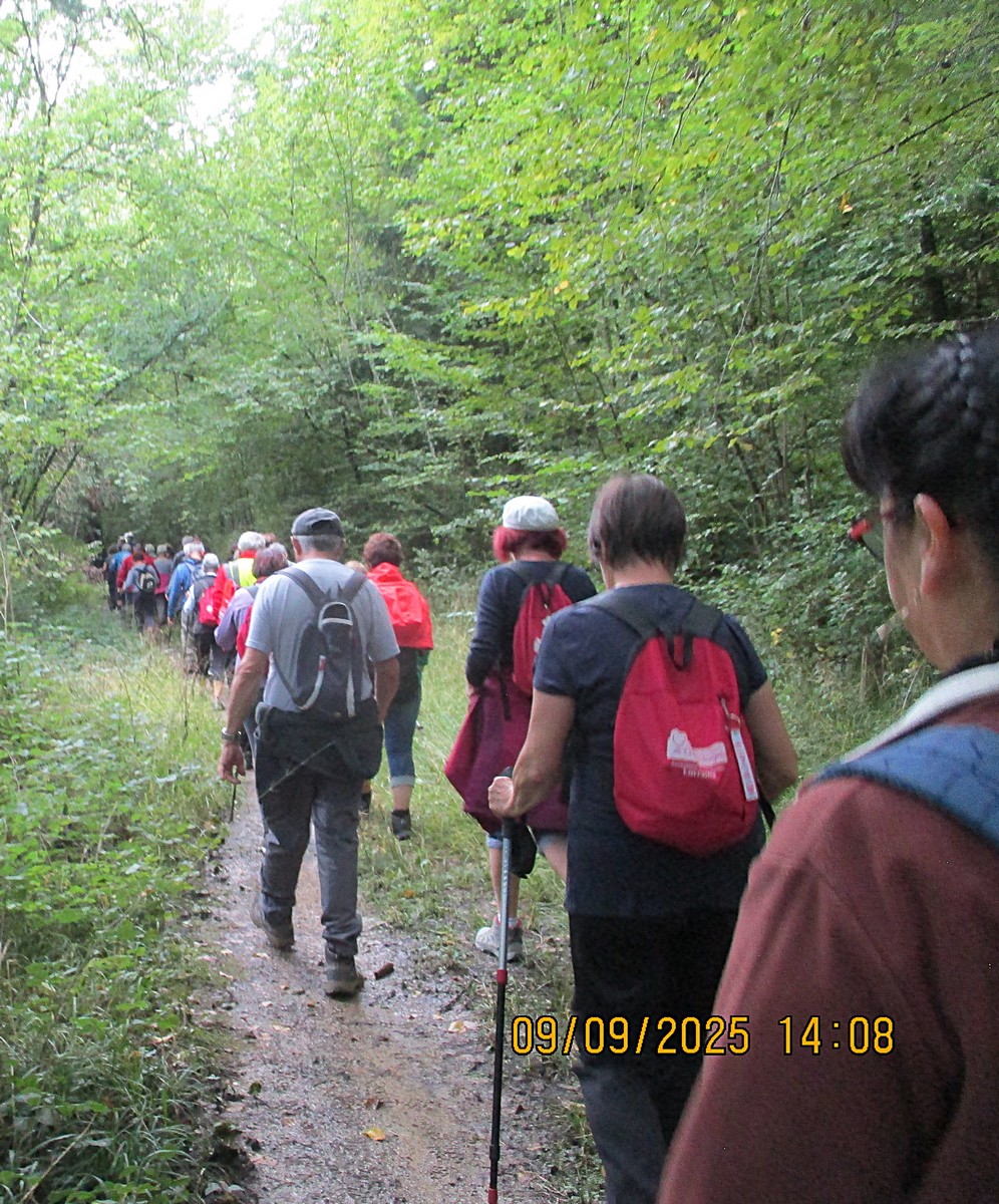 Et nous voici rassemblés sur le parking de la Tuffière à proximité de Rolampont sous un soleil timide, ceci pour démarrer la saison 2025-2026. Et ça : en es-tu fier ? Evidemment !! Nous sommes une bonne trentaine de marcheurs prêts à arpenter la forêt à proximité de la cascade de la Tuffière, bien connue des autochtones. Vu les dernières précipitations tombées récemment, les sentiers sont quelque peu gouillasseux. Chacun discute avec son voisin de ce qu’il a fait pendant ses vacances. Quelquefois, le chef de la meute se trompe de direction, obligeant les premiers de la troupe à se retrouver derniers et retourner jusqu’à prendre le bon chemin ! C’est aussi le temps des champignons et un certain marcheur n’hésite pas à en cueillir pour se faire une bonne poêlée ce soir, n’est-ce pas Daniel ! Par contre, d’autres champignons vus de-ci de-là ne sont beaux qu’à les observer, donc non comestibles. Un arrêt pour la pause encas et pour la photo de groupe traditionnelle et nous voilà reparti jusqu’au site de la cascade qui n’est plus que l’ombre d’elle-même. Cette dernière aurait besoin d’être défrichée pour lui redonner son cachet d’antan. De retour au parking, Violette, la quadrupède de la troupe, rencontre une congénère.