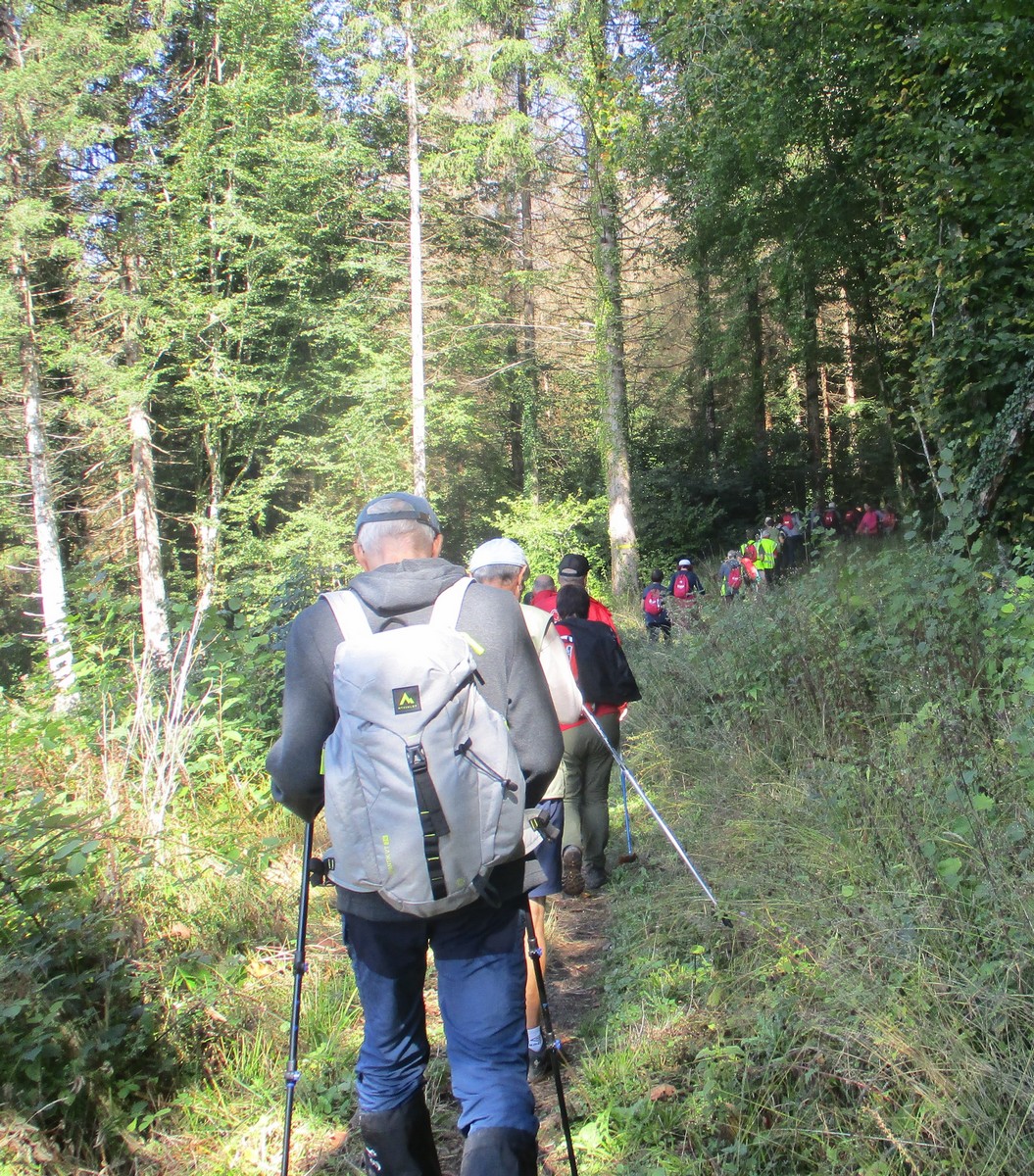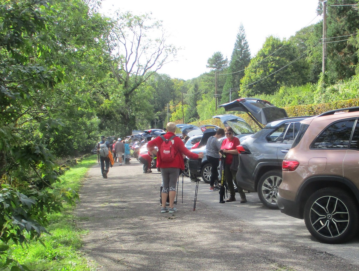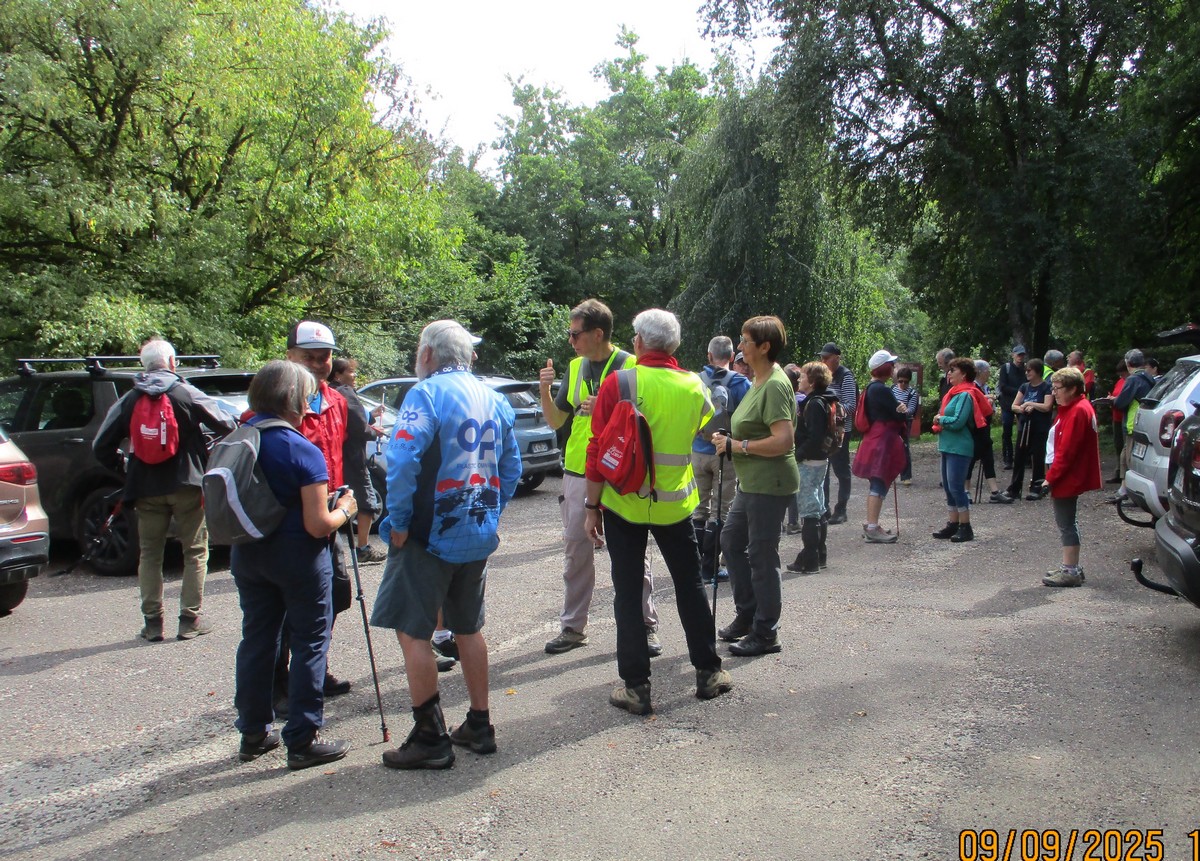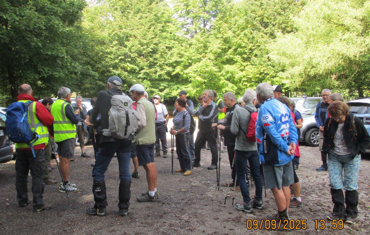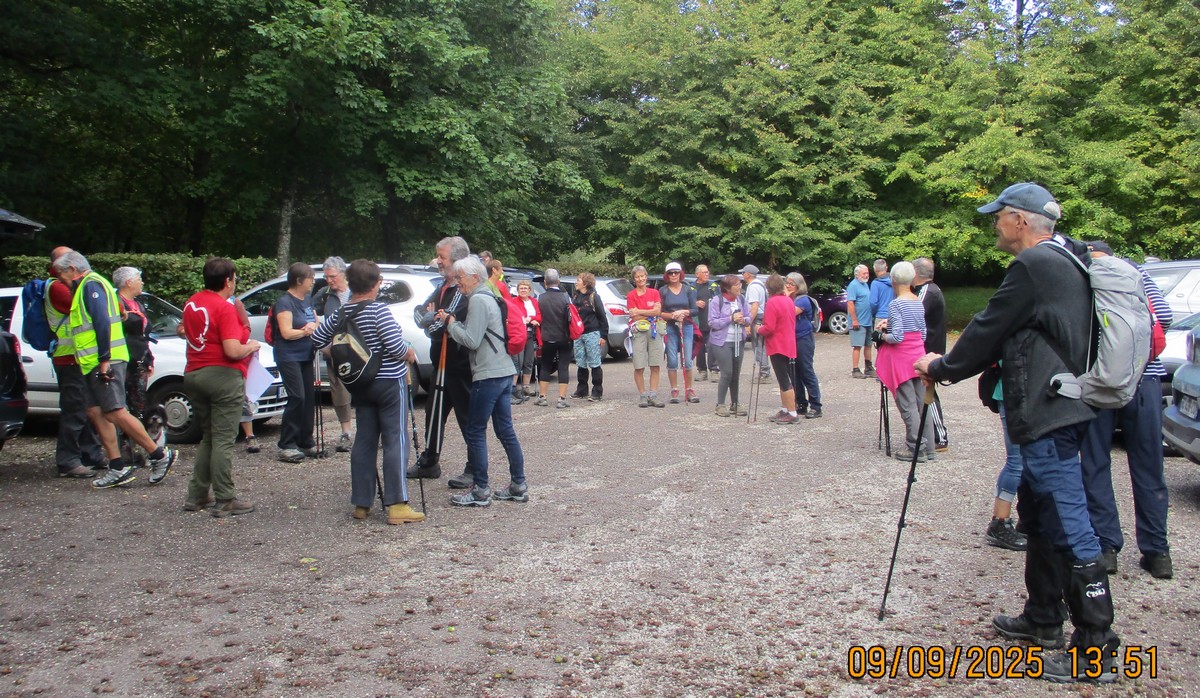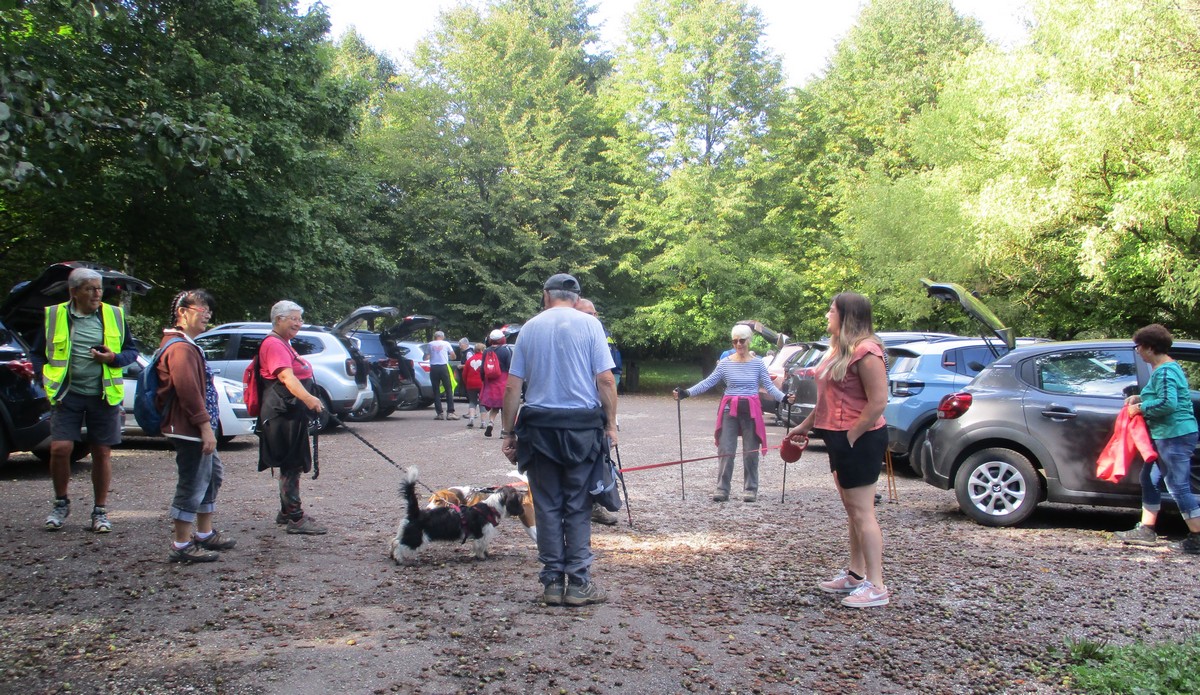 Et nous voici rassemblés sur le parking de la Tuffière à proximité de Rolampont sous un soleil timide, ceci pour démarrer la saison 2025-2026. Et ça : en es-tu fier ? Evidemment !! Nous sommes une bonne trentaine de marcheurs prêts à arpenter la forêt à proximité de la cascade de la Tuffière, bien connue des autochtones. Vu les dernières précipitations tombées récemment, les sentiers sont quelque peu gouillasseux. Chacun discute avec son voisin de ce qu’il a fait pendant ses vacances. Quelquefois, le chef de la meute se trompe de direction, obligeant les premiers de la troupe à se retrouver derniers et retourner jusqu’à prendre le bon chemin ! C’est aussi le temps des champignons et un certain marcheur n’hésite pas à en cueillir pour se faire une bonne poêlée ce soir, n’est-ce pas Daniel ! Par contre, d’autres champignons vus de-ci de-là ne sont beaux qu’à les observer, donc non comestibles. Un arrêt pour la pause encas et pour la photo de groupe traditionnelle et nous voilà reparti jusqu’au site de la cascade qui n’est plus que l’ombre d’elle-même. Cette dernière aurait besoin d’être défrichée pour lui redonner son cachet d’antan. De retour au parking, Violette, la quadrupède de la troupe, rencontre une congénère.