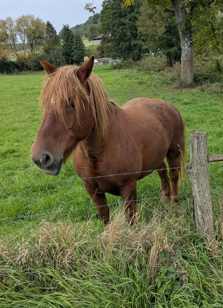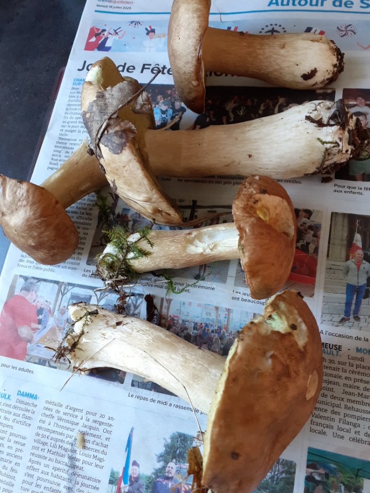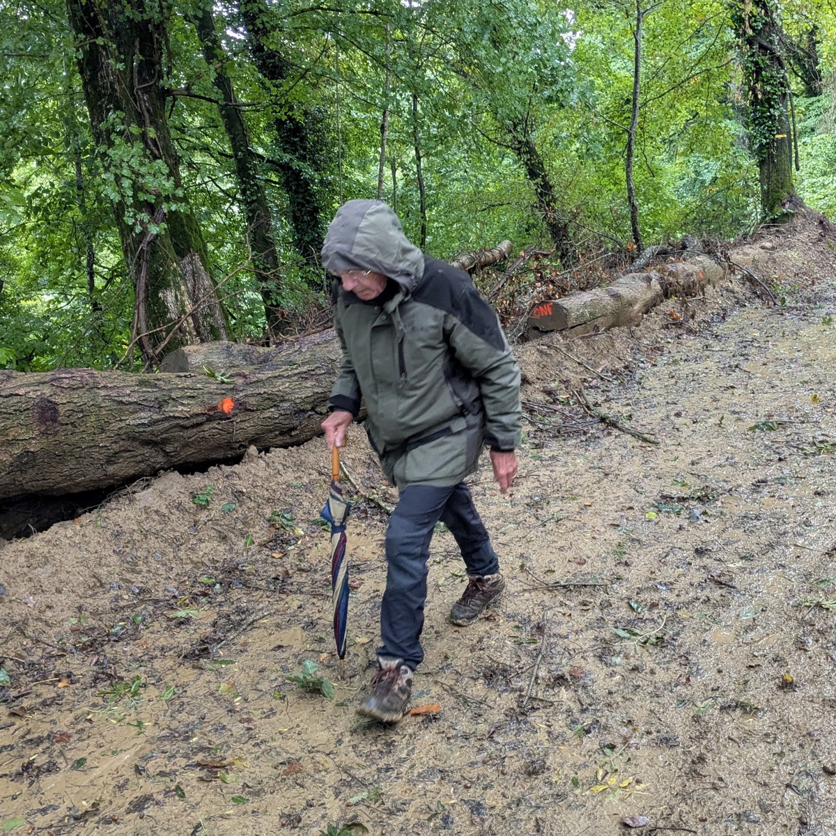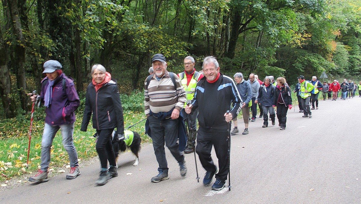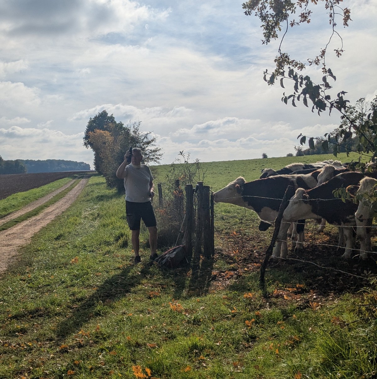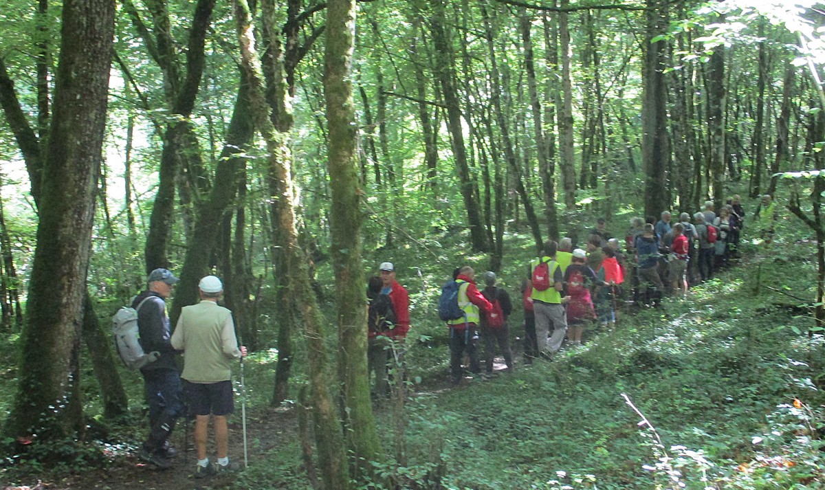 Et nous voici rassemblés sur le parking de la Tuffière à proximité de Rolampont sous un soleil timide, ceci pour démarrer la saison 2025-2026. Et ça : en es-tu fier ? Evidemment !! Nous sommes une bonne trentaine de marcheurs prêts à arpenter la forêt à proximité de la cascade de la Tuffière, bien connue des autochtones. Vu les dernières précipitations tombées récemment, les sentiers sont quelque peu gouillasseux. Chacun discute avec son voisin de ce qu’il a fait pendant ses vacances. Quelquefois, le chef de la meute se trompe de direction, obligeant les premiers de la troupe à se retrouver derniers et retourner jusqu’à prendre le bon chemin ! C’est aussi le temps des champignons et un certain marcheur n’hésite pas à en cueillir pour se faire une bonne poêlée ce soir, n’est-ce pas Daniel ! Par contre, d’autres champignons vus de-ci de-là ne sont beaux qu’à les observer, donc non comestibles. Un arrêt pour la pause encas et pour la photo de groupe traditionnelle et nous voilà reparti jusqu’au site de la cascade qui n’est plus que l’ombre d’elle-même. Cette dernière aurait besoin d’être défrichée pour lui redonner son cachet d’antan. De retour au parking, Violette, la quadrupède de la troupe, rencontre une congénère.