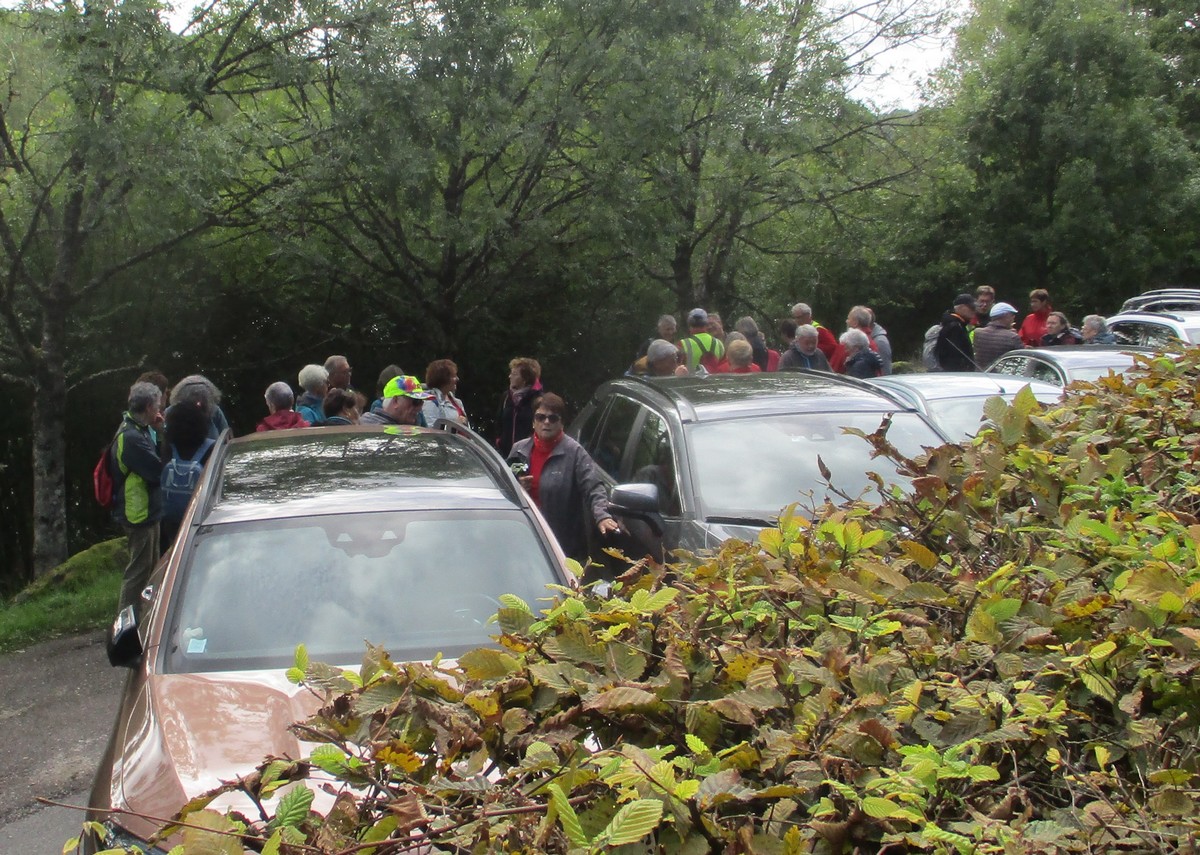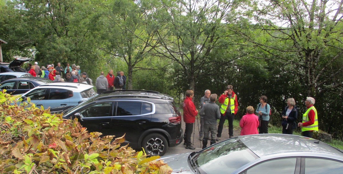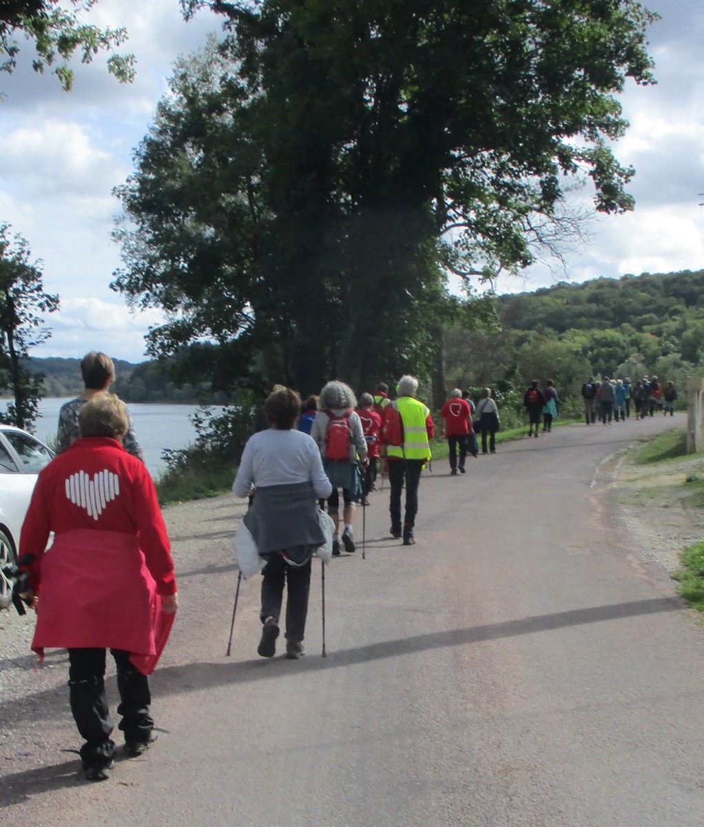 Ce mardi, nous avons de la chance : il ne pleut pas et le soleil brille entrecoupé par quelques passages nuageux. Temps idéal pour la presque quarantaine de marcheurs venus à 5-6-R-gué ! Quelques nouvelles et nouveau inscrits nous ont rejoints pour effectuer ce petit parcours de rentrée, nous leurs souhaitons la bienvenue. Nous commençons par longer le lac sur la route de Morgon, puis monter sur les hauteurs le long des « Côtes Marpeaux » où nous pouvons remarquer les roches et petites grottes surplombant le lac. Sur le chemin, un bébé couleuvre essaie de se frayer un chemin. De retour au village, nous le traversons en admirant au passage la petite table de jardin toujours dressée (avec sa bouteille … vide ou pleine ?) et qui attend qu’on s’y assoie. Nous descendons du côté de l’ancien moulin où nous nous arrêtons pour la mi-temps et en même temps pour la photo de groupe. Nous repartons ensuite sur l’autre versant de la vallée de la Mouche afin de retrouver la route qui mène à la digue, laquelle nous traversons en regardant d’un côté le lac et de l’autre les travaux de consolidation effectués récemment. Encore quelques centaines de mètres et nous voici revenus à notre point de départ où nos carrosses nous attendent.