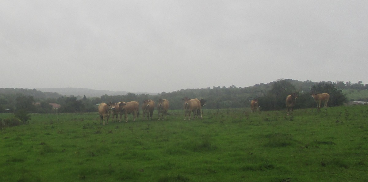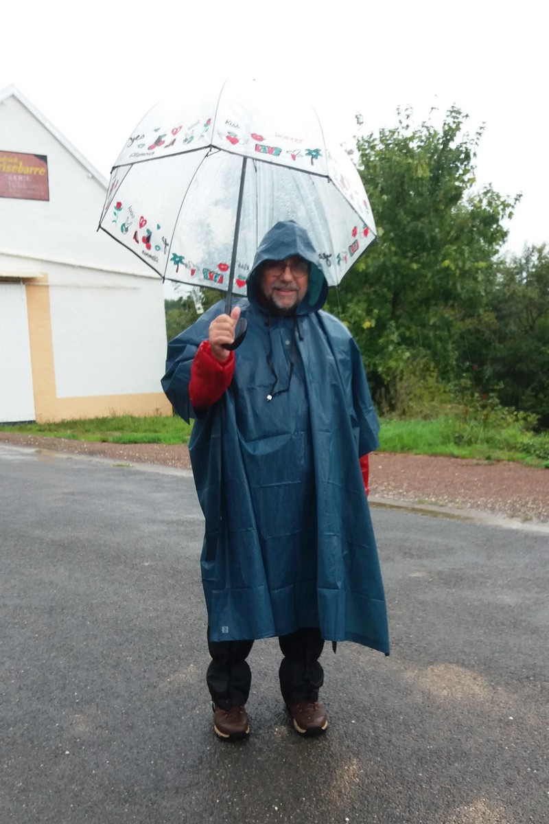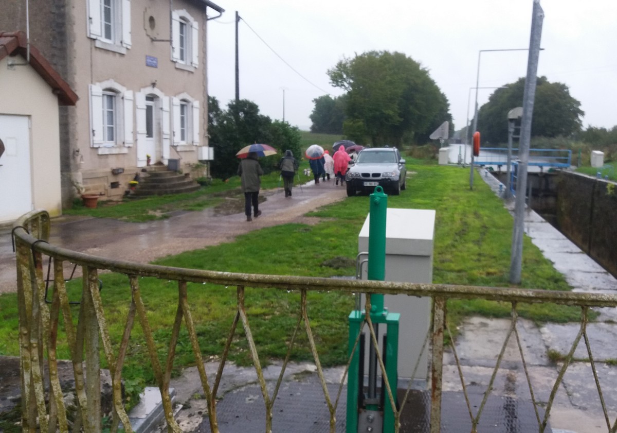 Alors comment dire : aujourd’hui, 2ème jour de l’automne, le temps est pluvieux à volonté. En effet, la pluie n’a pas cessé de tomber tout au long du parcours de 6,6 kms. L’eau ruisselait sur les chemins. Evidemment, nous avions revêtu le kway de rigueur pour certains et pris le parapluie pour les autres, mais tout cela n’aura pas suffi à nous protéger entièrement : on étaient gaugés ! Nous étions quand même une petite vingtaine de courageux marcheurs à faire le déplacement à Choilley-Dardenay et parmi eux des petits nouveaux. Bernard ne nous a pas choyés pour le coup ! L’appareil-photo prend l’eau, alors les portables feront le reste. Nous admirons un champ de cucurbitacées prêtes à fêter Halloween. Un troupeau de vaches nous regarde passer. Nous nous arrêtons quelques instants devant l’école de Dardenay transformée en musée ; cela n’a pas empêché madame presse de jouer à la marelle. Nous suivons le canal par le chemin de Halage jusqu’à retrouver l’entrée de Choilley où là, nous nous dépêchons de retourner à nos voitures pour se retrouver « au sec ».