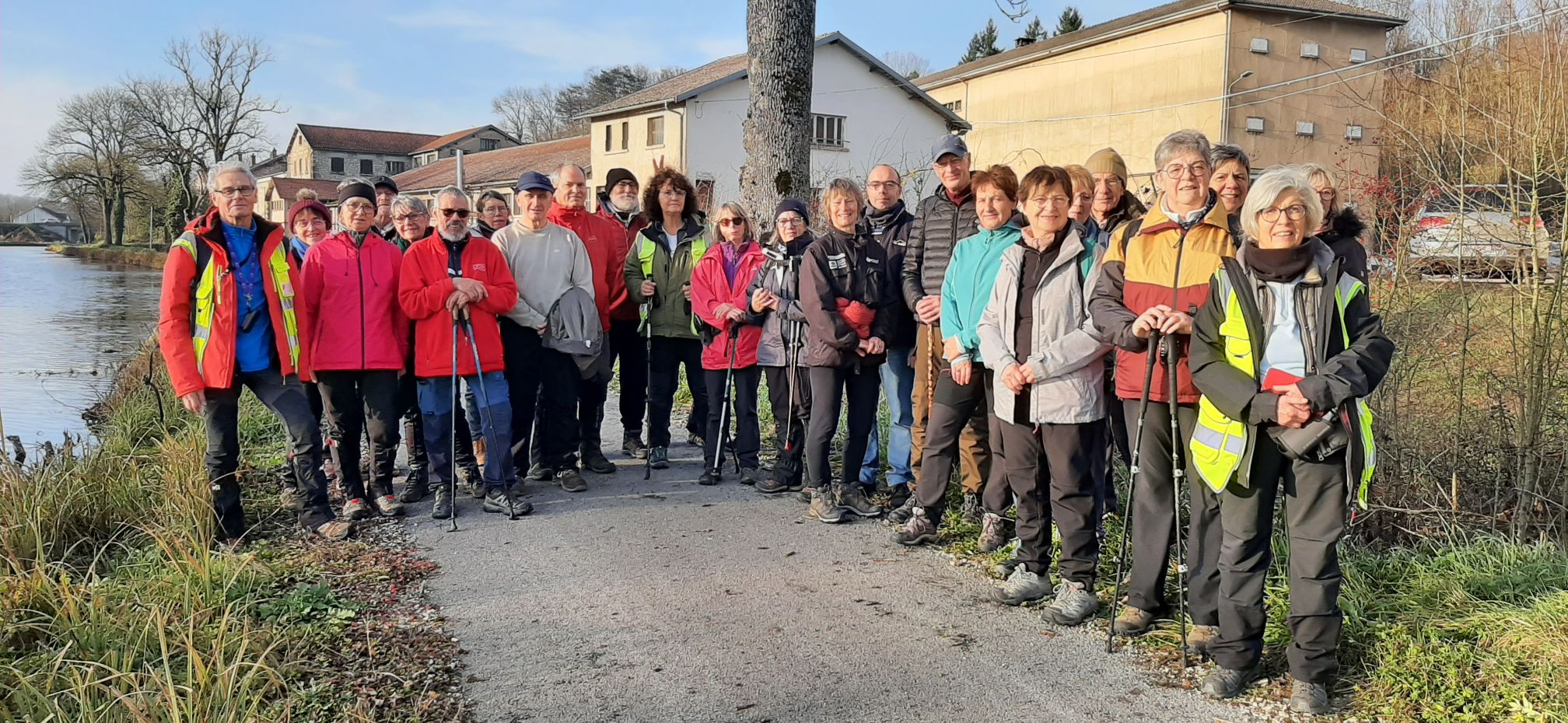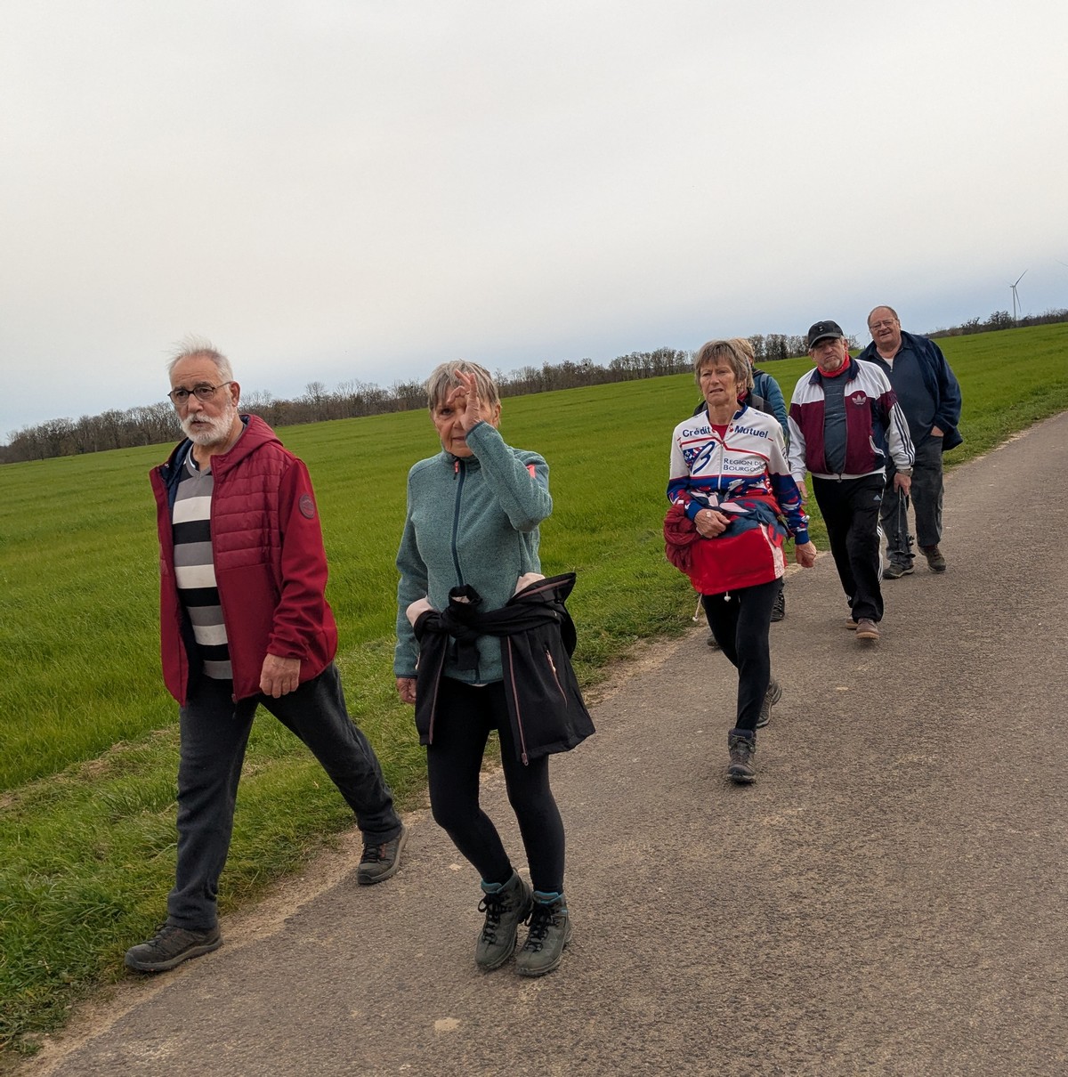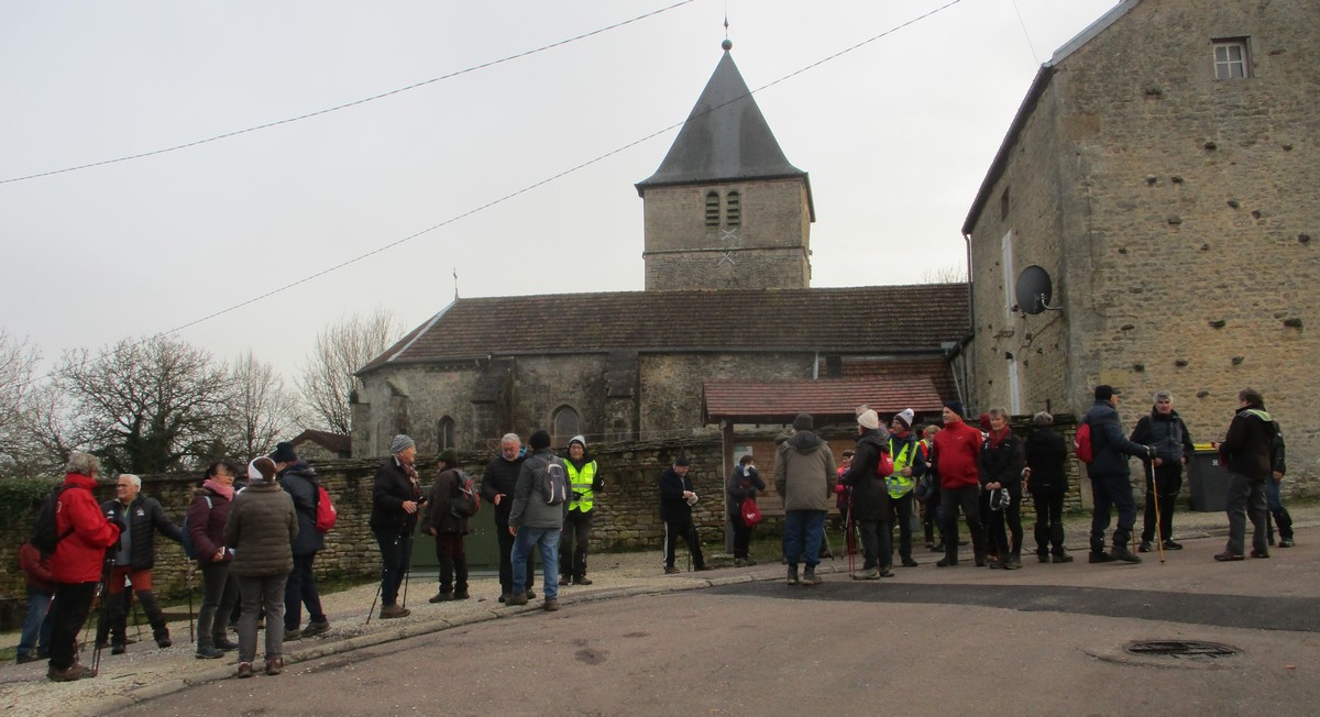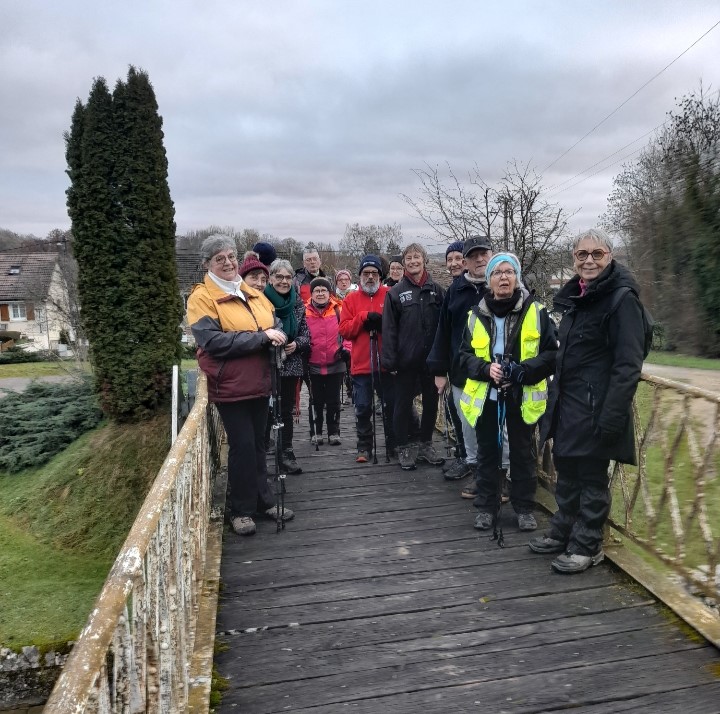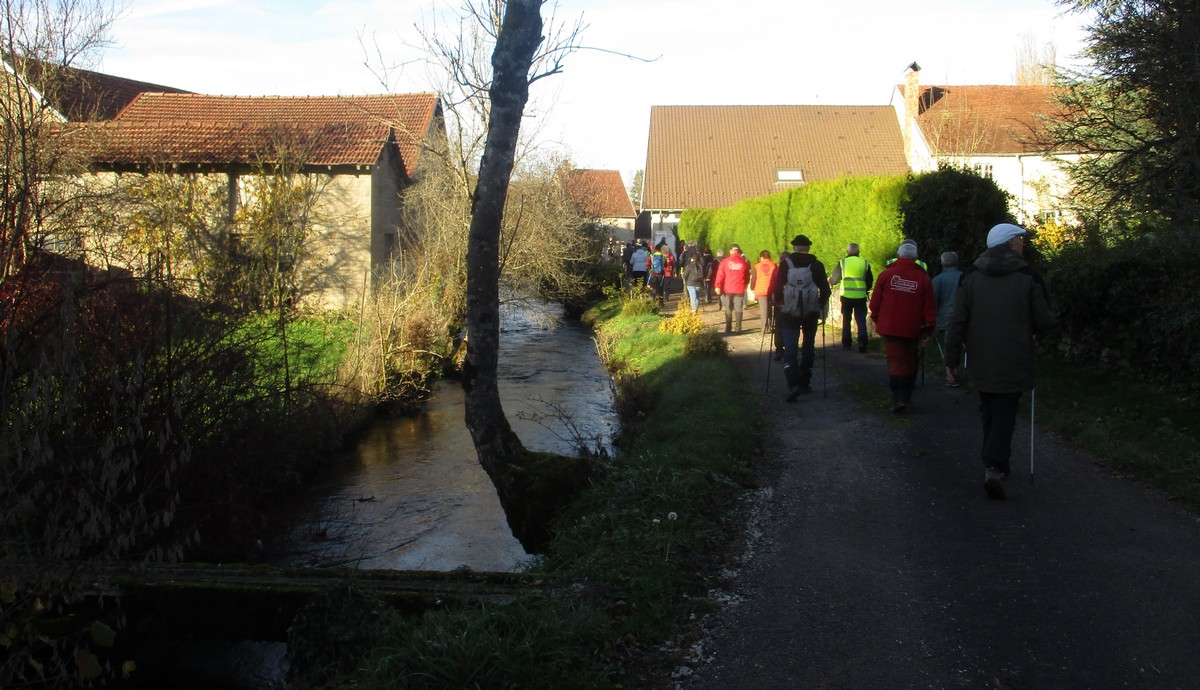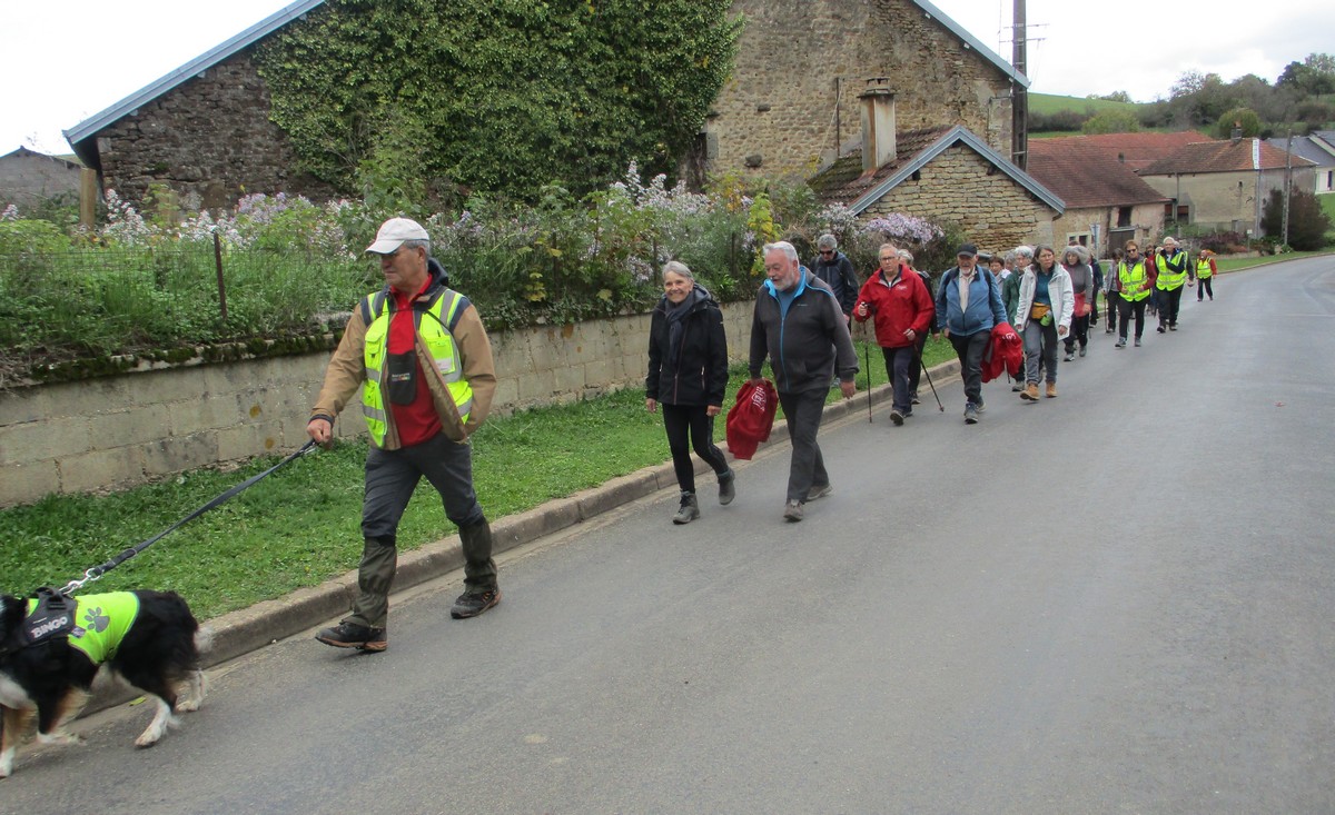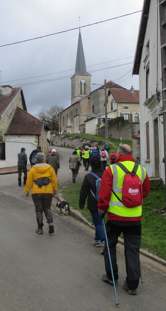 Il y a des semaines qui se suivent, mais qui ne se ressemblent pas ! En effet, ce mardi : beau temps contrastant avec celui de la semaine dernière à Choilley. Beaucoup ont fait le déplacement jusqu’au village de Vesaignes qui se trouve situé en périphérie de notre rayon d’action ; nous sommes une petite quarantaine. Tout d’abord une bonne côte (pas de bœuf) pour faire marcher le cardio. Nous voilà sur le plateau et on commence à enlever les vestes et polaires qui tiennent chaud. Quelques flaques d’eau subsistent encore des dernières pluies tombées, mais pas assez pour gouillasser nos chaussures. Nous descendons alors le coteau pour traverser Thivet où on a même vu des ours en bois, un chien sur un toit et une fresque dans un abri-bus. Ensuite, nous sortons du village pour rejoindre le canal où nous posons pour la photo traditionnelle. La partie restante du parcours est des plus reposantes puisque l’on suit le canal jusqu’à retrouver Vesaignes et rejoindre nos voitures devant la Mairie et L’Eglise.