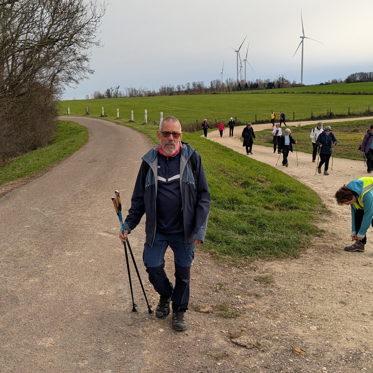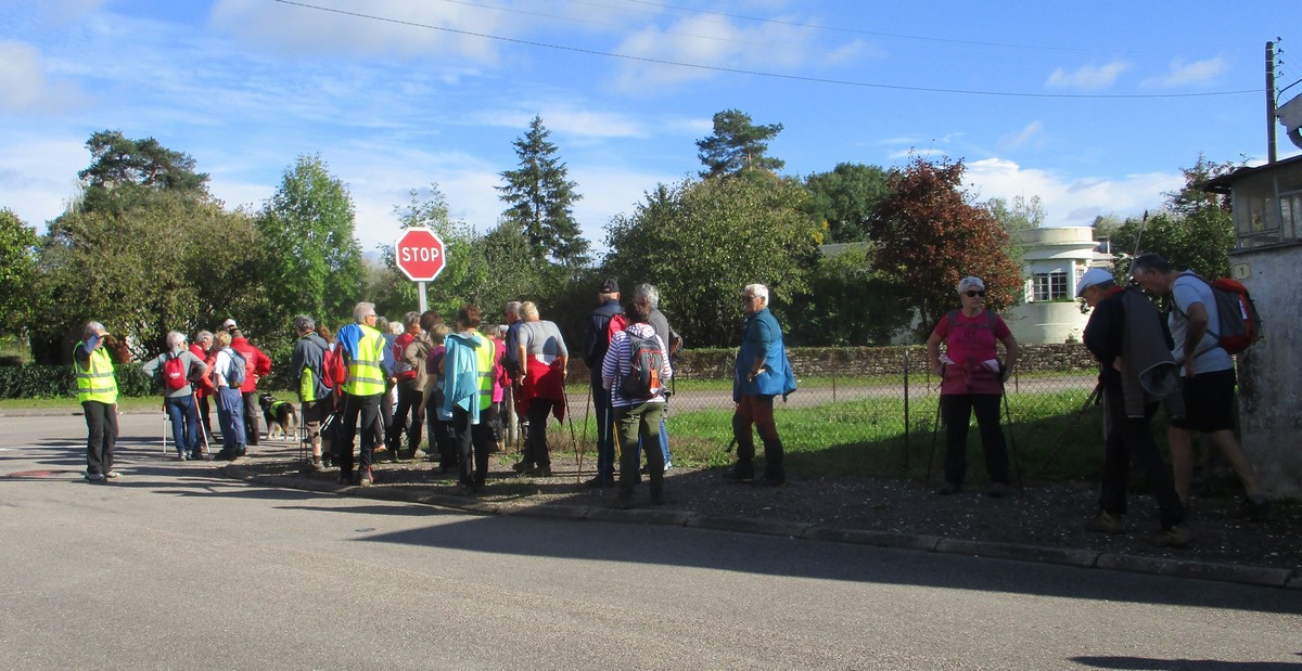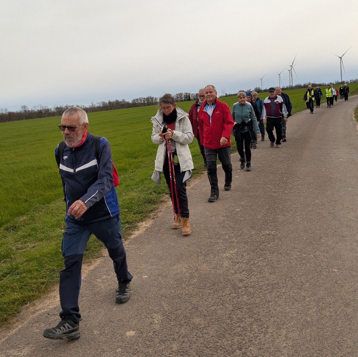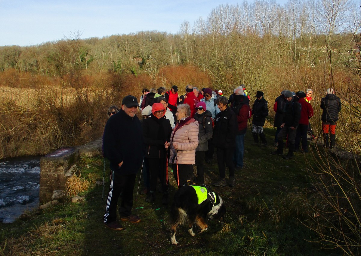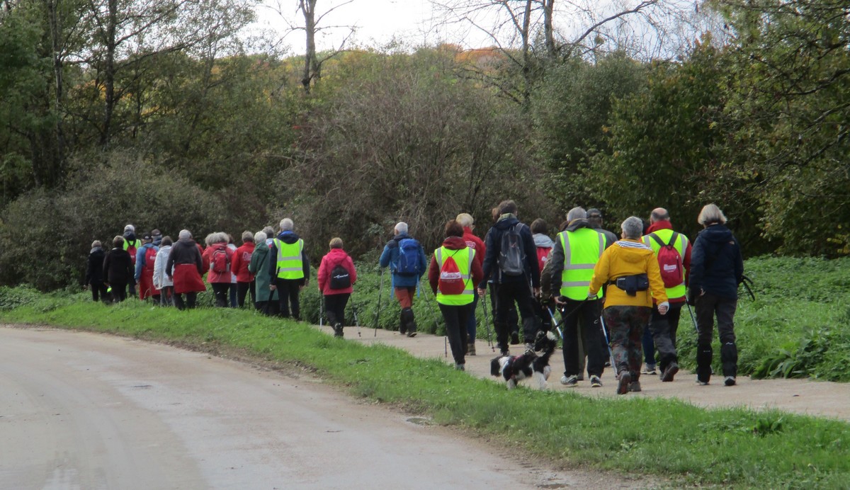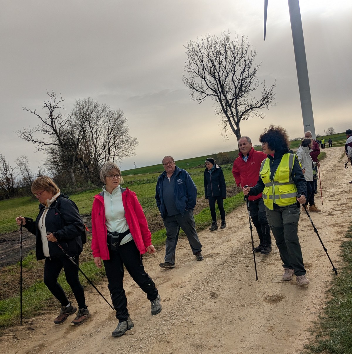 Il y a des semaines qui se suivent, mais qui ne se ressemblent pas ! En effet, ce mardi : beau temps contrastant avec celui de la semaine dernière à Choilley. Beaucoup ont fait le déplacement jusqu’au village de Vesaignes qui se trouve situé en périphérie de notre rayon d’action ; nous sommes une petite quarantaine. Tout d’abord une bonne côte (pas de bœuf) pour faire marcher le cardio. Nous voilà sur le plateau et on commence à enlever les vestes et polaires qui tiennent chaud. Quelques flaques d’eau subsistent encore des dernières pluies tombées, mais pas assez pour gouillasser nos chaussures. Nous descendons alors le coteau pour traverser Thivet où on a même vu des ours en bois, un chien sur un toit et une fresque dans un abri-bus. Ensuite, nous sortons du village pour rejoindre le canal où nous posons pour la photo traditionnelle. La partie restante du parcours est des plus reposantes puisque l’on suit le canal jusqu’à retrouver Vesaignes et rejoindre nos voitures devant la Mairie et L’Eglise.