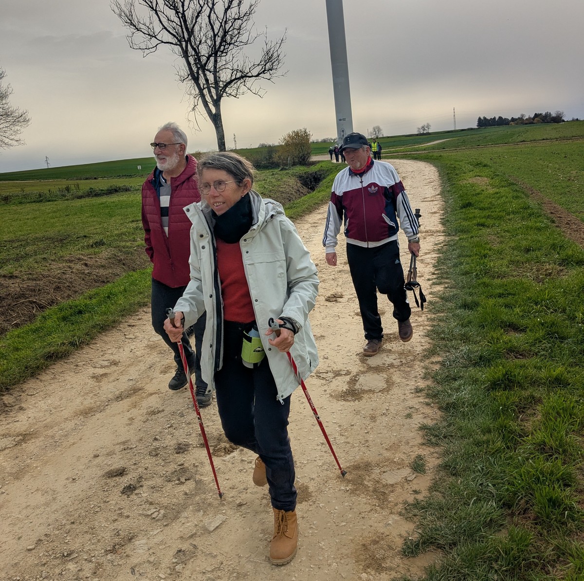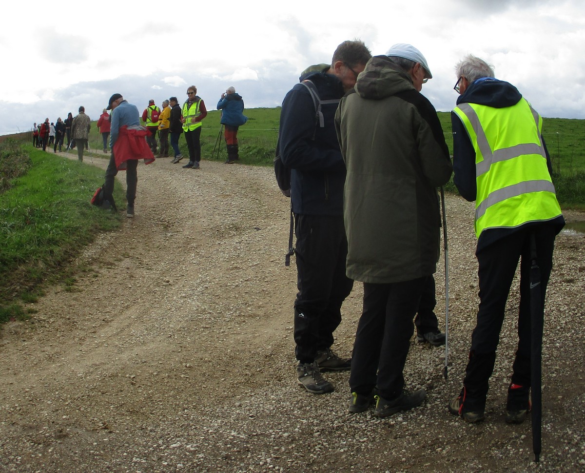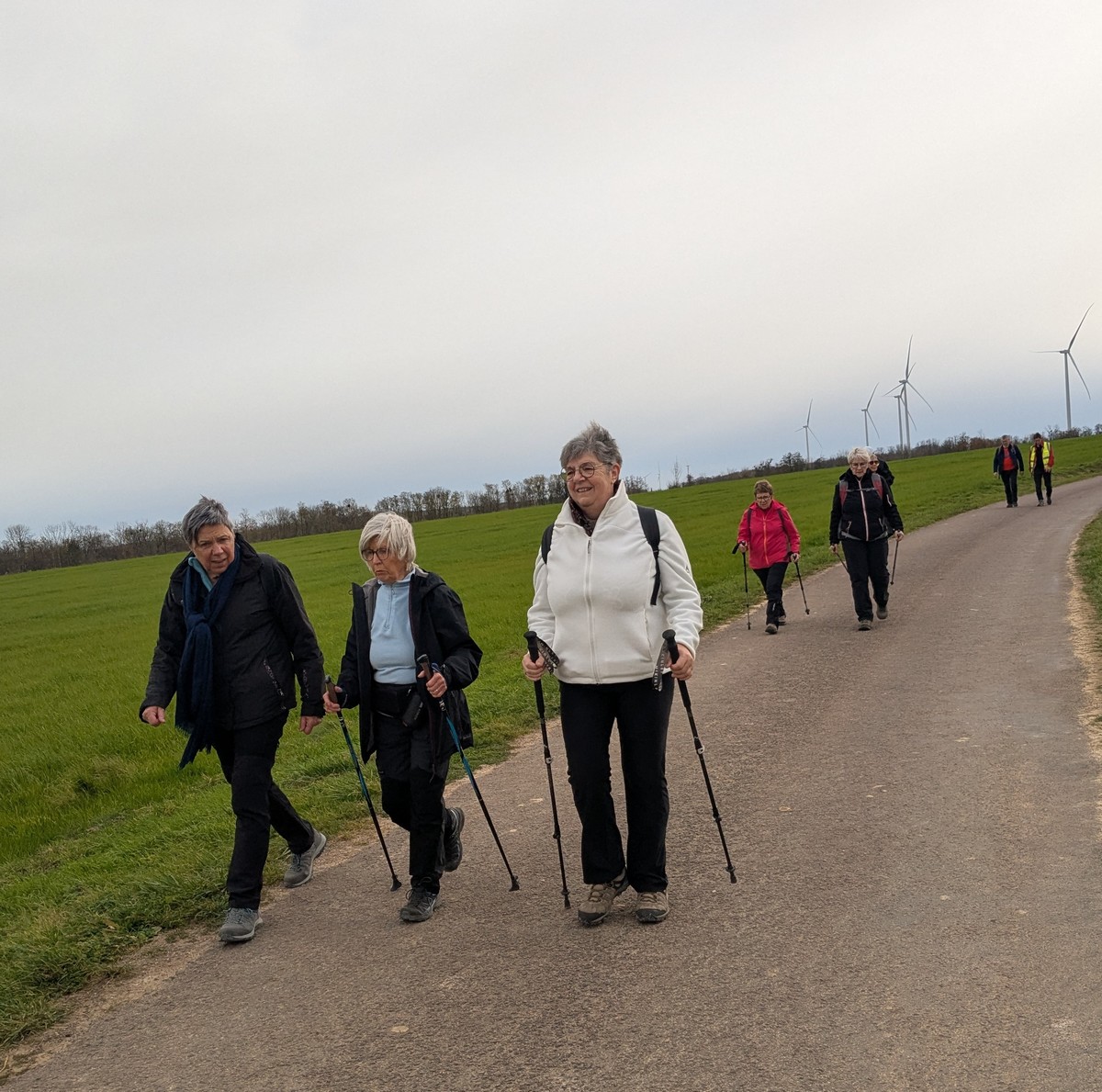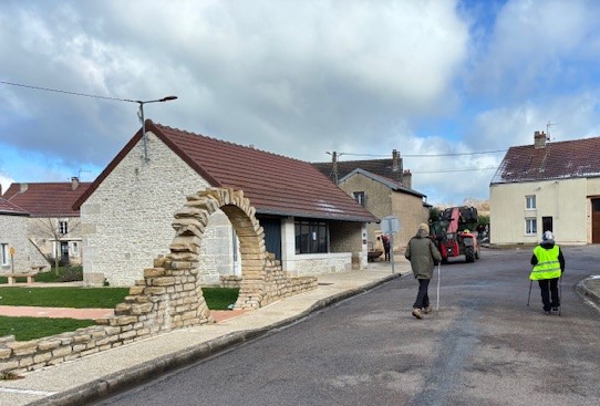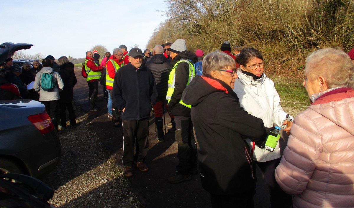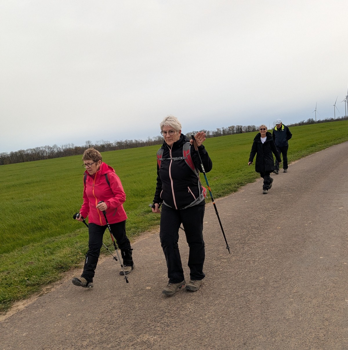 Il y a des semaines qui se suivent, mais qui ne se ressemblent pas ! En effet, ce mardi : beau temps contrastant avec celui de la semaine dernière à Choilley. Beaucoup ont fait le déplacement jusqu’au village de Vesaignes qui se trouve situé en périphérie de notre rayon d’action ; nous sommes une petite quarantaine. Tout d’abord une bonne côte (pas de bœuf) pour faire marcher le cardio. Nous voilà sur le plateau et on commence à enlever les vestes et polaires qui tiennent chaud. Quelques flaques d’eau subsistent encore des dernières pluies tombées, mais pas assez pour gouillasser nos chaussures. Nous descendons alors le coteau pour traverser Thivet où on a même vu des ours en bois, un chien sur un toit et une fresque dans un abri-bus. Ensuite, nous sortons du village pour rejoindre le canal où nous posons pour la photo traditionnelle. La partie restante du parcours est des plus reposantes puisque l’on suit le canal jusqu’à retrouver Vesaignes et rejoindre nos voitures devant la Mairie et L’Eglise.