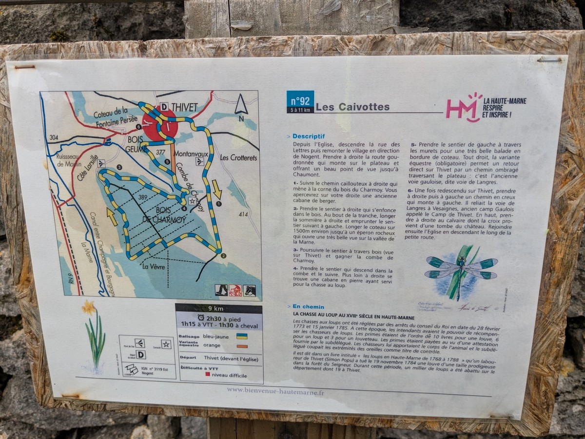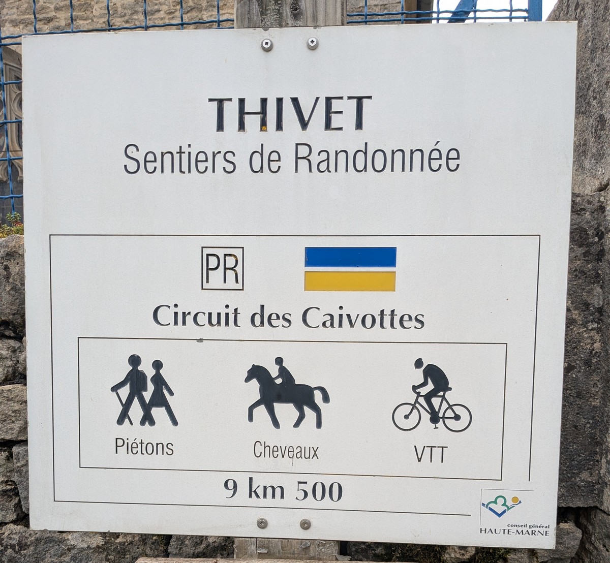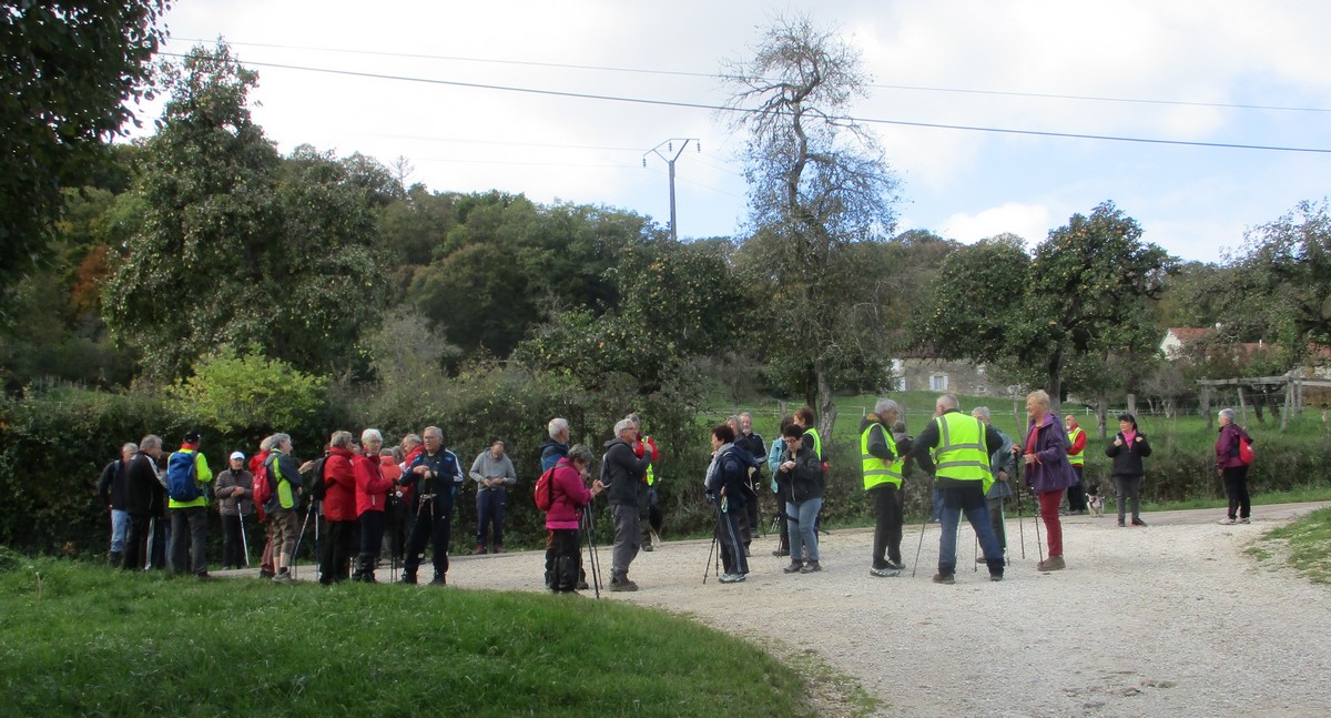 Départ de la salle des fêtes de THIVET pour la vingtaine et demie de marcheurs venus malgré un temps automnal. Nous attaquons fort par une bonne grimpette afin de faire travailler le cardio ; il fallait être mo-Thivet pour cela. Nous rejoignons un sentier dans les bois ; ensuite, un petit détour s’impose de façon à faire découvrir les Caivottes (cabanes en pierres), merci Jean Luc. Puis nous marchons sur le plateau, traversons le village, entamons la descente jusqu’à Vesaignes. Là, nous suivons le canal pour revenir à notre point de départ et retrouver nos voitures.