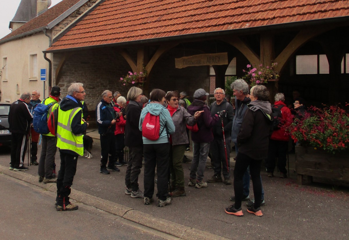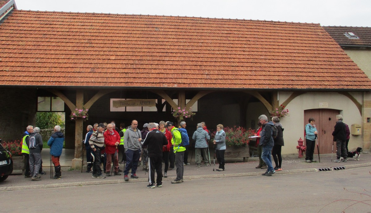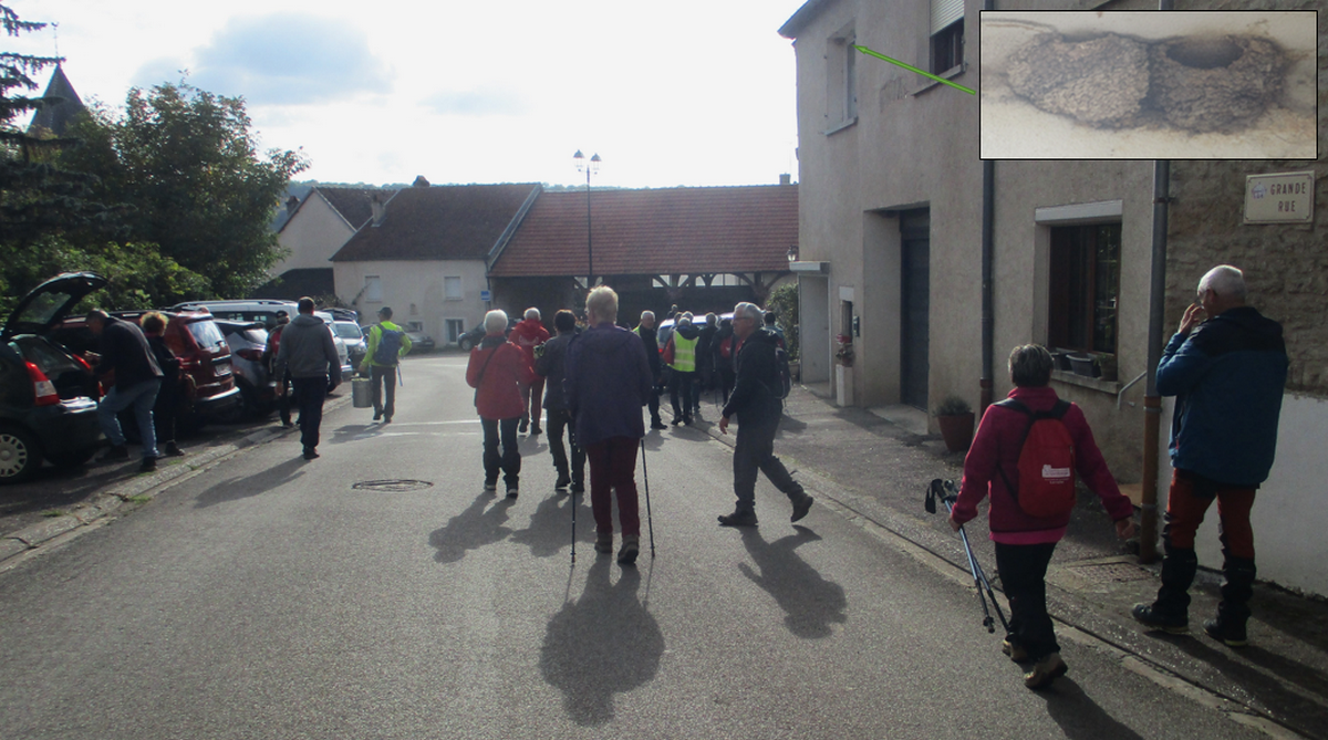 Avant Aprey, c’était Chalindrey. Après Aprey, est-ce que tu le sais ? : ce sera Lecey. Mais après tout, restons à Aprey pour ce mardi, après tous ces jeux de mots donnant des maux de tête… Aujourd’hui, nous sommes une quarantaine et demie à s’être rassemblés devant la « Halle » où trône toujours sa magnifique échelle aux 39 échelons. Le temps est meilleur que l’an dernier, mais pas des plus ensoleillés au départ de notre marche. Pour débuter, pourquoi ne pas attaquer par une bonne montée tout en traversant le village jusqu’à la croix des roches. On souffle un peu et on repart jusqu’au hameau de « Ville-Haut » où quelques belles demeures sont superbement restaurées. Un passage devant les linteaux aux pieds de biche (ou autres cervidés) attirent notre attention. A la sortie, nous entamons la montée d’un sentier où les premières feuilles tombées de l’automne jonchent le sol et qui nous amènent sur une clairière pour y faire la pause. Et qui dit pause dit pose, alors posons-nous pour la photo de groupe. De là, nous redescendons en direction de Ville-Bas par un petit chemin bucolique où il nous faut éviter quelques bouses et « gouillasses ». Une fois arrivés sur la route, nous traversons le petit hameau pour découvrir les beaux jardins où fleurs et légumes d’automne ont fière allure. Nous finissons notre périple sous un soleil timide accompagnés du regard de quelques bovidés. Arrivés au village, nous passons à côté de la porte aux éléphants (ou aux mammouths diront certains) et remarquons également des nids d’oiseaux flanqués sur portes et fenêtres.