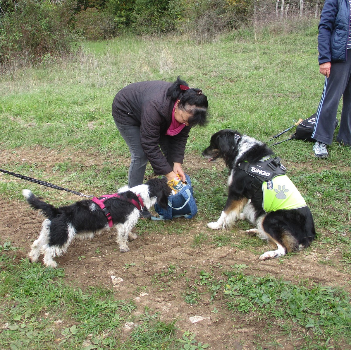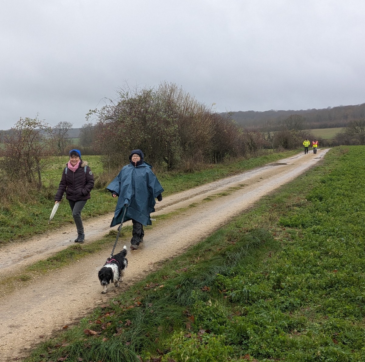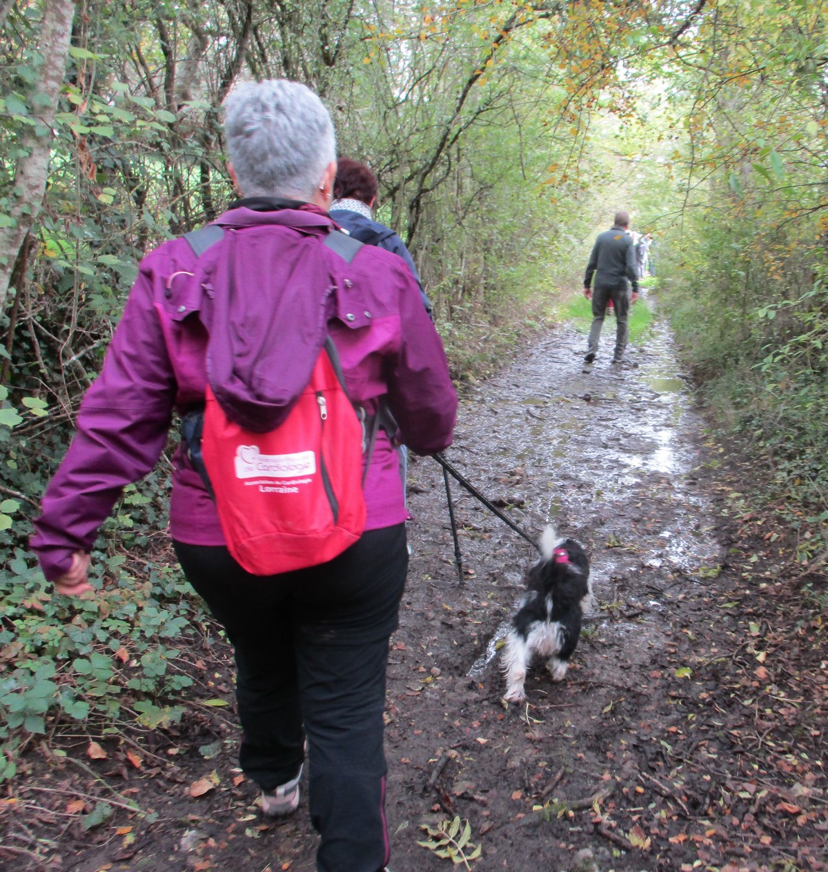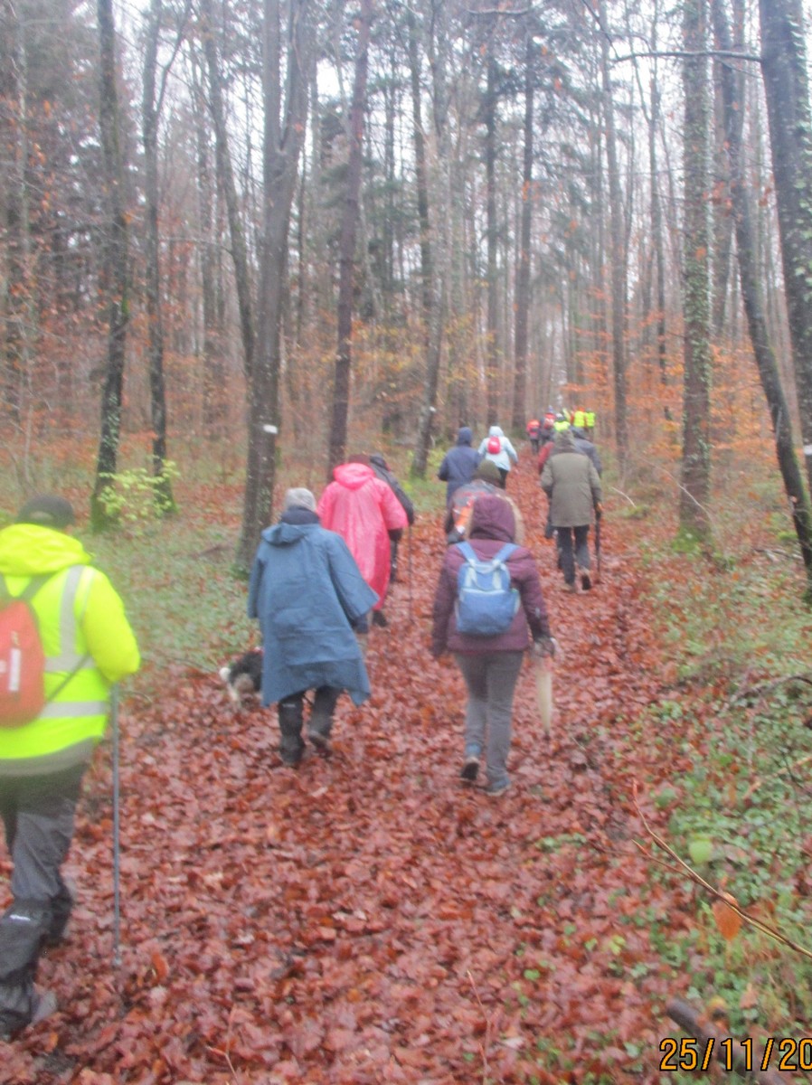 Un vrai temps de Sainte Catherine ! En ce 25 novembre, les Dieux de la pluie étaient de sortie ! Mais nous étions quand même une petite trentaine en comptant les quadrupèdes. Mais il en manquait une à l’appel : c’est « Nenette », la petite chienne locale, laquelle nous accompagne durant une partie du chemin. Mais je ne voulais surtout pas manquer de souhaiter la fête à notre Catherine, ce que Nelly a réussi à immortaliser sur la pellicule. Donc parapluies et k-ways étaient de rigueur pour entamer cette marche de plus de 6kms. Nous avons d’abord parcouru la plaine jusqu’à atteindre la forêt domaniale d’Ormancey. Nous avons ensuite traversé le bois en empruntant la route des closiers. Une petite pensée pour Marcel en passant à proximité de la « Route Forestière du 7 avril ». Avant de quitter la route et de nous engouffrer dans une tranche : arrêt photo obligatoire. Il nous fallait marcher prudemment en faisant attention aux feuilles mortes qui rendaient le terrain glissant par endroits. Une fois sorti du bois, nous sommes rentrés alors au village ; certains d’entre nous scrutaient les abords du chemin à la recherche de doucette. Et qu’avons-nous vu en arrivant vers nos voitures : Nenette qui venait nous dire bonjour !