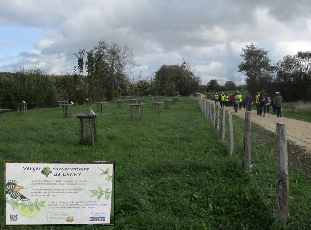 Aprey le A et le B, c’est Lecey, on le sait bien ! Alors aujourd’hui, nous étions moins nombreux que la semaine dernière : une bonne trentaine, ceci à cause du temps maussade menaçant. Mais il n’en a rien été, nous avons échappé à la pluie. C’est même un rayon de soleil qui nous accompagne au départ de cette marche de 6,6 kms décomposée en deux boucles. La première sur route et chemin stabilisé nous fait passer à proximité du verger conservatoire composé de jeunes arbres fruitiers produisant des variétés anciennes. Nous continuons, regardons au loin la petite chapelle N.D. des victoires, avant de retourner au centre du village où nous attaquons la deuxième boucle par une côte qui contourne l’Eglise et son cimetière et qui nous emmène sur les hauteurs. Là, nous décidons de faire la photo de groupe, non sans avoir subi quelques problèmes de mise au point de l’appareil photo, lequel a continué à photographier de « travers ». Mais qu’importe, j’ai réussi à rapporter quelques clichés légèrement distordus ! A un moment, les gps n’étaient pas d’accord sur le parcours à suivre. Quelques chemins gouillasseux ont réussi à salir nos croqueneaux. Nous passons à proximité de la pointe du Lac de la Liez. Nous remarquons un troupeau ovin puis plus loin un autre troupeau bovin celui-là dont un des petits veaux tétait encore sa mère. Nous terminons tranquillement notre périple jusqu’au village en traversant un lotissement jusqu’à retrouver nos voitures sur le parking de la salle des fêtes.
