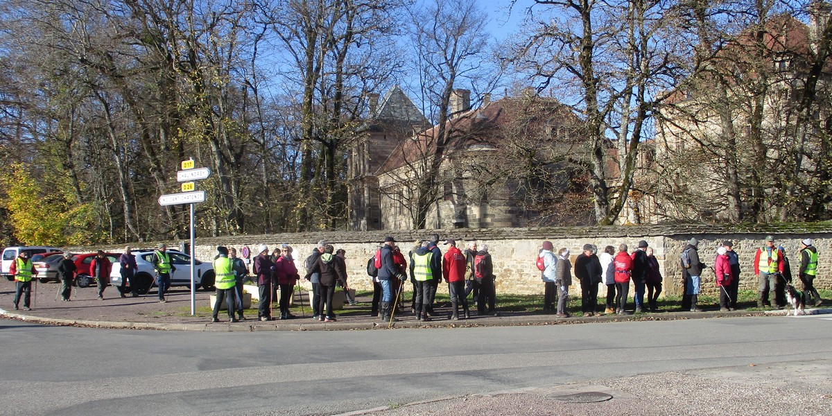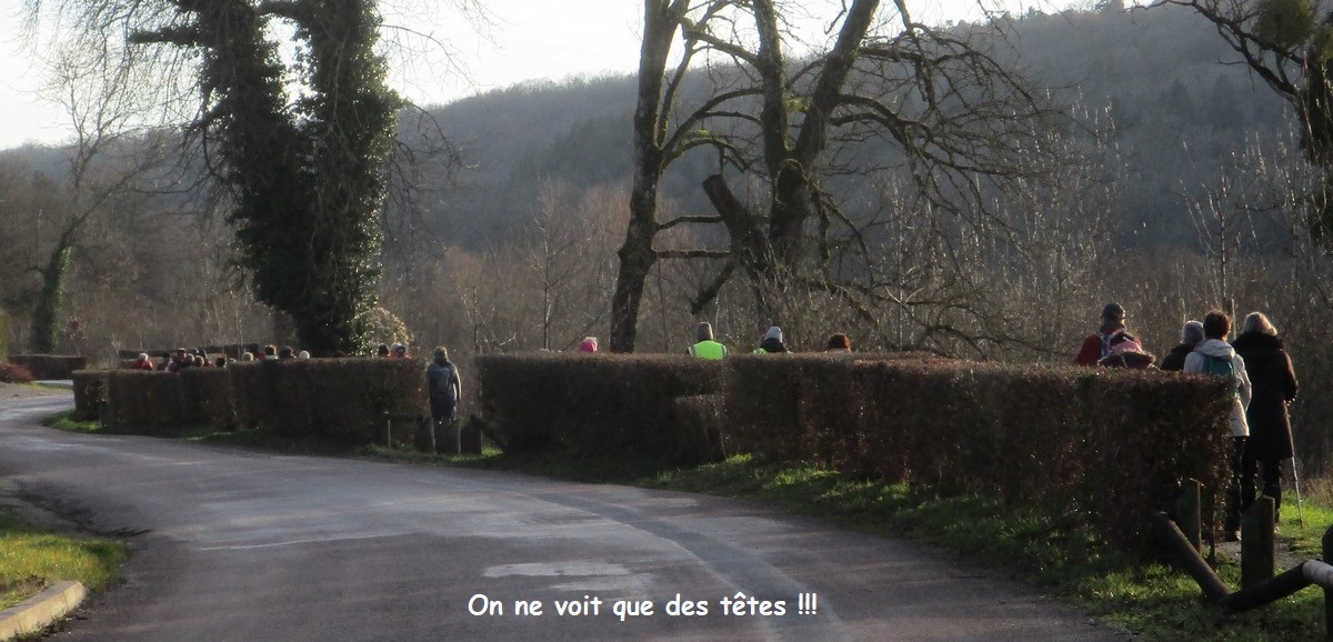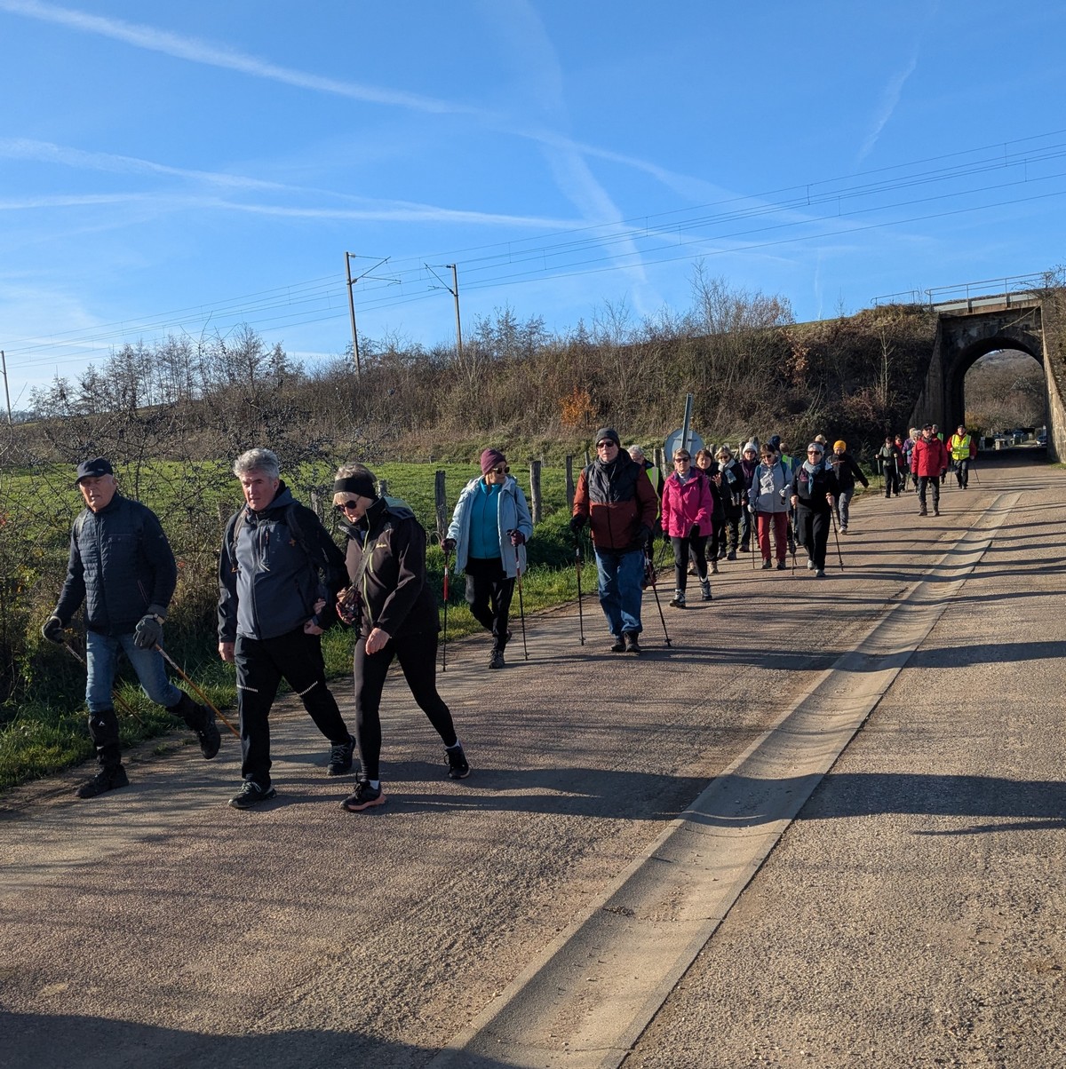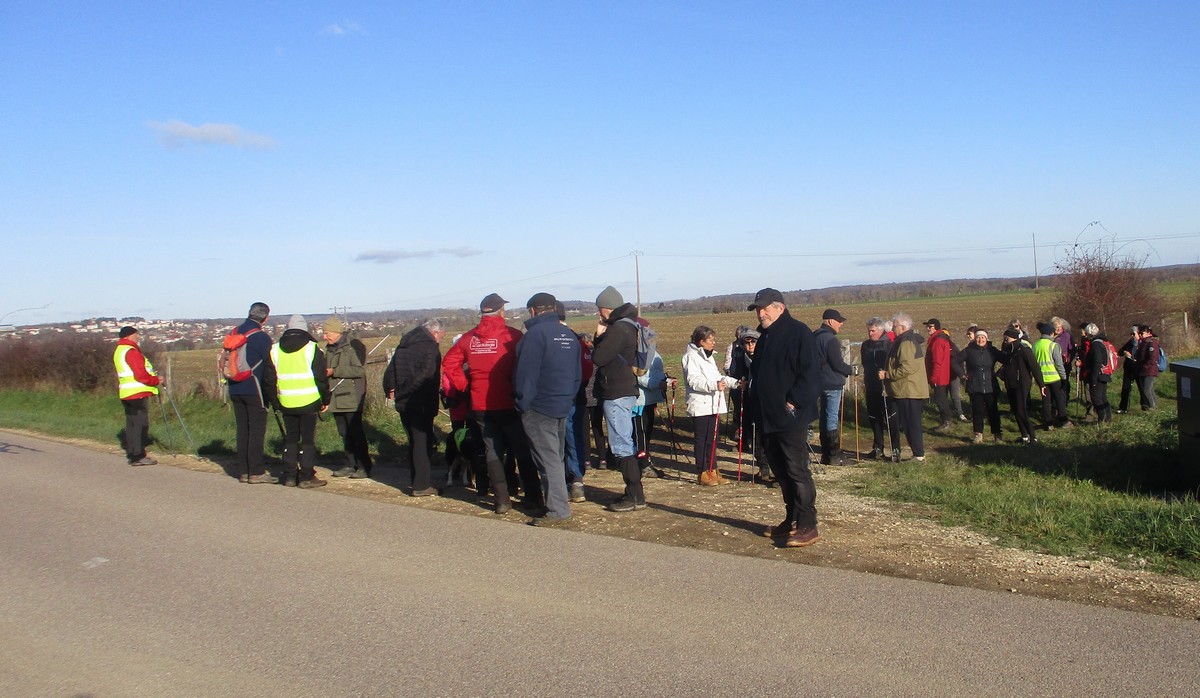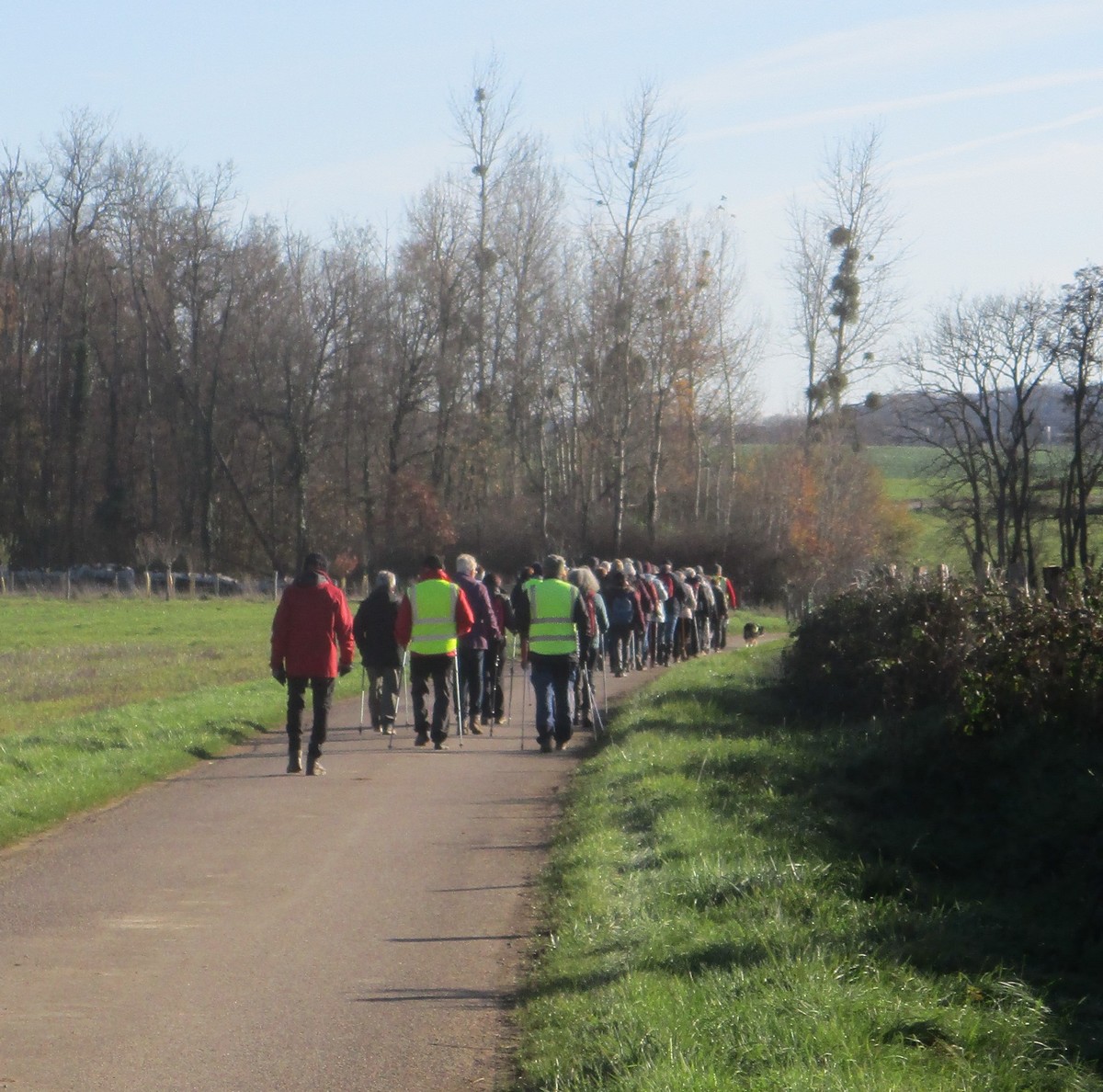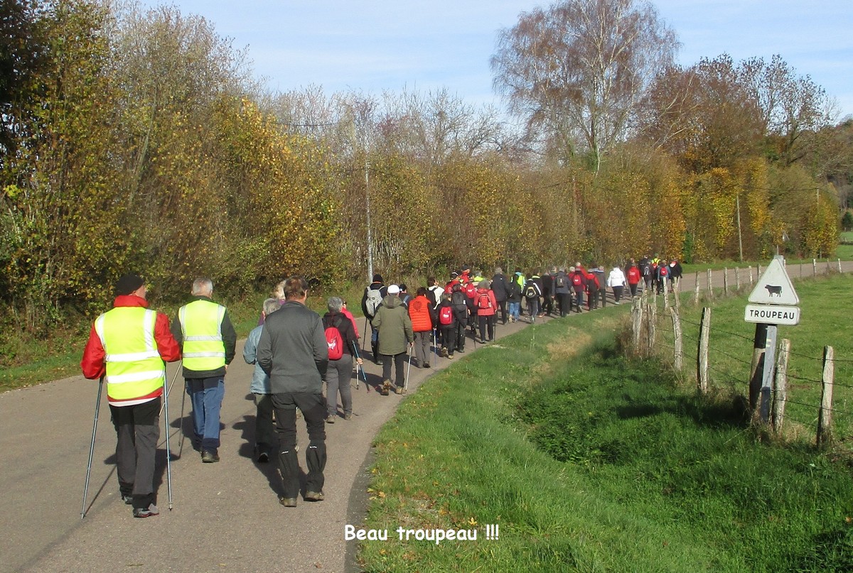 Beau temps et froid sec en ce mardi 18 novembre, à une semaine de la Ste Catherine ! Nous nous sommes chaudement vêtus pour contourner le Mont Rond au départ du plat Pailly (qui n’est pas le mien !). Nous sommes autant que le pastis au pied du Château pour entreprendre cette marche de 7,3kms. A la sortie du village, nous avons été surpris de voir deux équipes de moutons entreprendre un match de foot sur le terrain abandonné ! Pas de difficulté majeure, à part quelques chemins gouillasseux par endroits. Pourtant on a failli faire demi-tour au moment de traverser la voie de chemin de fer au niveau de la route menant à Heuilley-Cotton. En effet, une équipe sous-traitante de la SNCF effectuant des travaux de consolidation du passage à niveau ont installé des barrières qui nous empêchent de franchir les rails. Mais après discussion avec les ouvriers, ces derniers nous ont permis de passer en vitesse afin de pouvoir continuer notre circuit. Nous nous arrêtons un peu plus loin pour la photo traditionnelle depuis le mirador. Mais il y avait tellement de monde que certains manquent sur le cliché. Nous finissons en file indienne, toujours sous un soleil rasant mais aussi un mercure chutant, ceci jusqu’à retrouver nos voitures.