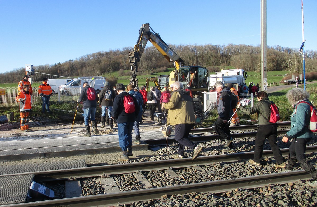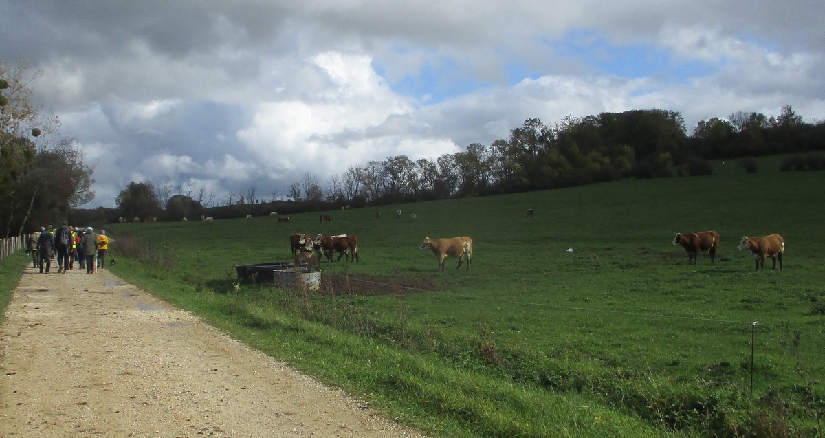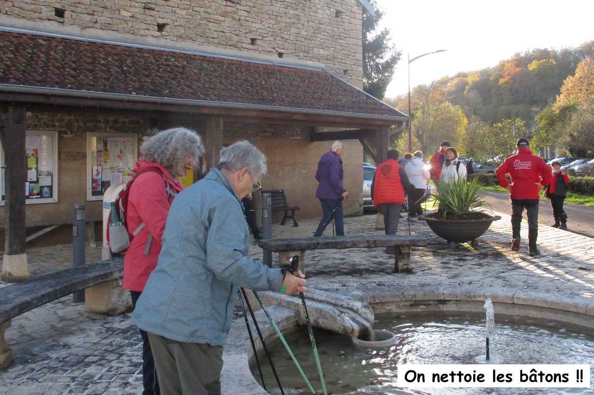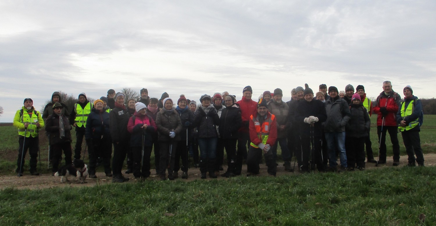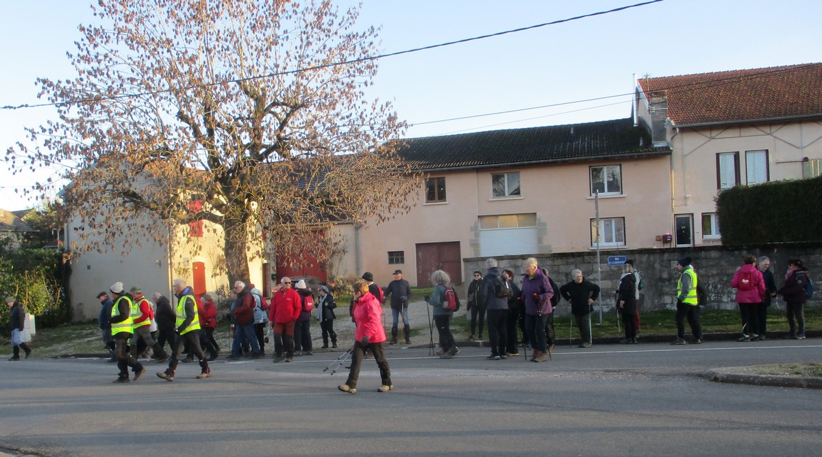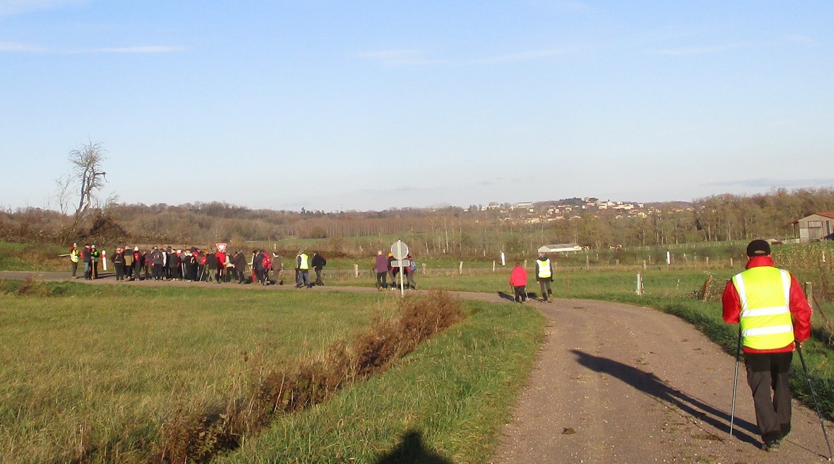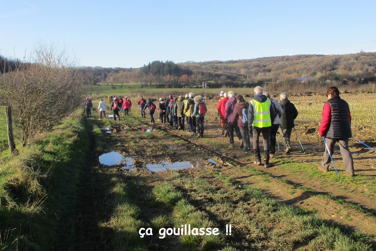 Beau temps et froid sec en ce mardi 18 novembre, à une semaine de la Ste Catherine ! Nous nous sommes chaudement vêtus pour contourner le Mont Rond au départ du plat Pailly (qui n’est pas le mien !). Nous sommes autant que le pastis au pied du Château pour entreprendre cette marche de 7,3kms. A la sortie du village, nous avons été surpris de voir deux équipes de moutons entreprendre un match de foot sur le terrain abandonné ! Pas de difficulté majeure, à part quelques chemins gouillasseux par endroits. Pourtant on a failli faire demi-tour au moment de traverser la voie de chemin de fer au niveau de la route menant à Heuilley-Cotton. En effet, une équipe sous-traitante de la SNCF effectuant des travaux de consolidation du passage à niveau ont installé des barrières qui nous empêchent de franchir les rails. Mais après discussion avec les ouvriers, ces derniers nous ont permis de passer en vitesse afin de pouvoir continuer notre circuit. Nous nous arrêtons un peu plus loin pour la photo traditionnelle depuis le mirador. Mais il y avait tellement de monde que certains manquent sur le cliché. Nous finissons en file indienne, toujours sous un soleil rasant mais aussi un mercure chutant, ceci jusqu’à retrouver nos voitures.