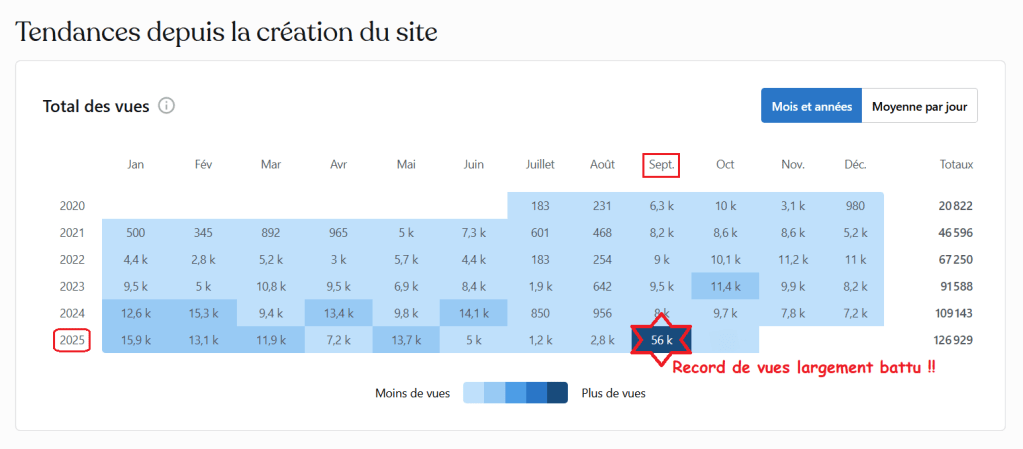 Encore BRAVO, vous avez explosé le compteur dans la journée du 30 septembre : 12176 vues ! Ce qui monte à 56.000 celles de septembre.