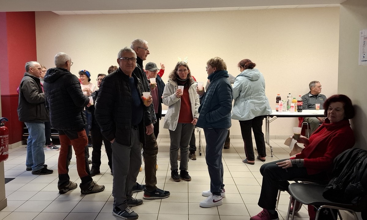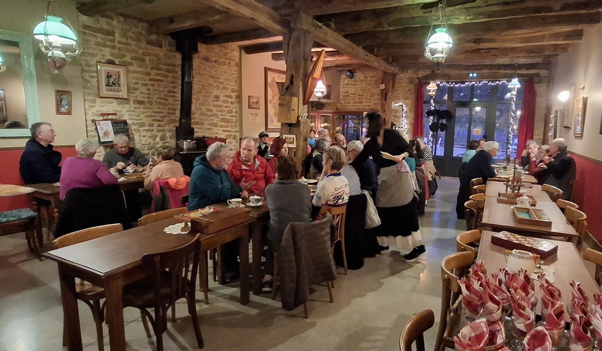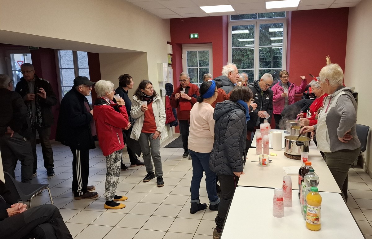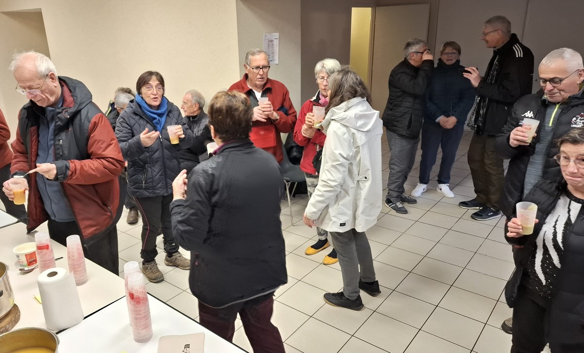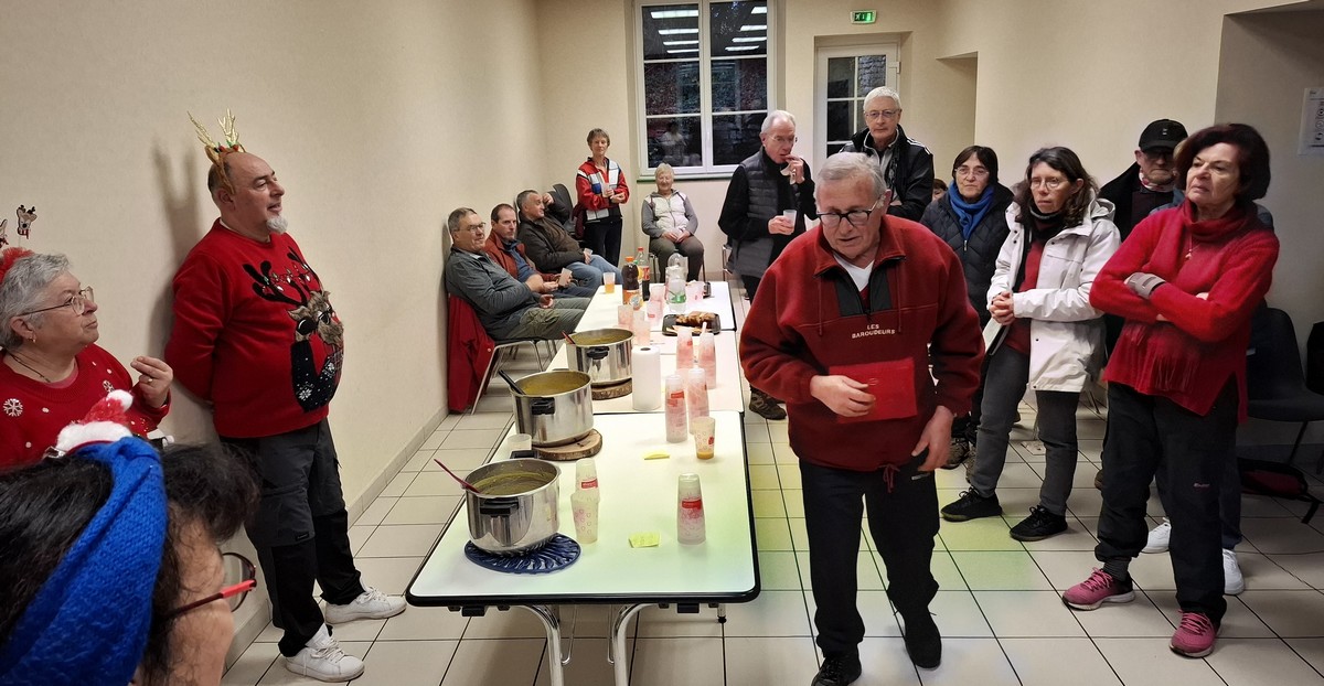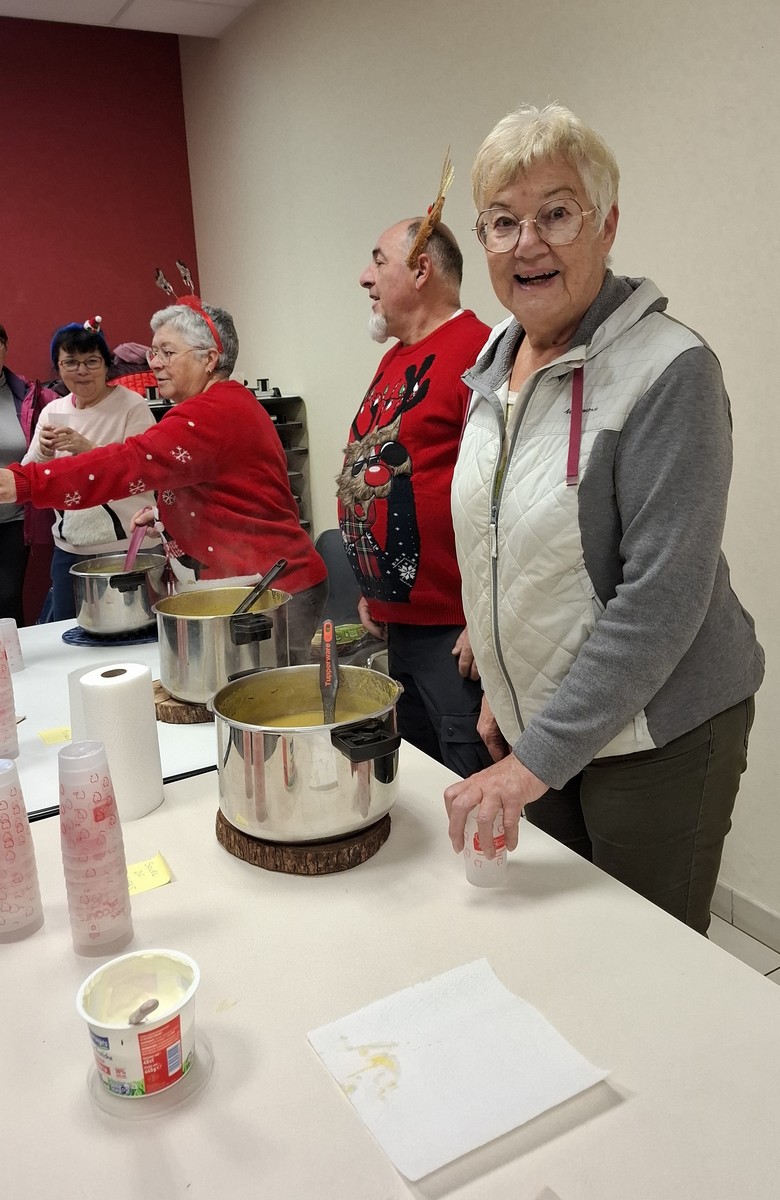 Nous retrouvons Corinne et Rémi superbement habillés devant leurs marmites de potage qu’ils nous ont concoctées avec amour. Asperges des bois, potiron et légumes variés sont au menu des saveurs que chacun a pu goûter sans modération, accompagnées de quelques douceurs et de gaufres sèches apportées par Nelly pour l’occasion. Dédé en profite pour nous conter quelques histoires… Il ne nous reste plus alors qu’à se souhaiter de bonnes fêtes de fin d’année, avant de regagner nos pénates pour des vacances bien méritées, sans oublier de remercier nos hôtes et leur aide Catherine pour cette « soup’ party » ainsi que Nelly pour l’accompagnement. On se retrouvera donc début janvier 2026 pour de nouvelles aventures.