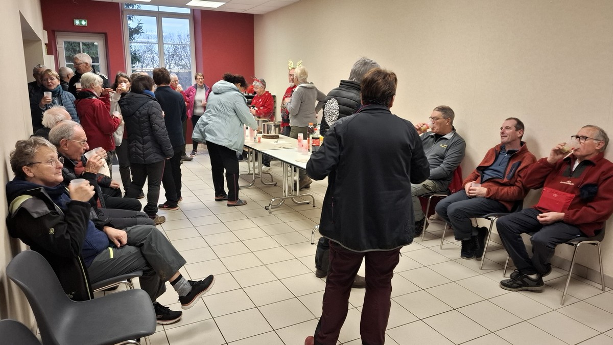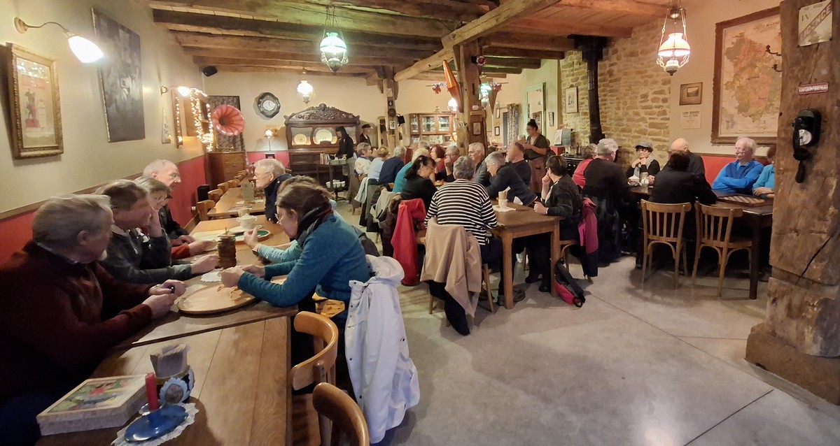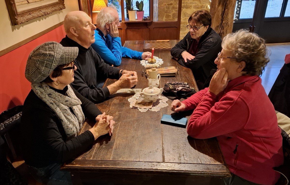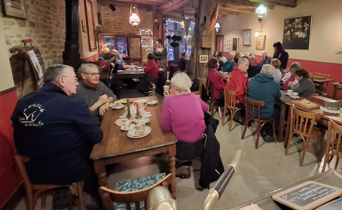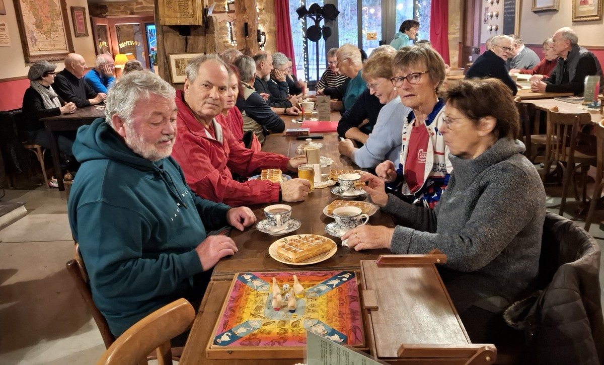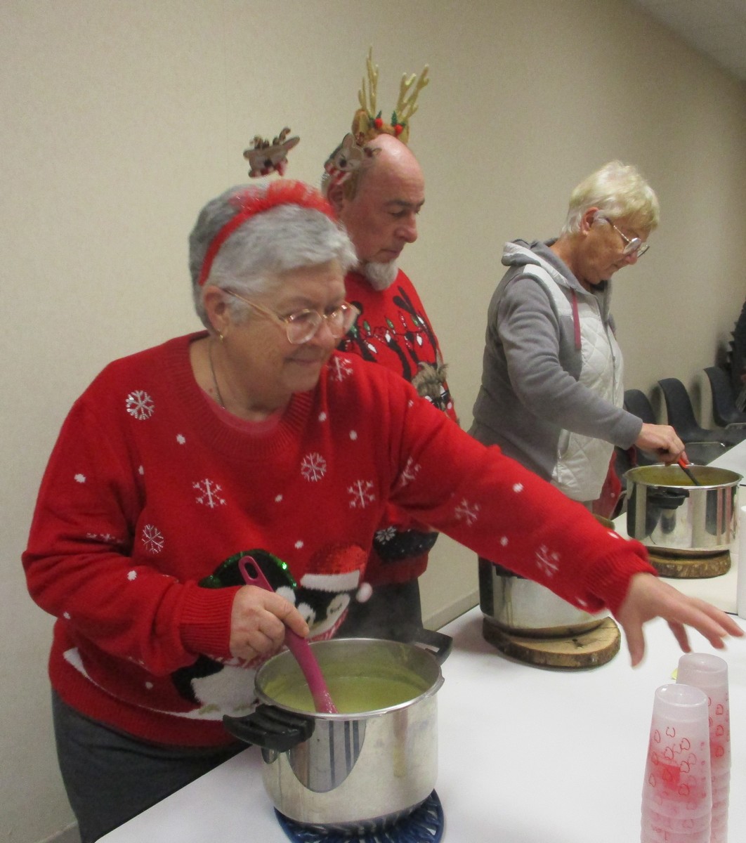 Nous retrouvons Corinne et Rémi superbement habillés devant leurs marmites de potage qu’ils nous ont concoctées avec amour. Asperges des bois, potiron et légumes variés sont au menu des saveurs que chacun a pu goûter sans modération, accompagnées de quelques douceurs et de gaufres sèches apportées par Nelly pour l’occasion. Dédé en profite pour nous conter quelques histoires… Il ne nous reste plus alors qu’à se souhaiter de bonnes fêtes de fin d’année, avant de regagner nos pénates pour des vacances bien méritées, sans oublier de remercier nos hôtes et leur aide Catherine pour cette « soup’ party » ainsi que Nelly pour l’accompagnement. On se retrouvera donc début janvier 2026 pour de nouvelles aventures.