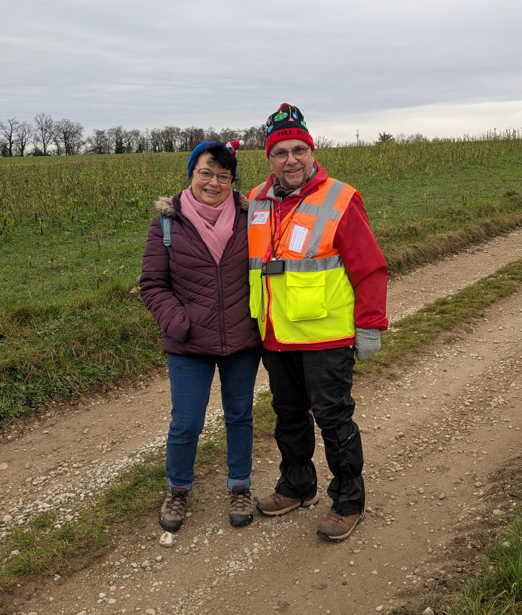 Aujourd’hui, on ne va pas faire la tronche, nous allons à Tronchoy, pays de Corinne et Rémi. Et de plus, on ne va pas « cracher dans la soupe », on ira la déguster après l’effort. Et pour ce qui est de l’effort, c’est une marche d’environ 6 kms sans grand dénivelé qui nous attend. Nous sommes une petite quarantaine à s’être donné rendez-vous au pied du château d’eau sur les hauteurs du village. Le temps est couvert mais sans brouillard comme ce fut le cas les années précédentes. Des chemins quasi praticables, nos croqueneaux n’ont pas trop souffert pour la dernière de l’année, ils pourront se glisser sous le sapin (après un petit nettoyage quand même) !! A l’approche de Noël, Mme et M. Presse ont mis leurs bonnets de fête pour l’occasion. La traversée du bois s’est faite en douceur … presque printanière ! Mais à la lisière, notre Corinne prend ses chevaux vapeurs pour filer afin de faire « chauffer la soupe ». Encore un petit effort en traversant la plaine et nous arrivons à nos voitures qui nous attendent pour rejoindre la salle des fêtes …