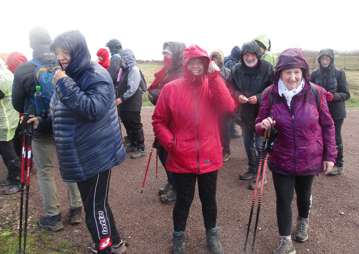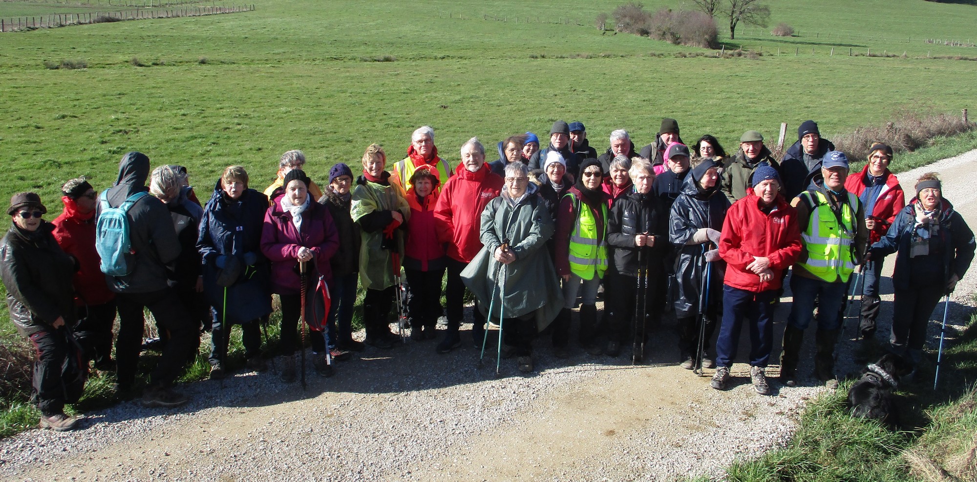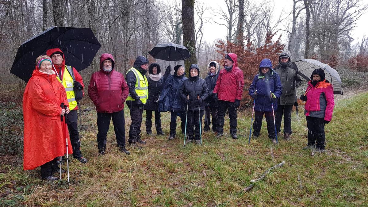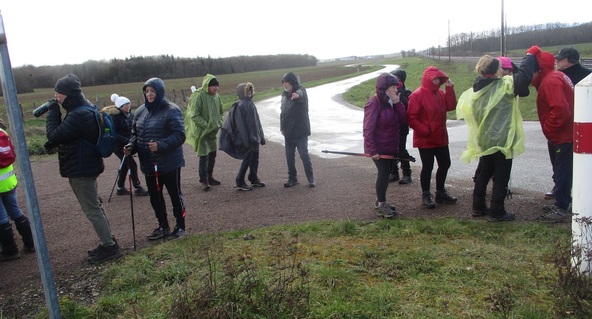 Donc aujourd’hui, nous sommes une bonne trentaine à venir fouler le plat Pailly. C’est au pied du château du même nom que nous avons garé nos calèches pour démarrer notre balade de plus de 7 kms. Nous passons sous le pont SNCF, rue des Moulins (non, pas Bernard !). La météo s’annonce bien : passages nuageux entrecoupés d’éclaircies… mais ça n’a pas durer longtemps : un vent fort, puis une averse qui nous fouettait le visage, suivie d’une éclaircie avec toujours du vent qui a permis de sécher nos parkas et kways. Mais on n’était pas sauvé : une autre averse le long de la voie ferrée, puis l’éclaircie bienvenue pour re-sécher nos habits et chapeaux… On en a profité pour prendre une photo de groupe mais sans votre serviteur (car obligé de tenir l’appareil-photo tellement il y avait fort vent). Nous terminons alors notre marche en contournant le Mont Rond sans se faire du mouron, sous le soleil et ce jusqu’à arriver vers nos carrosses qui nous attendaient.