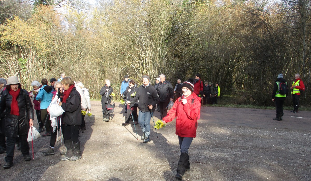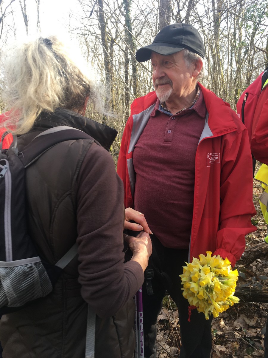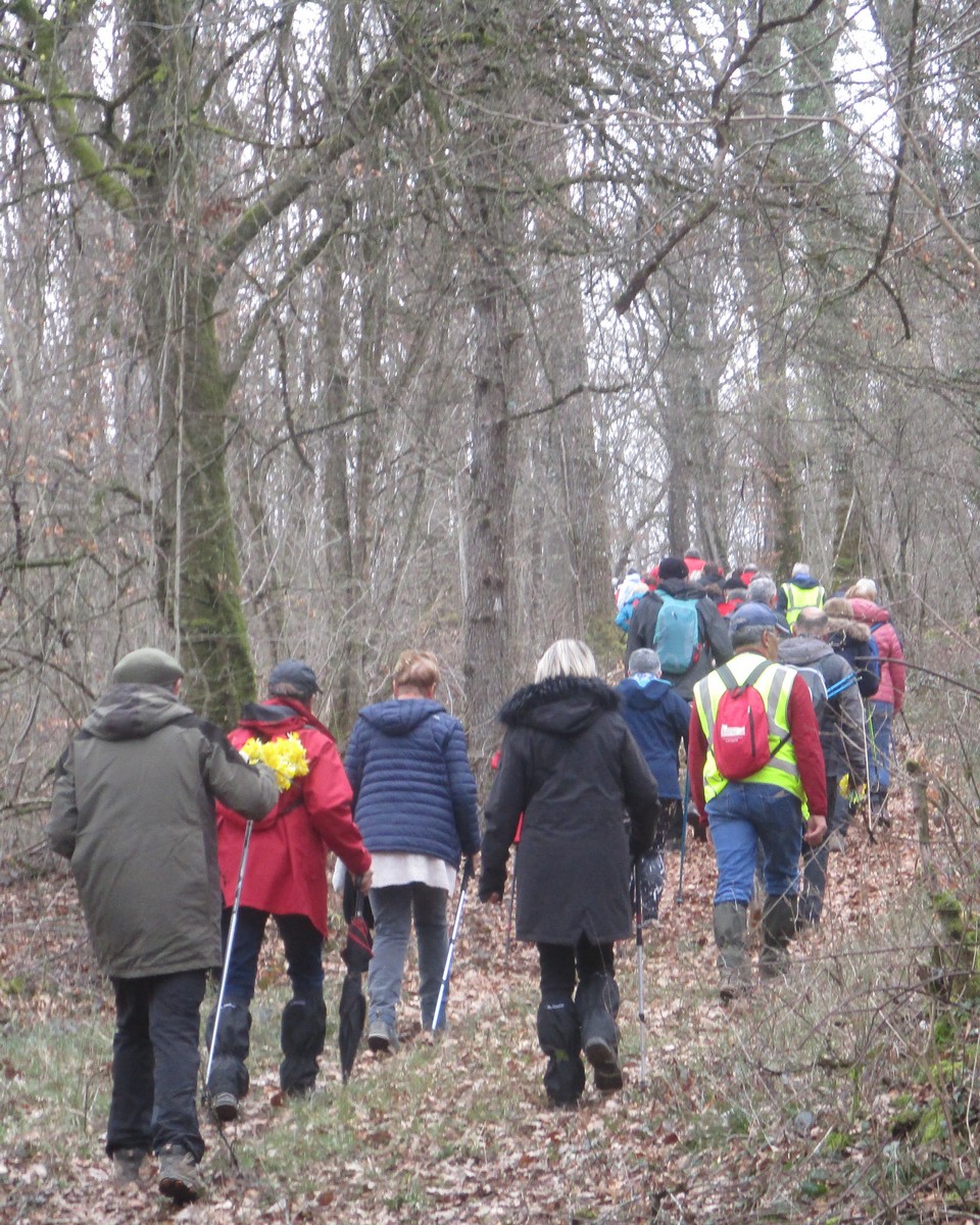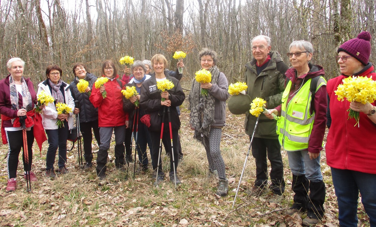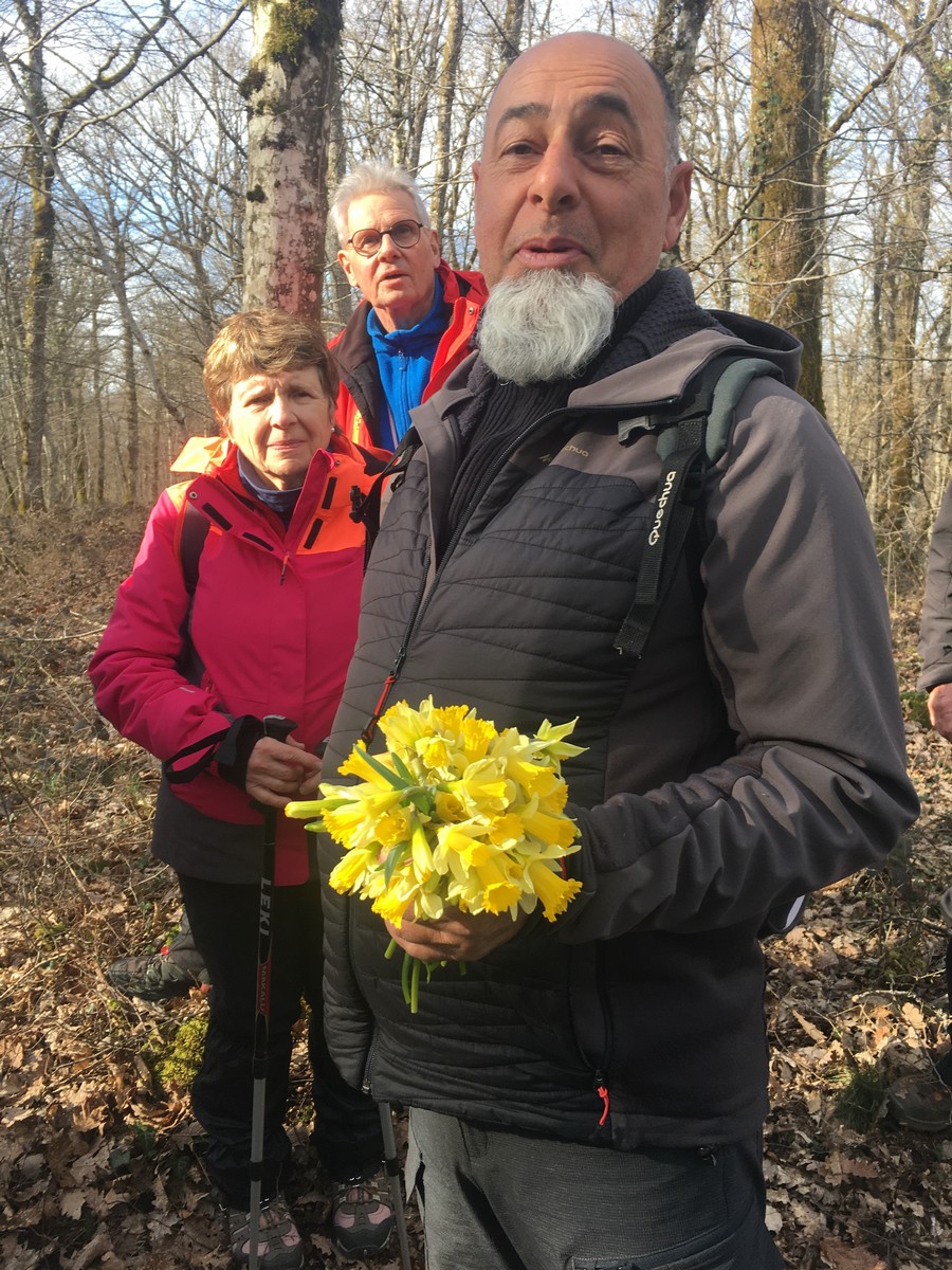 Le printemps est arrivé, sors de ta maison comme le chantait Michel Fugain. Et bien, nous étions quand même une cinquantaine de valeureux marcheuses et marcheurs prêts à arpenter les alentours du village. Comme on dit : « si tu ne veux pas faire une marche en plaine, alors cours celle en montagne » ; et il y en avait des montées à gravir, mais… sans courir ! Deux galants hommes nous ont même tenu le tronc d’un arbre qui barrait le chemin pour ne pas qu’il tombe en passant dessous ! Nous sommes restés longtemps à marcher dans les bois, avec par endroits des étendues de jonquilles que nos cueilleu(rs)ses ont prises d’assaut pour un bouquet. Un temps de printemps qui a ravi tout le monde.