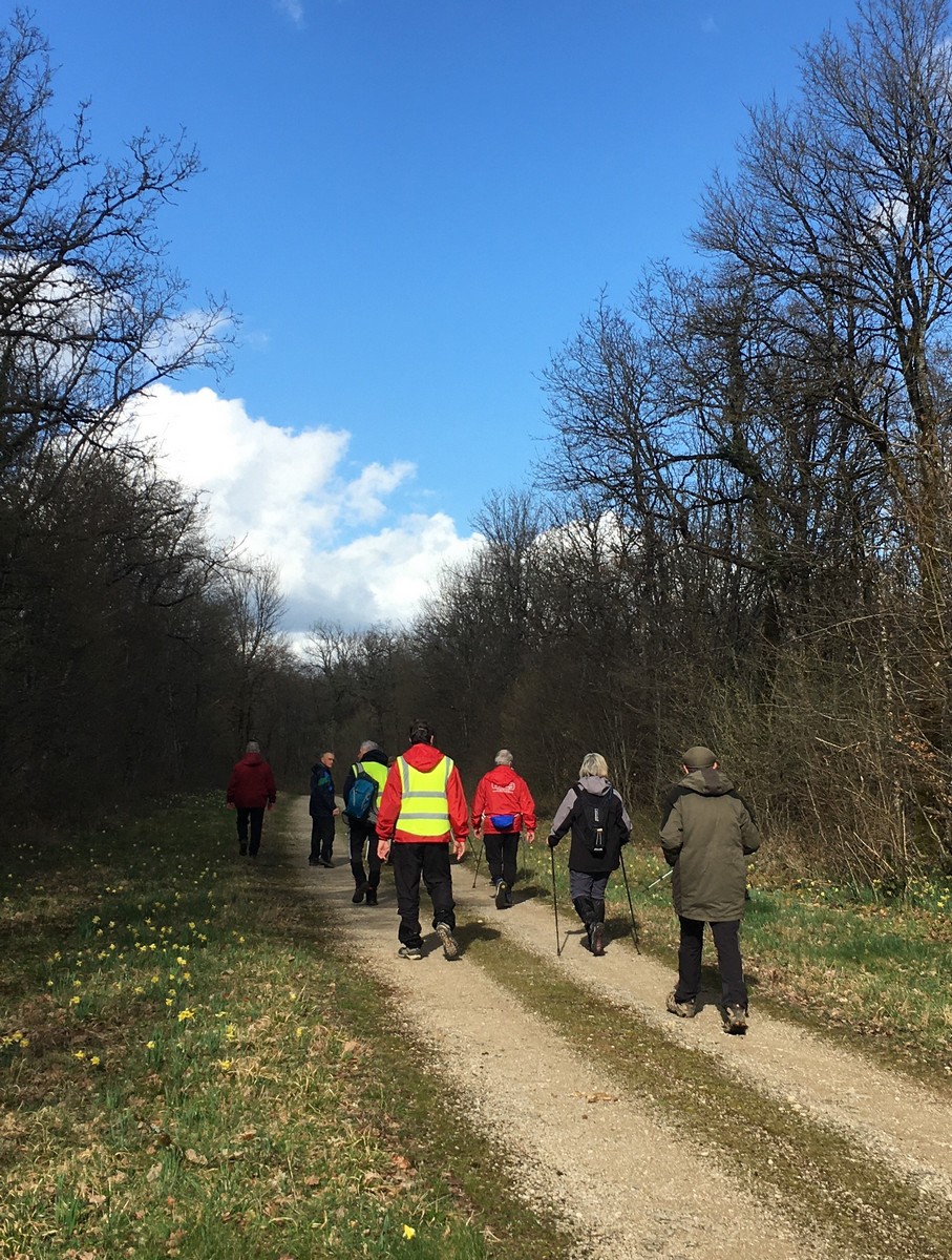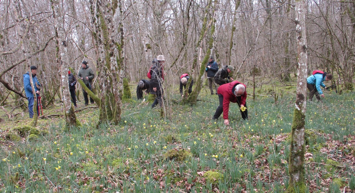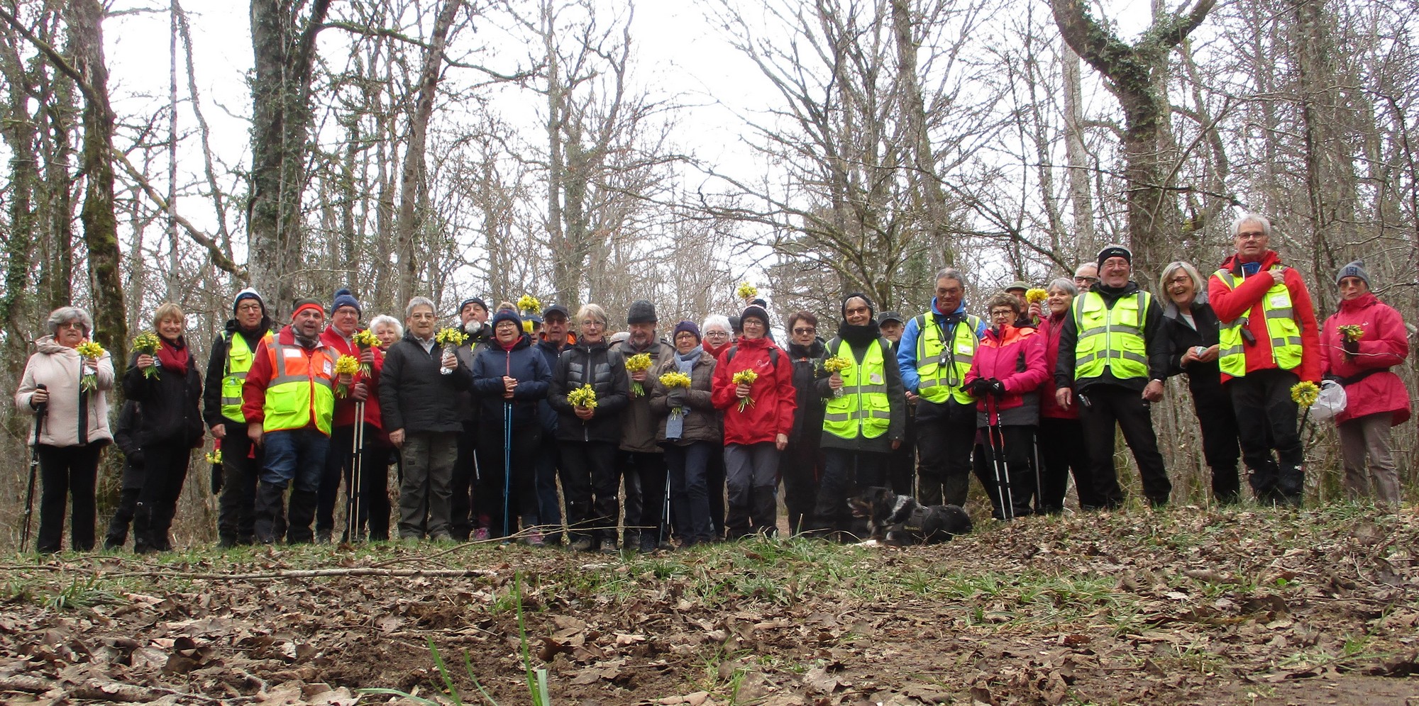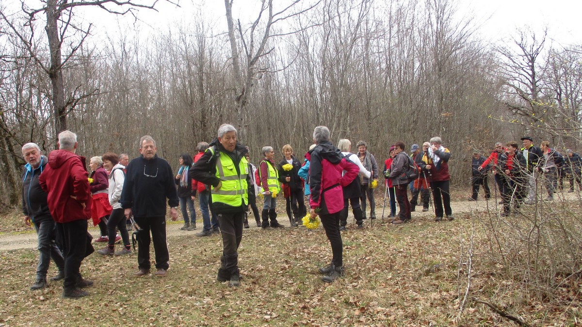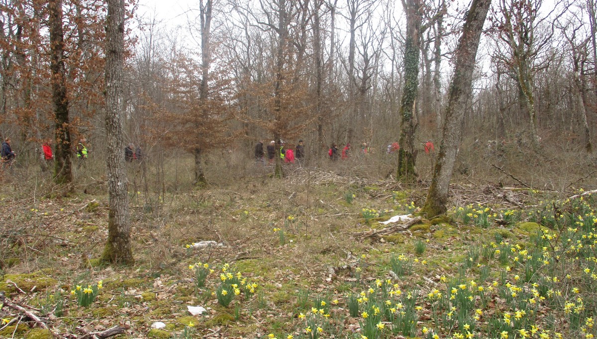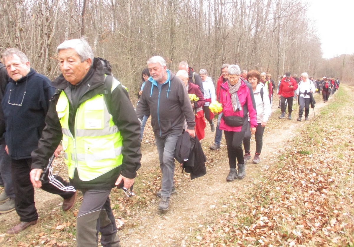 Le printemps est arrivé, sors de ta maison comme le chantait Michel Fugain. Et bien, nous étions quand même une cinquantaine de valeureux marcheuses et marcheurs prêts à arpenter les alentours du village. Comme on dit : « si tu ne veux pas faire une marche en plaine, alors cours celle en montagne » ; et il y en avait des montées à gravir, mais… sans courir ! Deux galants hommes nous ont même tenu le tronc d’un arbre qui barrait le chemin pour ne pas qu’il tombe en passant dessous ! Nous sommes restés longtemps à marcher dans les bois, avec par endroits des étendues de jonquilles que nos cueilleu(rs)ses ont prises d’assaut pour un bouquet. Un temps de printemps qui a ravi tout le monde.