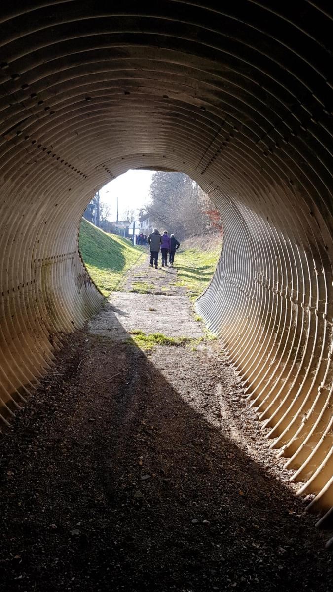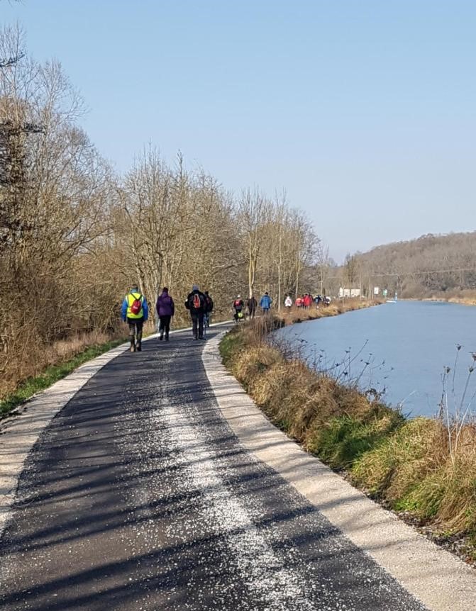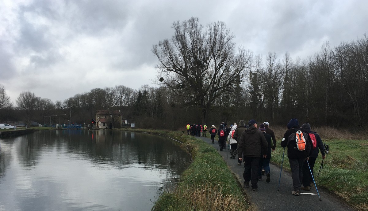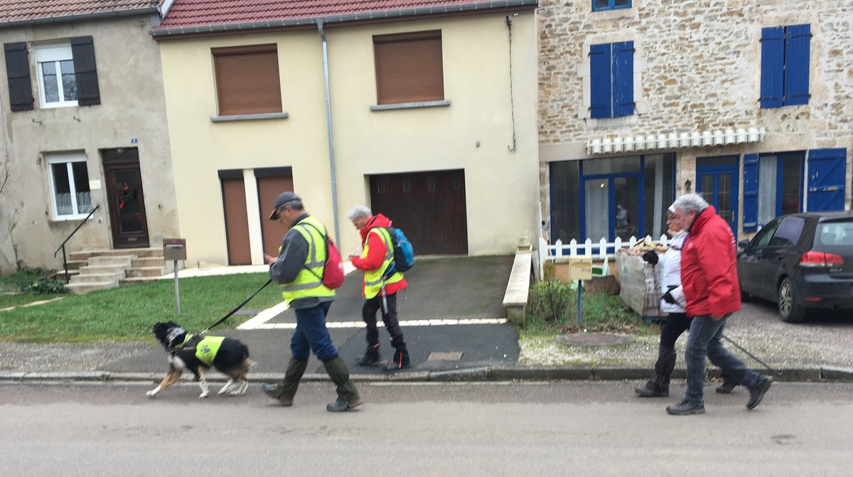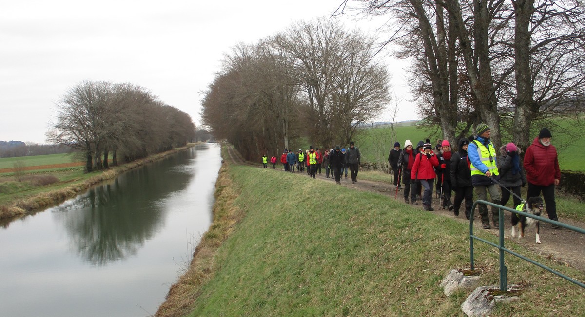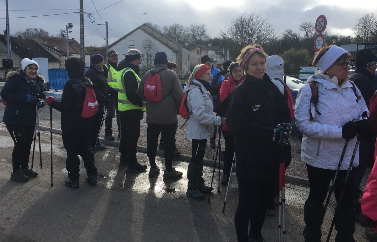 Aujourd’hui, la marche du cœur au départ d’Heuilley était « Cotton ». Tout d’abord, il a fallu attendre les marcheurs qui ne trouvaient pas le Port (la signalétique laissant à désirer alors on les pardonne). Le long du canal, on y a vu un bateau bizarre qui permet de retirer les algues qui prolifèrent. Et au bout du canal, il y a l’entrée du tunnel, lequel ressort à Balesmes. Mais le tracé de la marche nous emmène dans le bois à l’abri du vent mais où nos chaussures ont beaucoup souffert. Sortis du bois, un vent glacial nous engourdit suivi d’un léger crachin. Juste le temps de prendre quand même une photo de groupe et nous rentrons enfin dans le village, contents d’arriver avant la pluie annoncée.