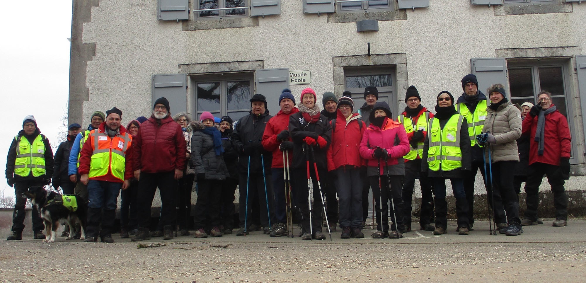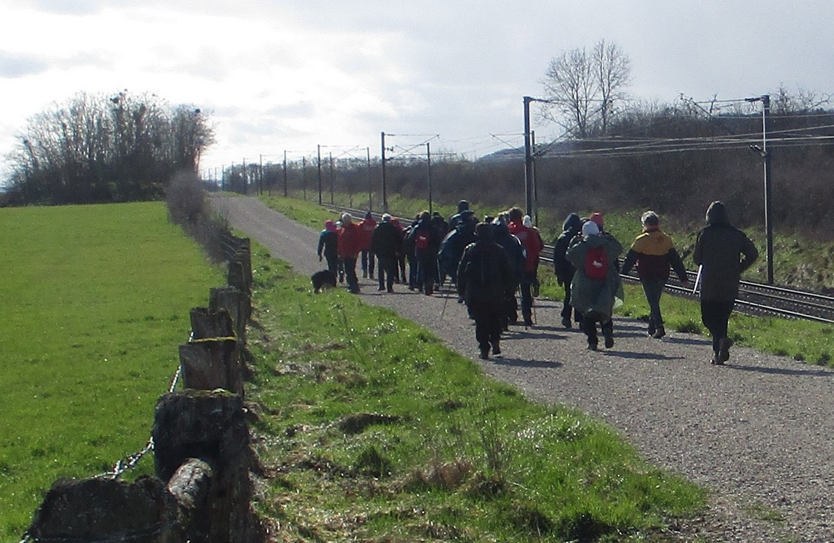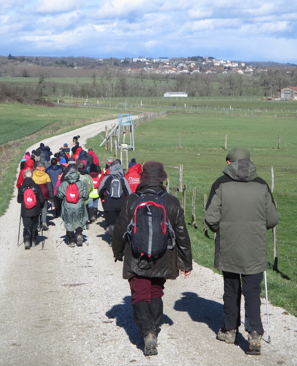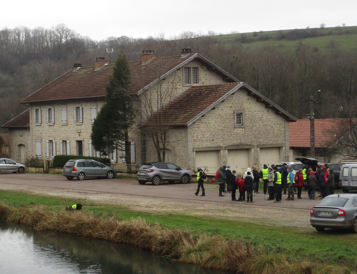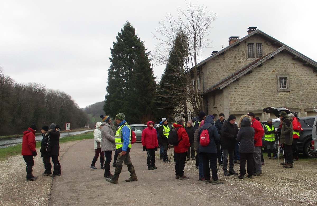Aujourd’hui, nous sommes le 28 février et nous sommes 28 marcheurs prêts à arpenter la plaine autour de Choilley – Dardenay. Mais nous n’avons pas été choyé par la météo : pas de soleil, frisquet mais sans précipitations. Au départ de Choilley, une ascension nous attendait, puis un léger dénivelé suivi d’une petite bosse et enfin une grande descente qui nous amène à Dardenay. Nous nous arrêtons au pied de l’ancienne école transformée en « Musée – Ecole » où l’on peut revivre l’ambiance d’une école rurale d’autrefois ; mais la porte était fermée. Nous continuons alors jusqu’à rejoindre le canal, lequel nous longeons pour retrouver Choilley où nos voitures nous attendent.