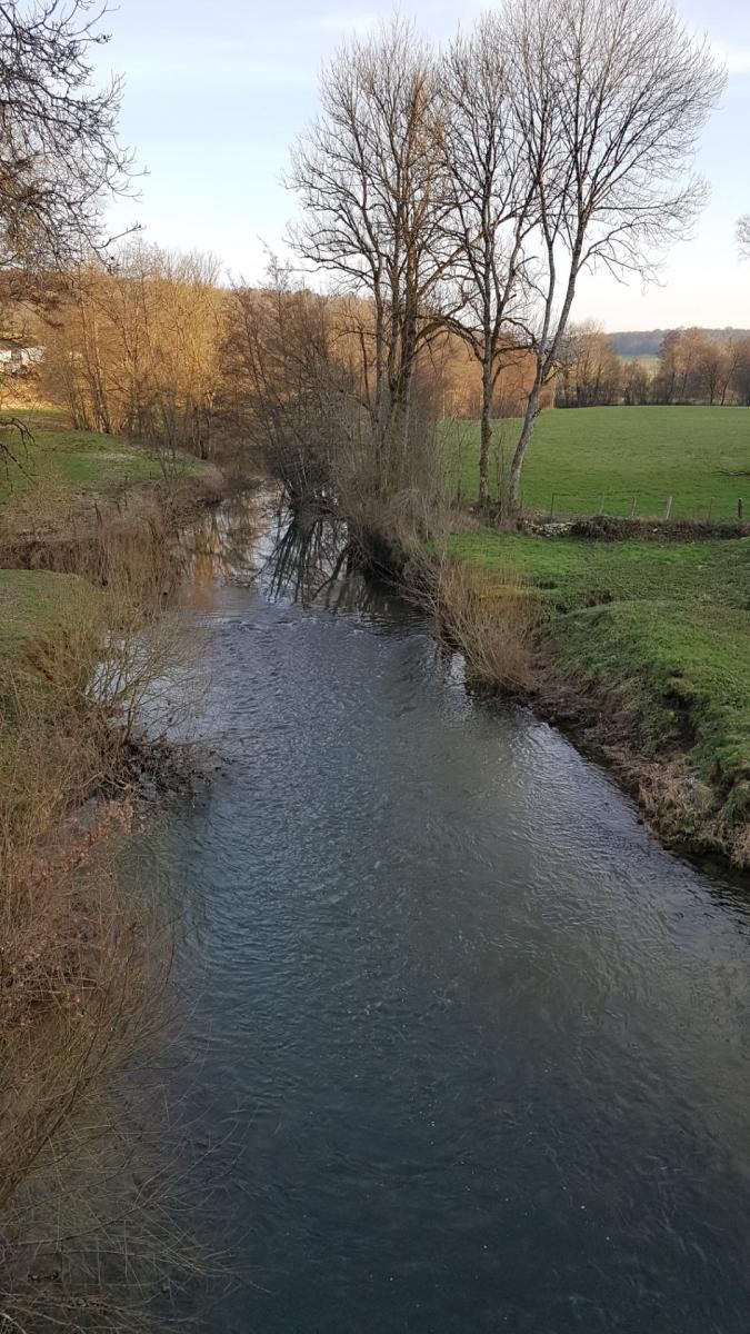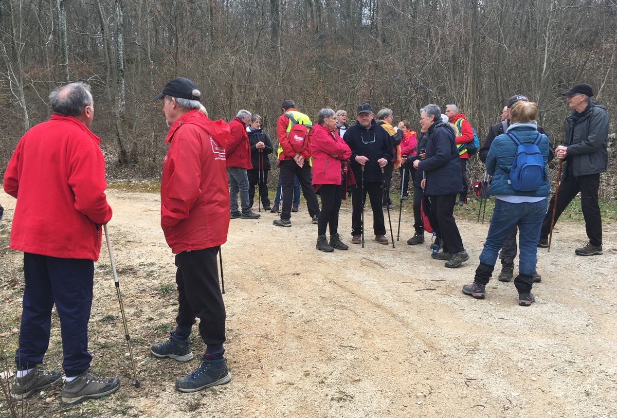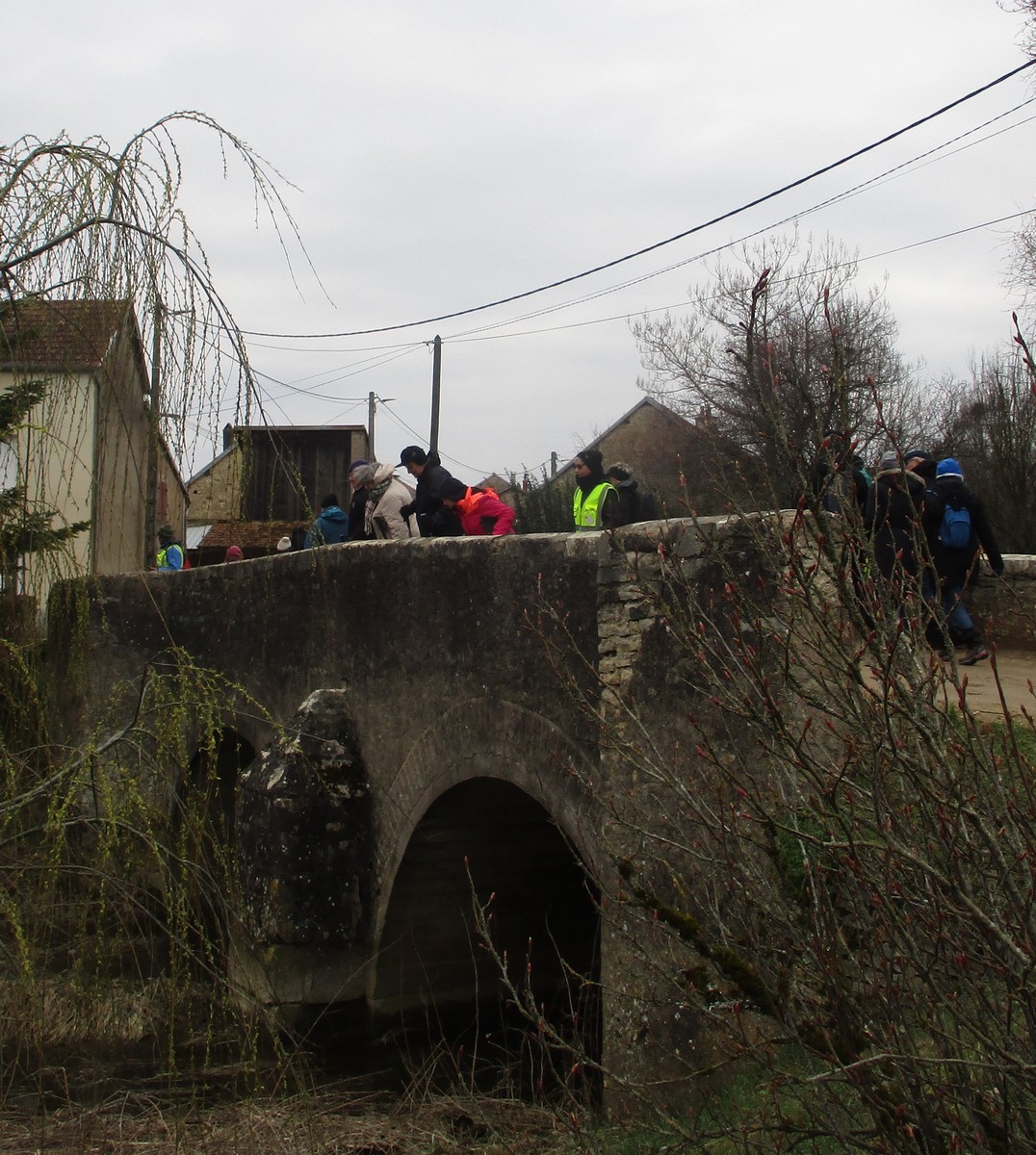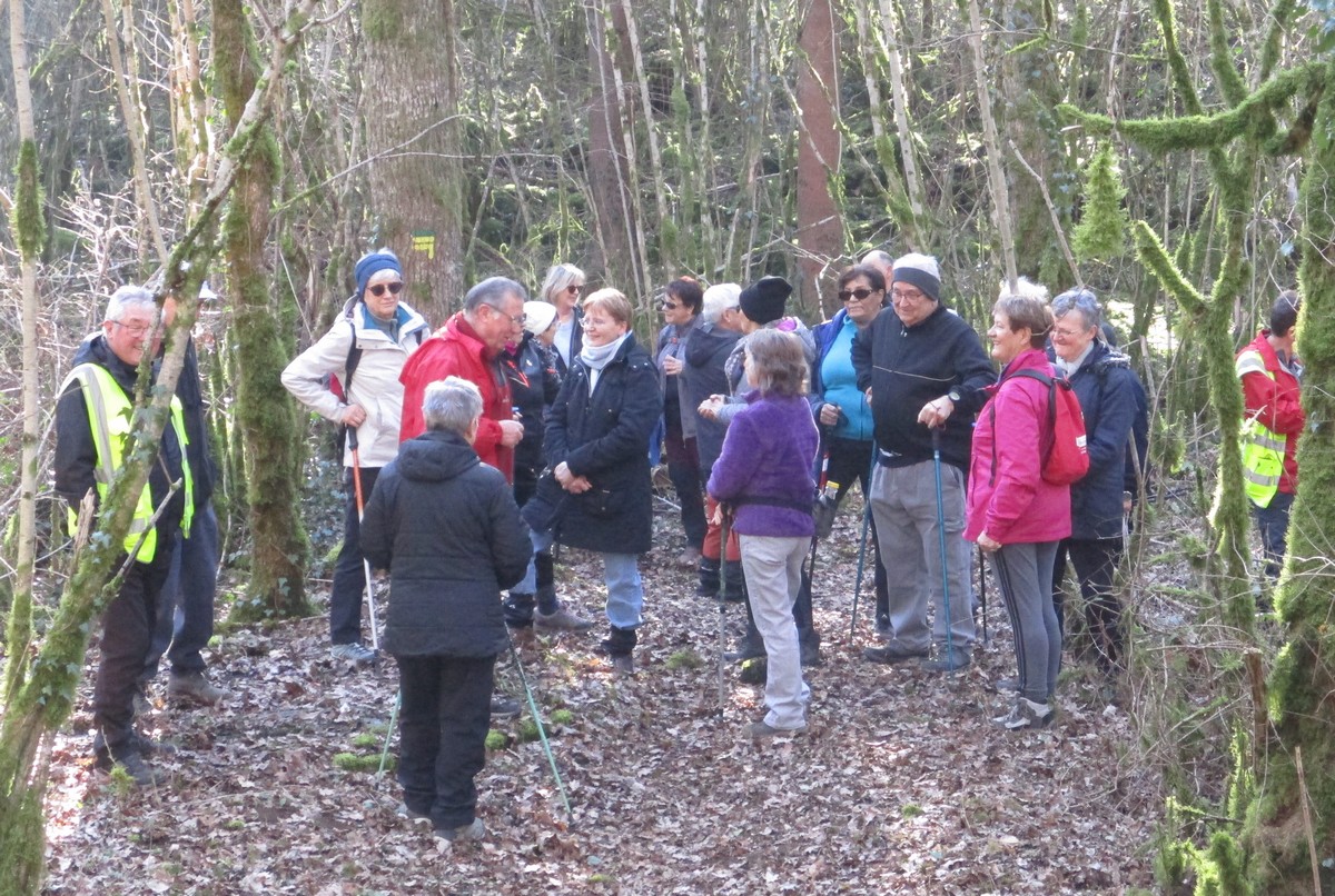 Nous voici aujourd’hui à tort ou à raison, non à Torcenay, pour marcher sur quelques 6 kms. La neige a bien fondu mais il fallait encore se méfier en empruntant les trottoirs. Nous passons dans la rue Louis Massotte, célèbre aviateur né ici et dont son homonyme nous accompagne. Après être sorti du village, le groupe s’enfonce dans le bois. Le temps de poser pour la photo et nous voilà serpentant des sentiers gouaillaceux où les chaussures ont pris cher et où les glissades ont été évitées. Nous sortons alors du bois, longeant le hameau du Foultot et traversons le Saulon. A propos de ce ruisseau, il change de nom tout au long de son cours (Salon, Saôlon et Saulon). Un train de marchandises passe sur le petit viaduc du Saulon et nous, nous passons sous le pont qui nous ramène à notre point de départ.