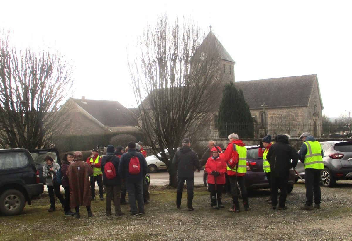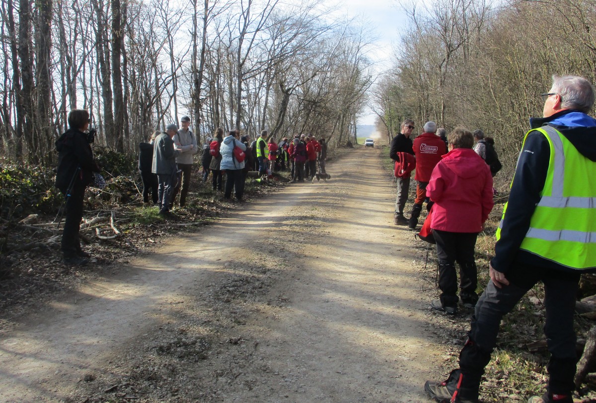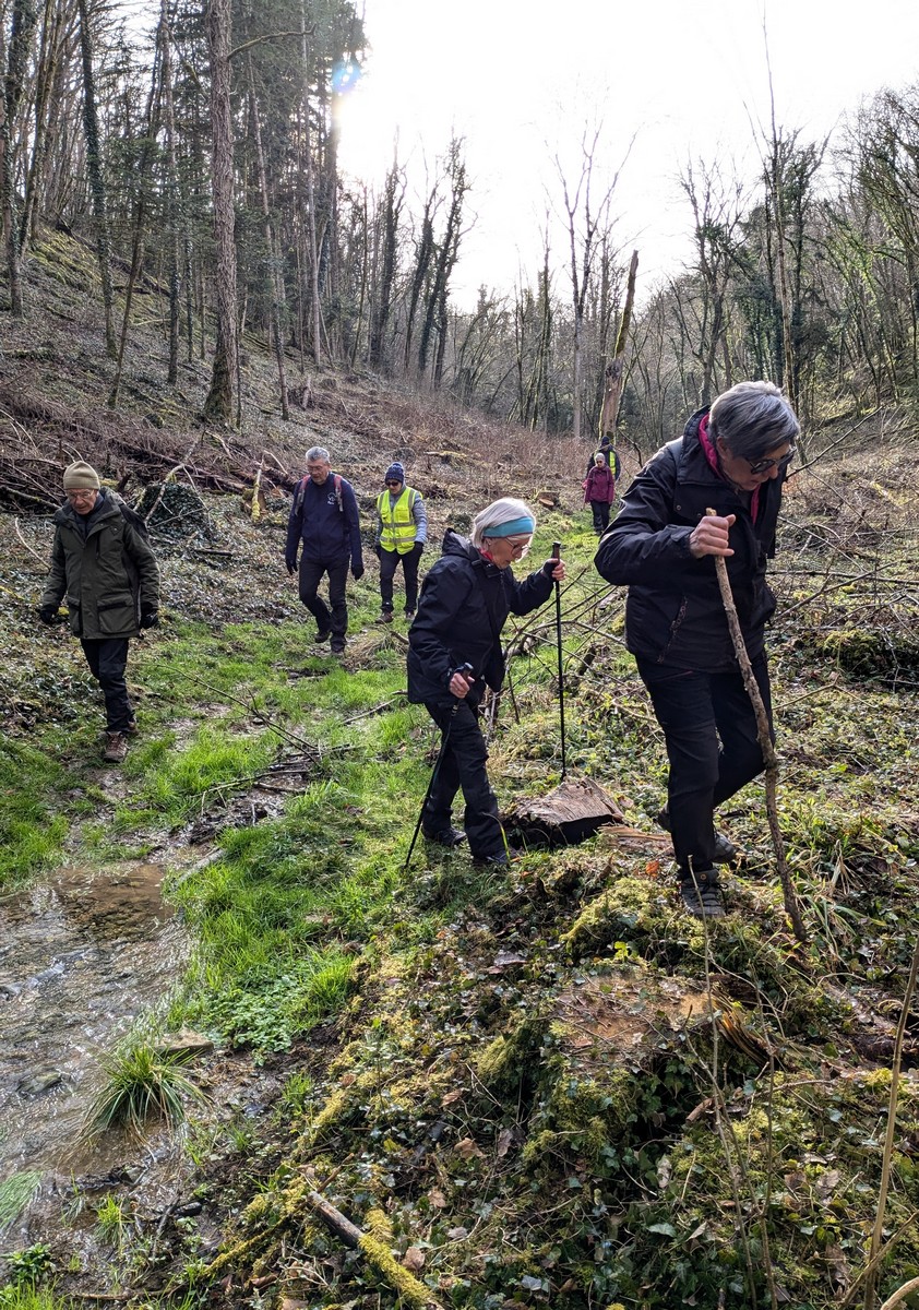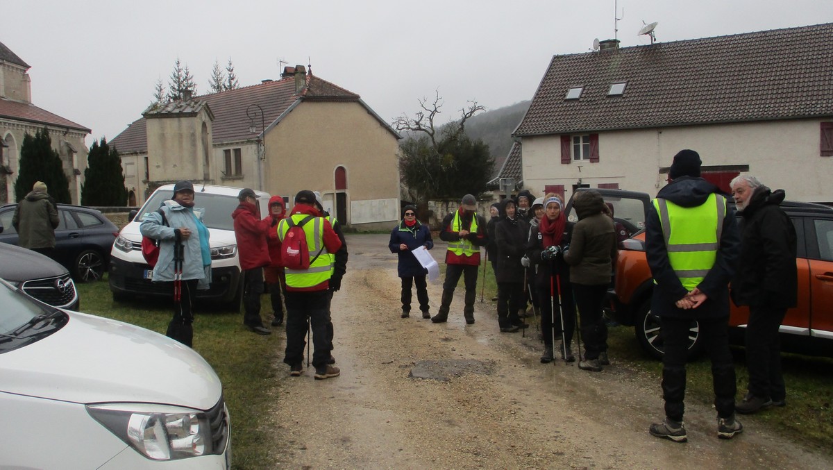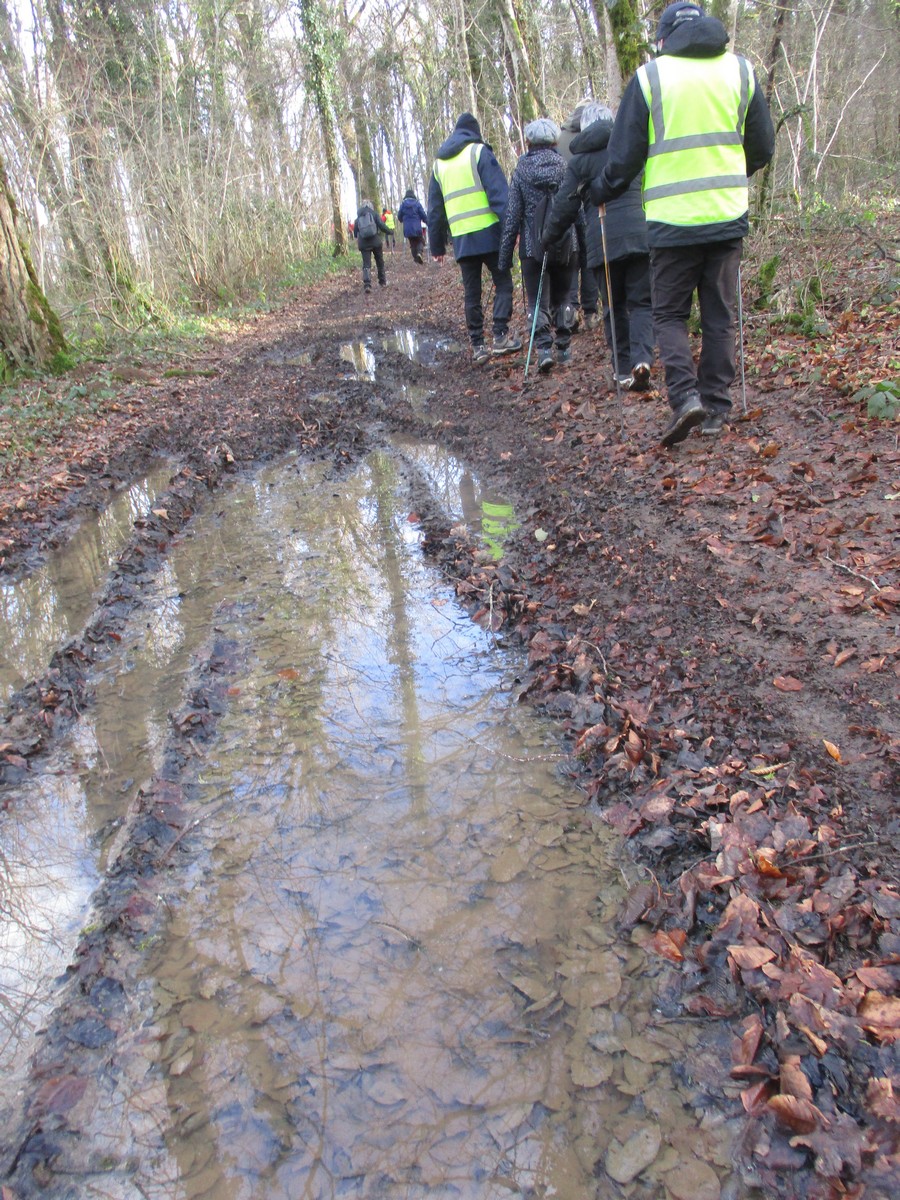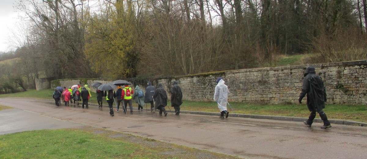 C’est parti pour une marche de 9,8 kms ; nous sommes une bonne vingtaine au départ de Noidant-Le-Rocheux, accompagné d’un ciel bleu. Nous débutons par une montée afin de parcourir notre chemin dans les sous-bois bien gouillasseux, qui nous mènent sur une plaine, de façon à rejoindre le GR 7 traversant la vallée de la Mouche. Celle-ci est bien humide et encombrée d’arbres tombés par les rafales de vent : « Un vrai parcours du combattant ». Mais aucun ne se « noie dans » un verre d’eau en traversant les rus.