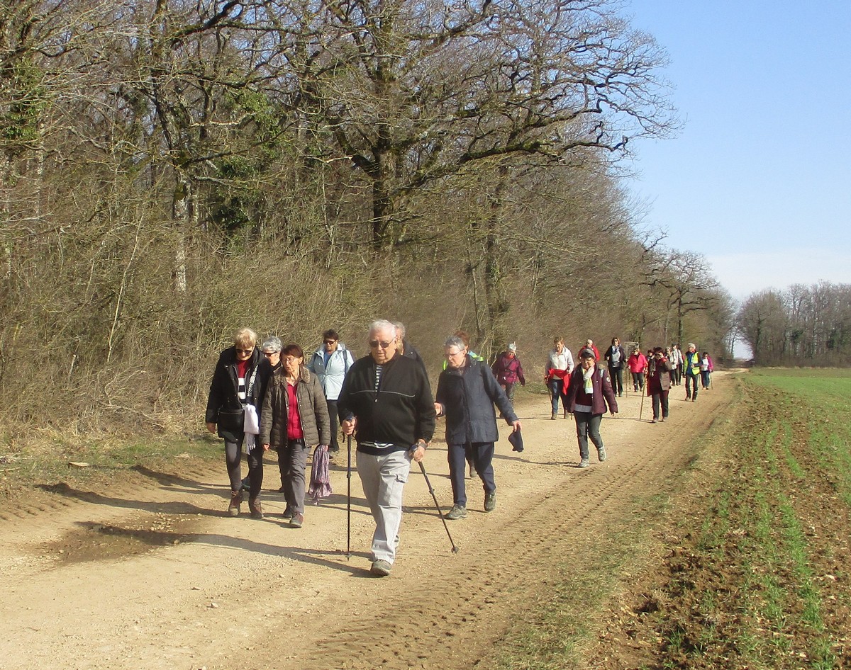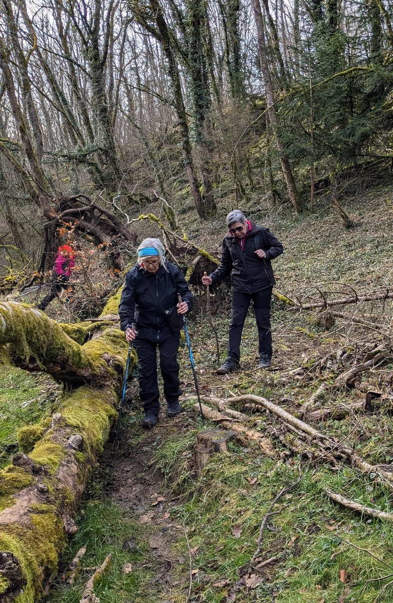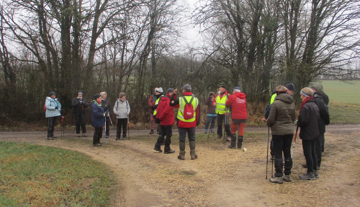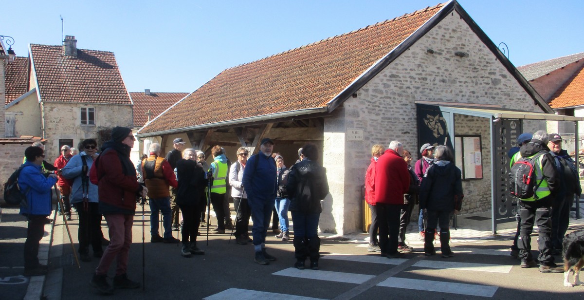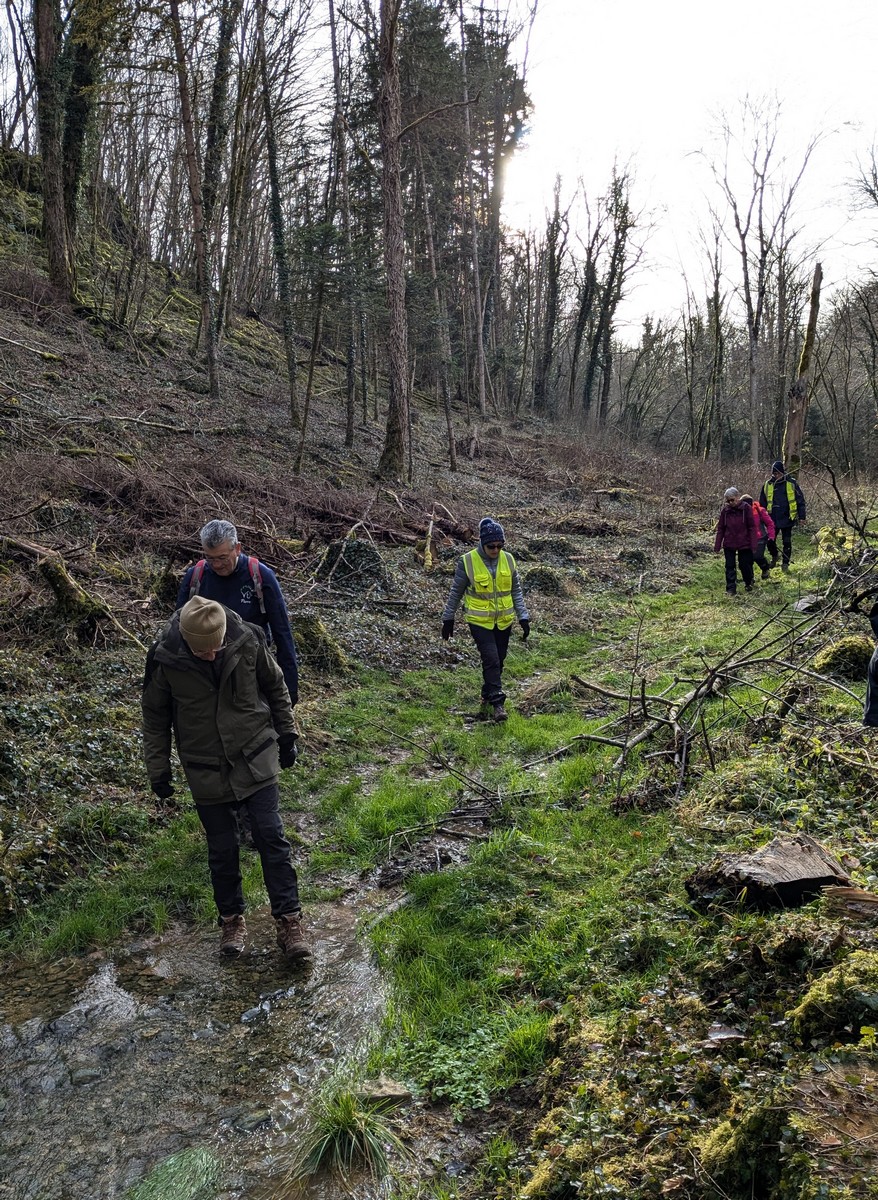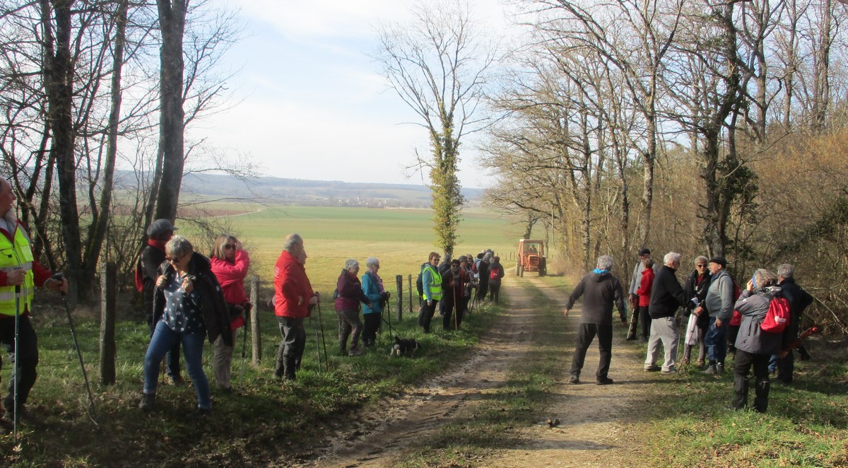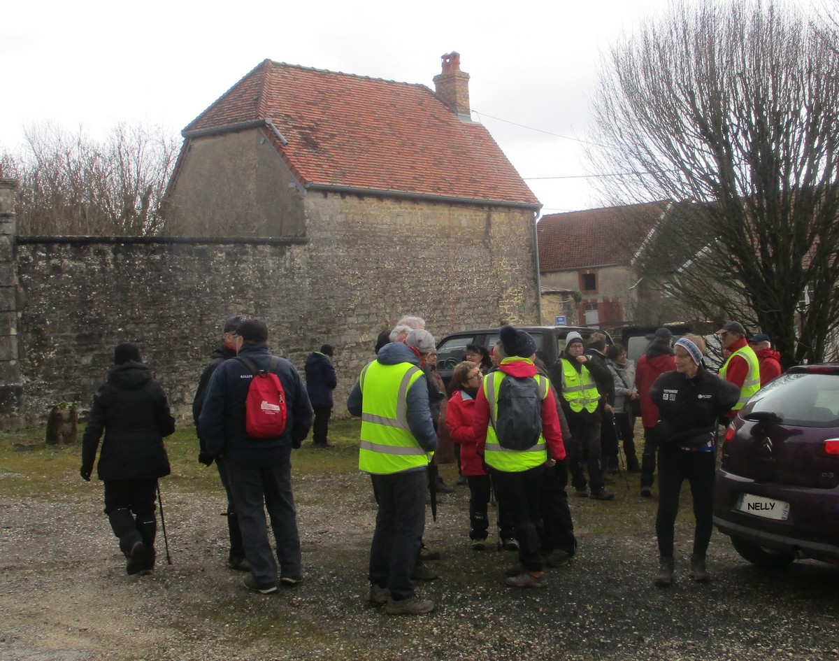 C’est parti pour une marche de 9,8 kms ; nous sommes une bonne vingtaine au départ de Noidant-Le-Rocheux, accompagné d’un ciel bleu. Nous débutons par une montée afin de parcourir notre chemin dans les sous-bois bien gouillasseux, qui nous mènent sur une plaine, de façon à rejoindre le GR 7 traversant la vallée de la Mouche. Celle-ci est bien humide et encombrée d’arbres tombés par les rafales de vent : « Un vrai parcours du combattant ». Mais aucun ne se « noie dans » un verre d’eau en traversant les rus.