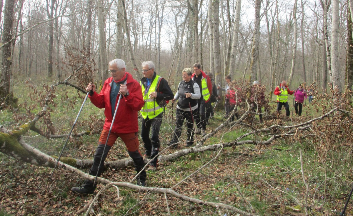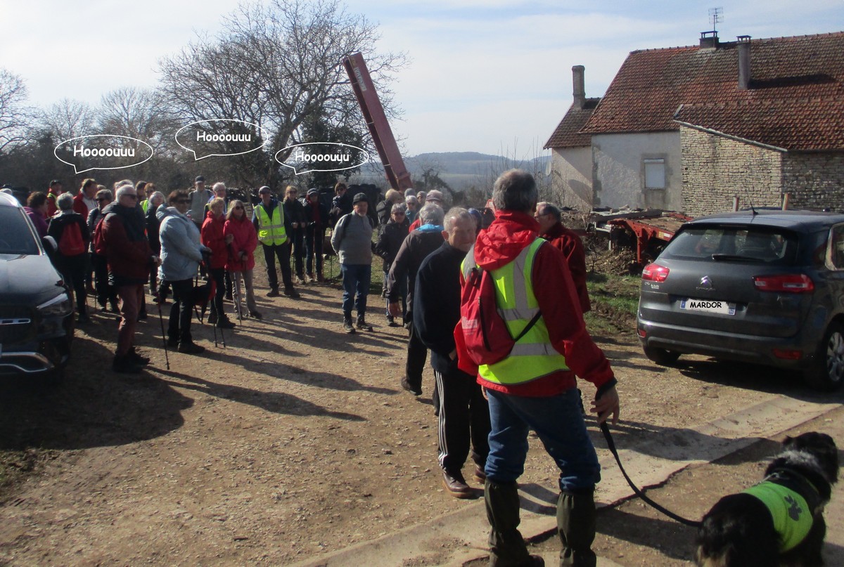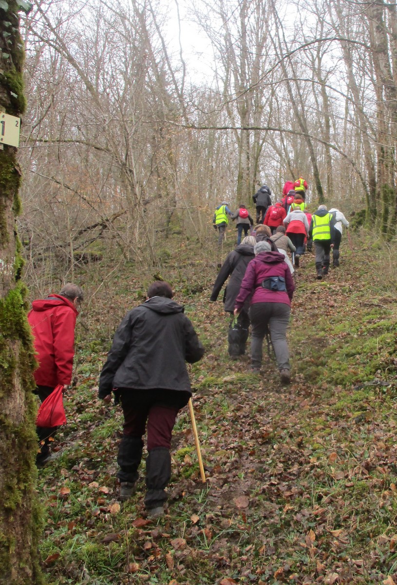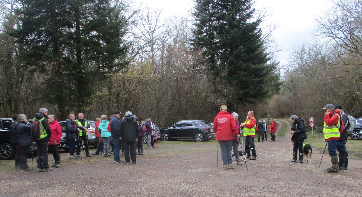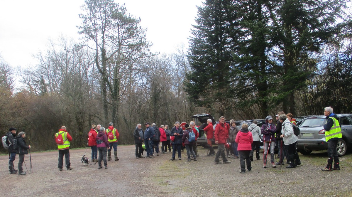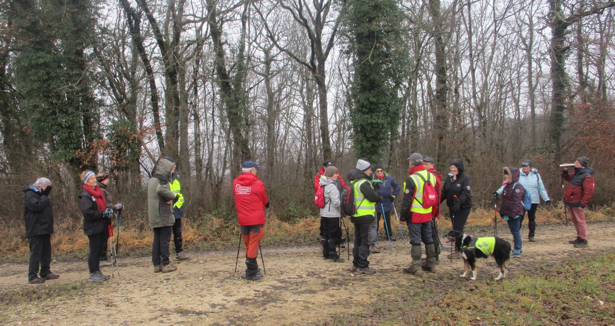 C’est parti pour une marche de 9,8 kms ; nous sommes une bonne vingtaine au départ de Noidant-Le-Rocheux, accompagné d’un ciel bleu. Nous débutons par une montée afin de parcourir notre chemin dans les sous-bois bien gouillasseux, qui nous mènent sur une plaine, de façon à rejoindre le GR 7 traversant la vallée de la Mouche. Celle-ci est bien humide et encombrée d’arbres tombés par les rafales de vent : « Un vrai parcours du combattant ». Mais aucun ne se « noie dans » un verre d’eau en traversant les rus.