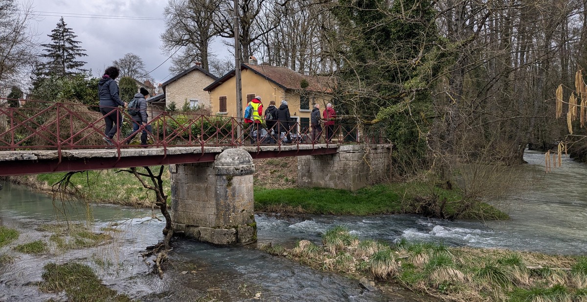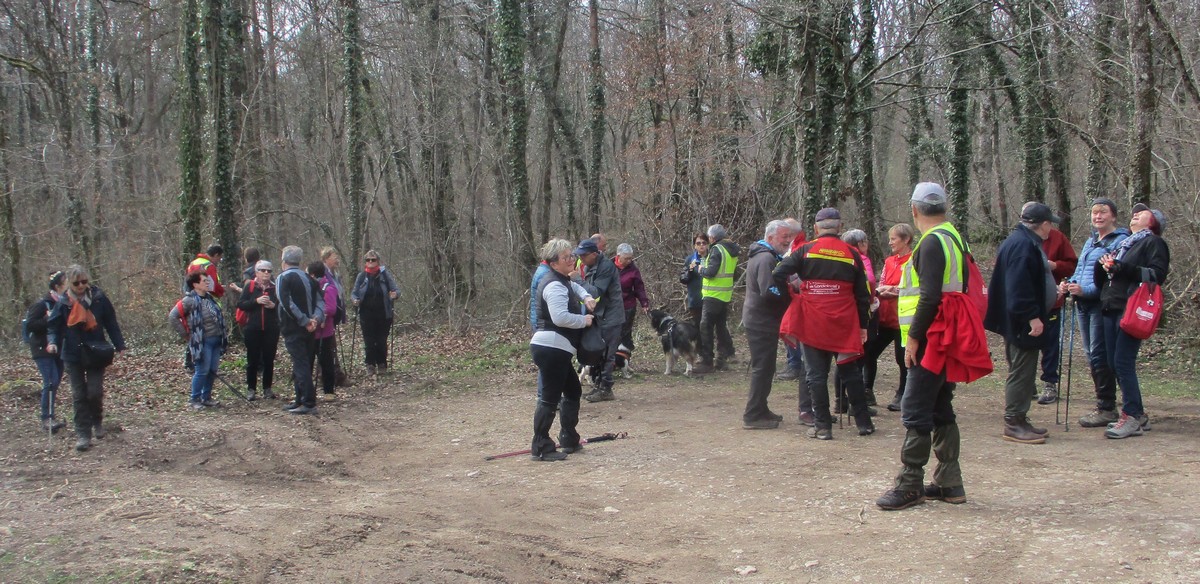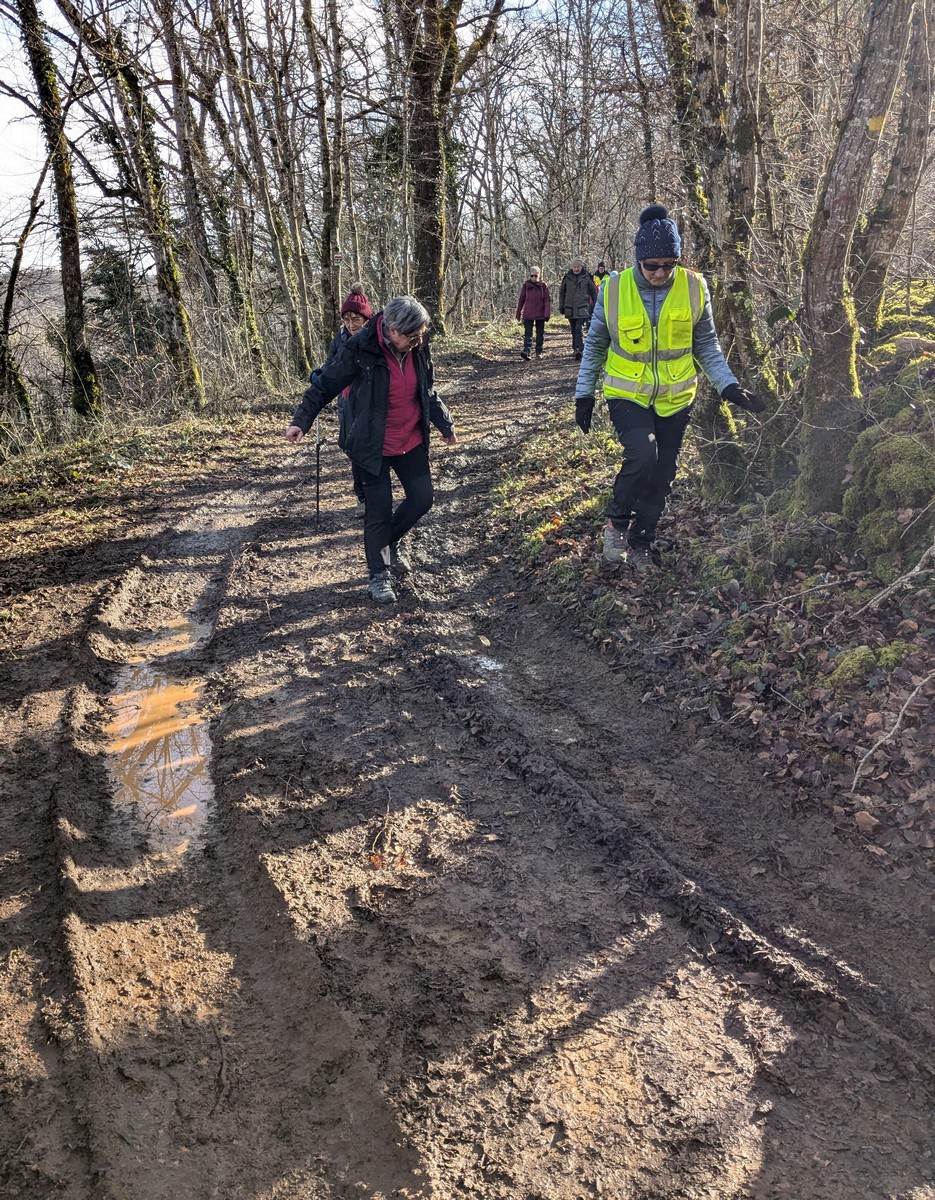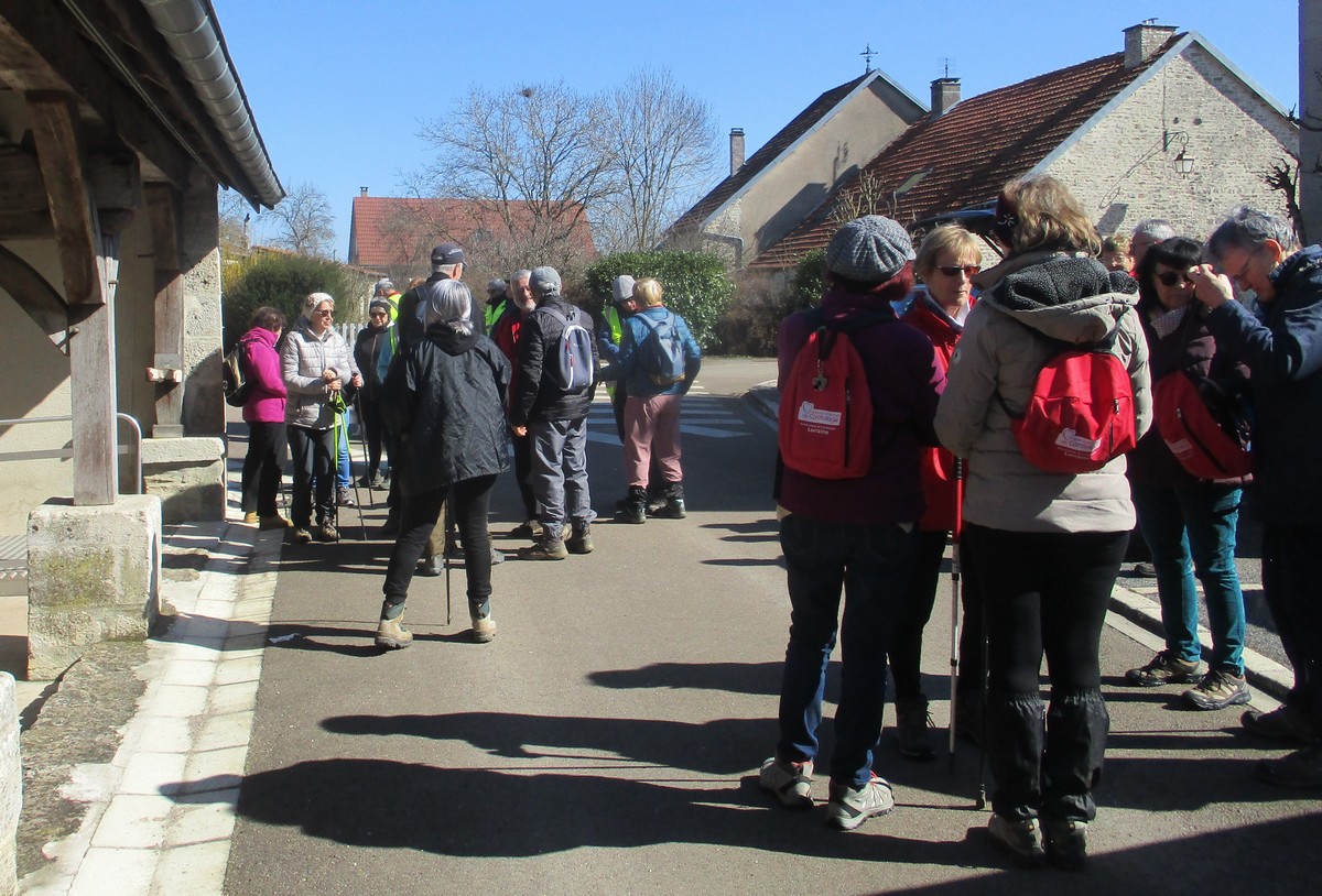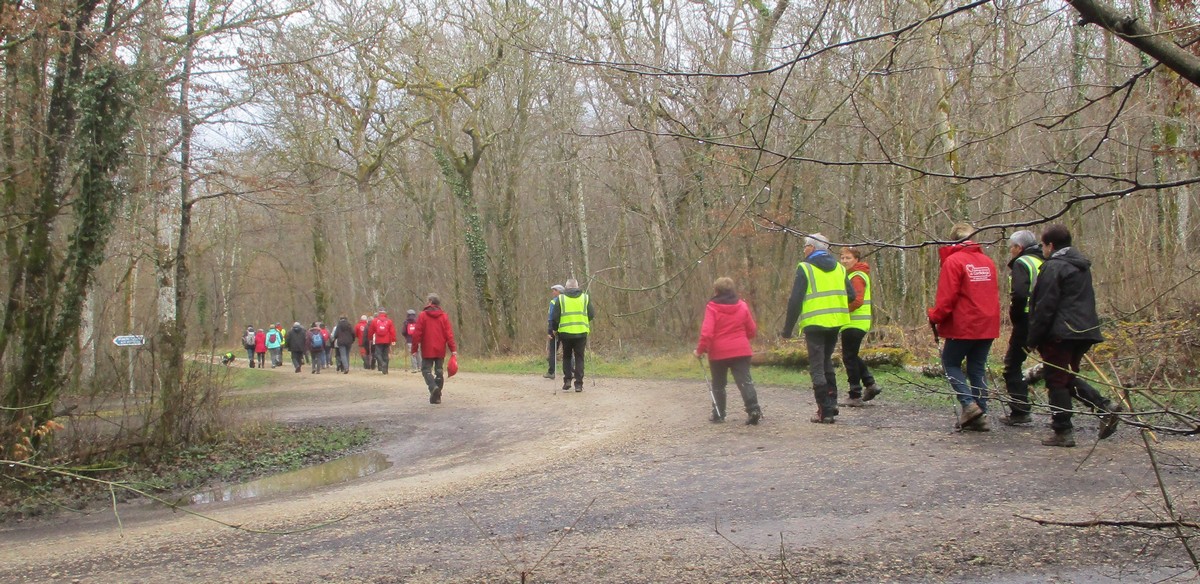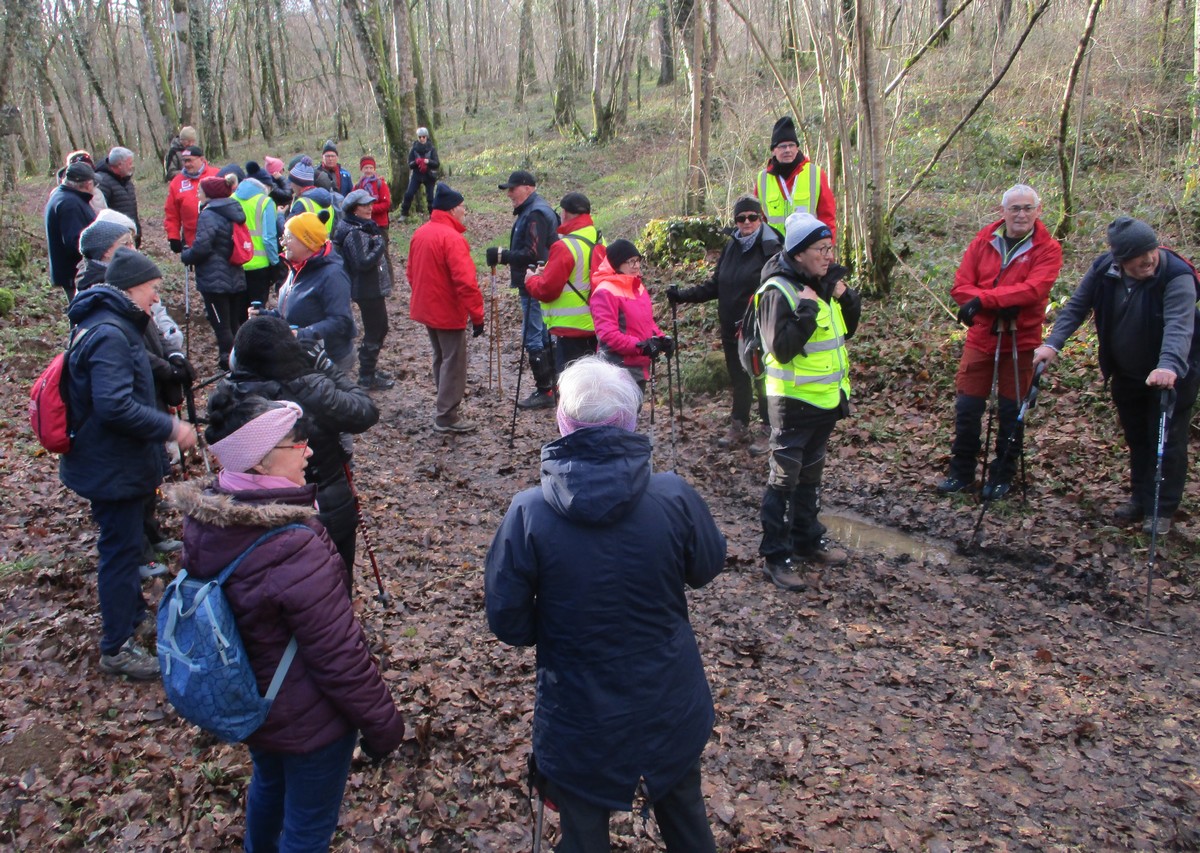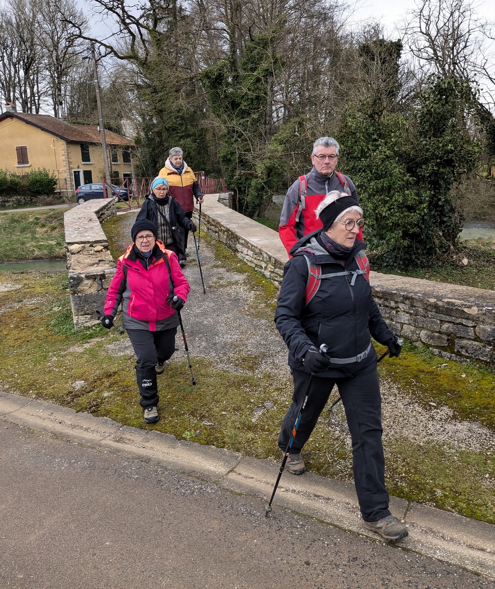 C’est parti pour une marche de 9,8 kms ; nous sommes une bonne vingtaine au départ de Noidant-Le-Rocheux, accompagné d’un ciel bleu. Nous débutons par une montée afin de parcourir notre chemin dans les sous-bois bien gouillasseux, qui nous mènent sur une plaine, de façon à rejoindre le GR 7 traversant la vallée de la Mouche. Celle-ci est bien humide et encombrée d’arbres tombés par les rafales de vent : « Un vrai parcours du combattant ». Mais aucun ne se « noie dans » un verre d’eau en traversant les rus.