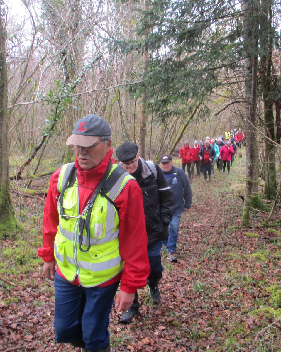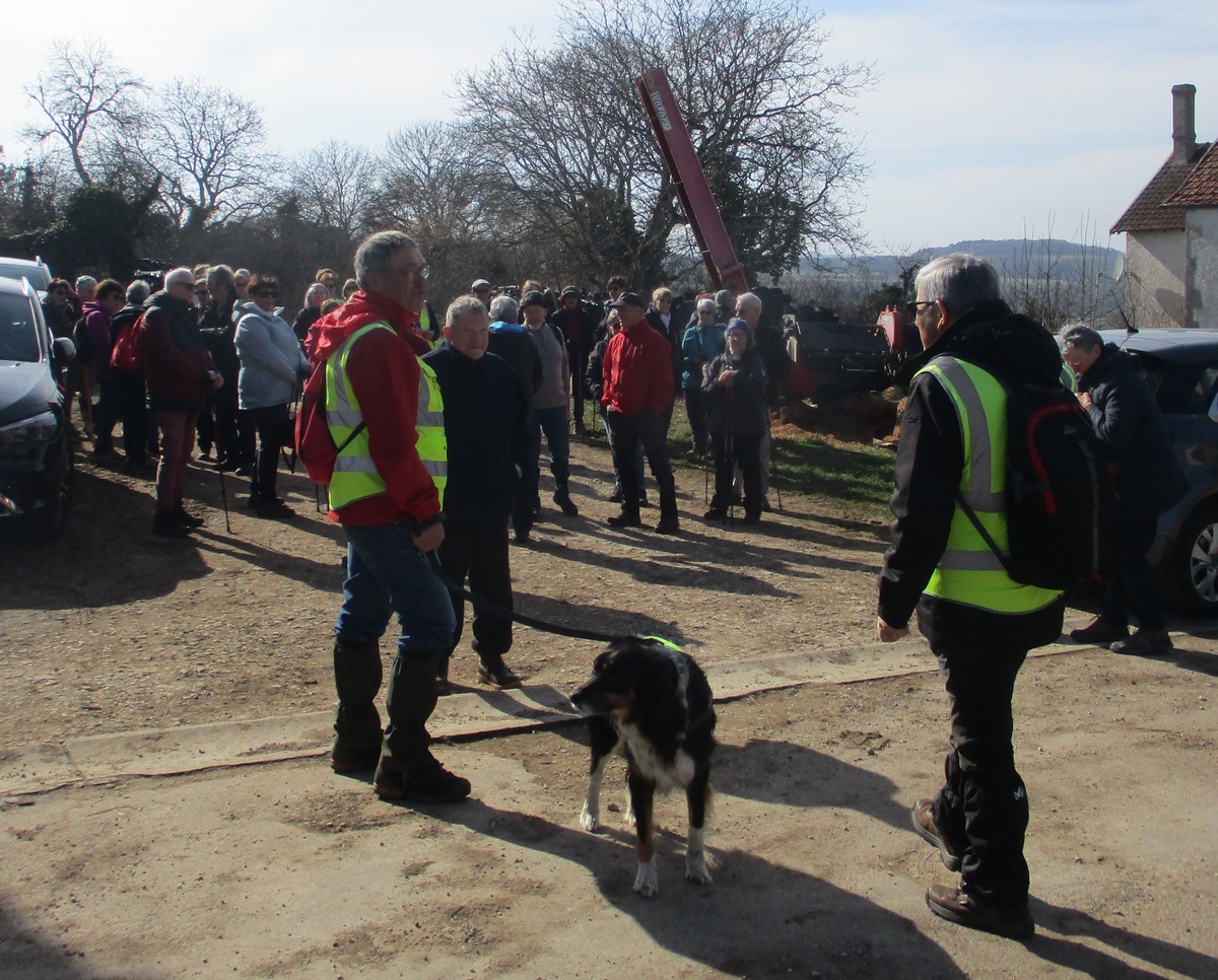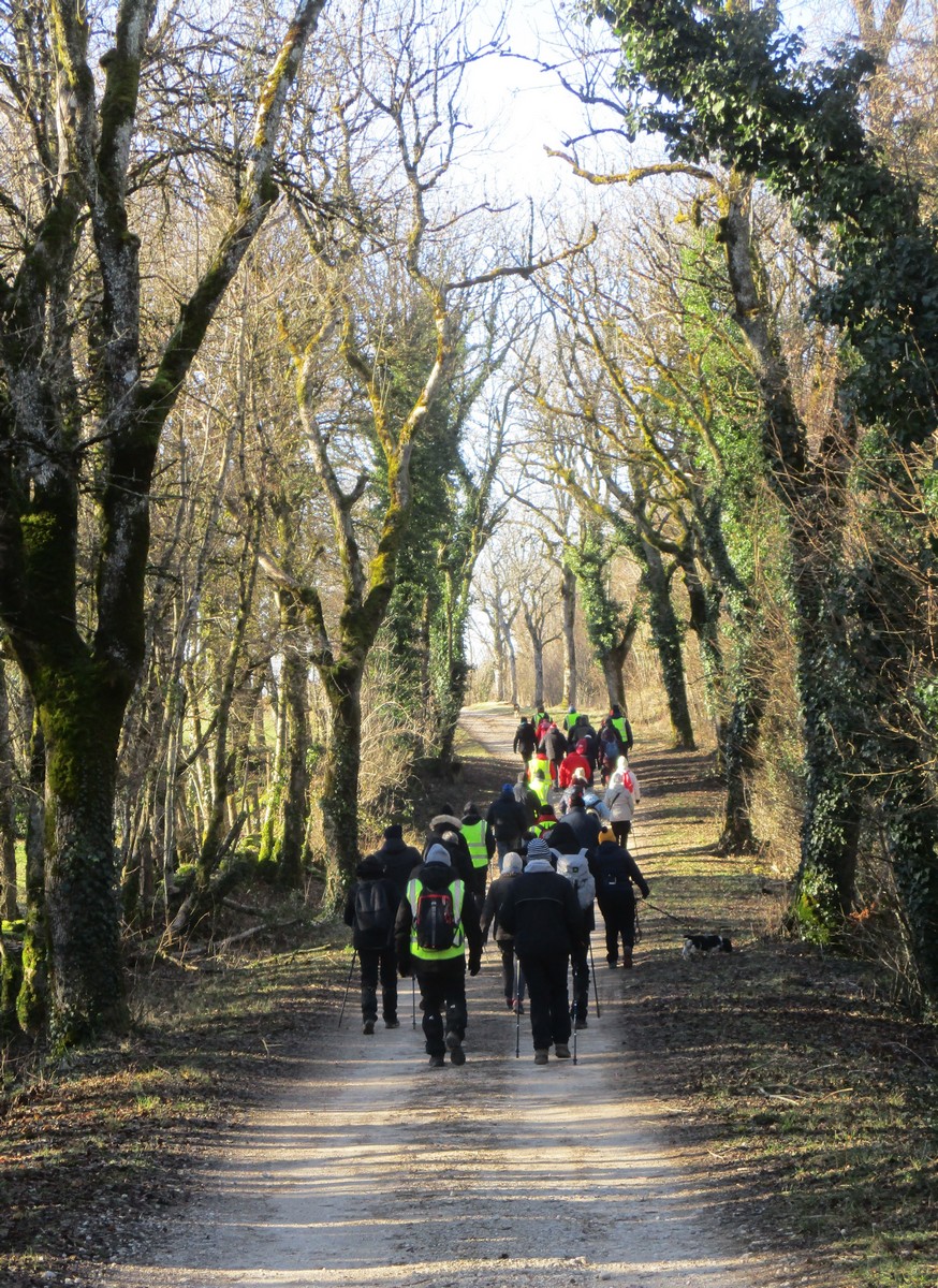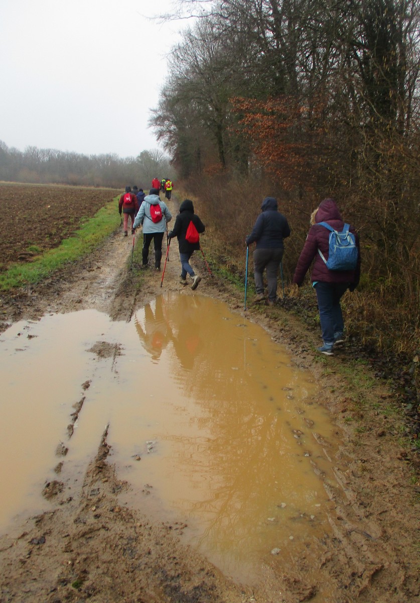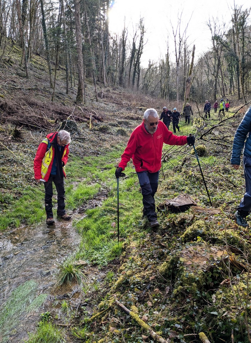 C’est parti pour une marche de 9,8 kms ; nous sommes une bonne vingtaine au départ de Noidant-Le-Rocheux, accompagné d’un ciel bleu. Nous débutons par une montée afin de parcourir notre chemin dans les sous-bois bien gouillasseux, qui nous mènent sur une plaine, de façon à rejoindre le GR 7 traversant la vallée de la Mouche. Celle-ci est bien humide et encombrée d’arbres tombés par les rafales de vent : « Un vrai parcours du combattant ». Mais aucun ne se « noie dans » un verre d’eau en traversant les rus.