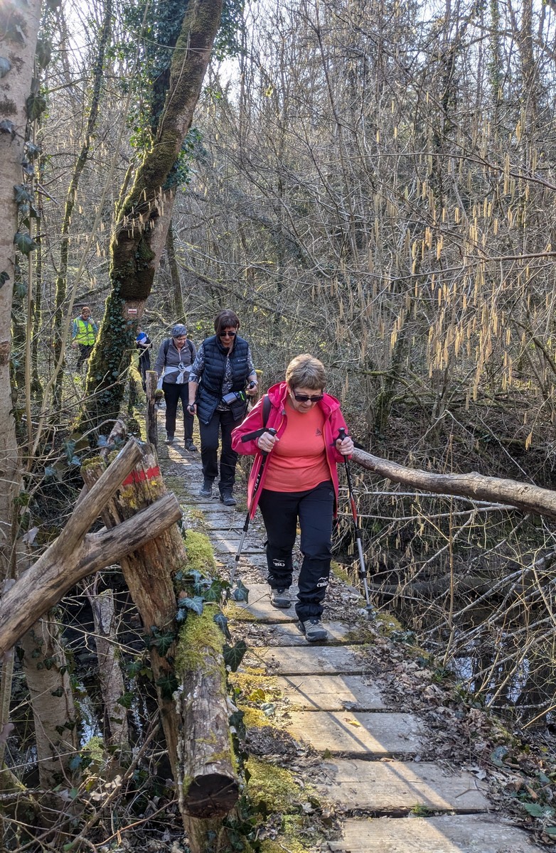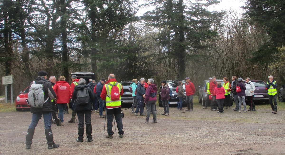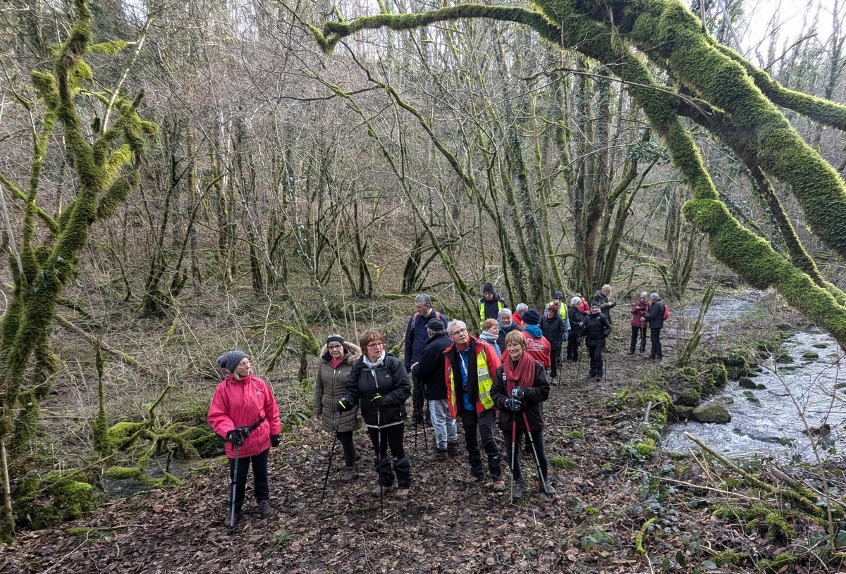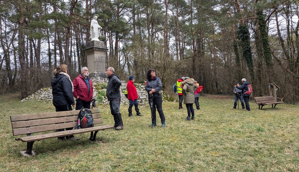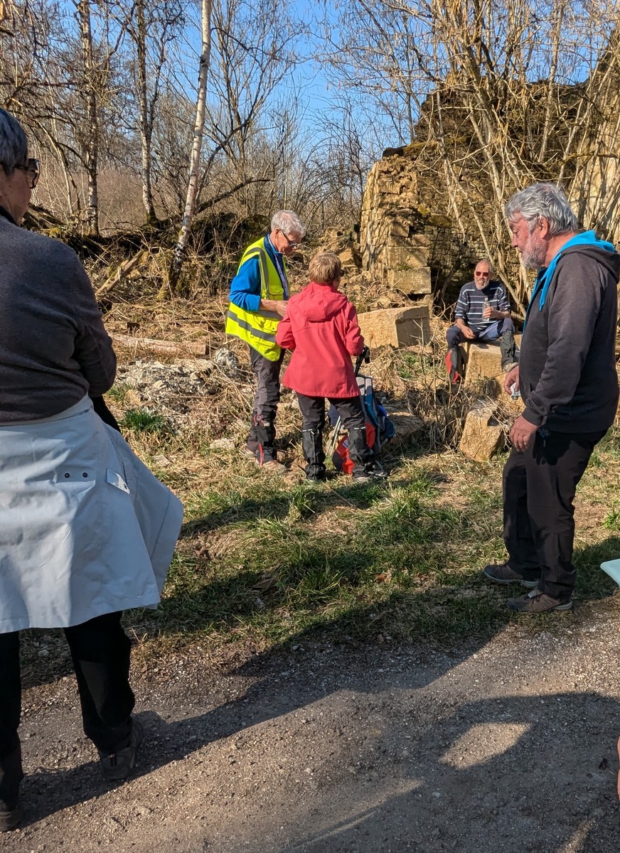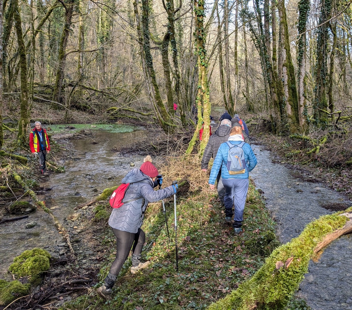 C’est parti pour une marche de 9,8 kms ; nous sommes une bonne vingtaine au départ de Noidant-Le-Rocheux, accompagné d’un ciel bleu. Nous débutons par une montée afin de parcourir notre chemin dans les sous-bois bien gouillasseux, qui nous mènent sur une plaine, de façon à rejoindre le GR 7 traversant la vallée de la Mouche. Celle-ci est bien humide et encombrée d’arbres tombés par les rafales de vent : « Un vrai parcours du combattant ». Mais aucun ne se « noie dans » un verre d’eau en traversant les rus.