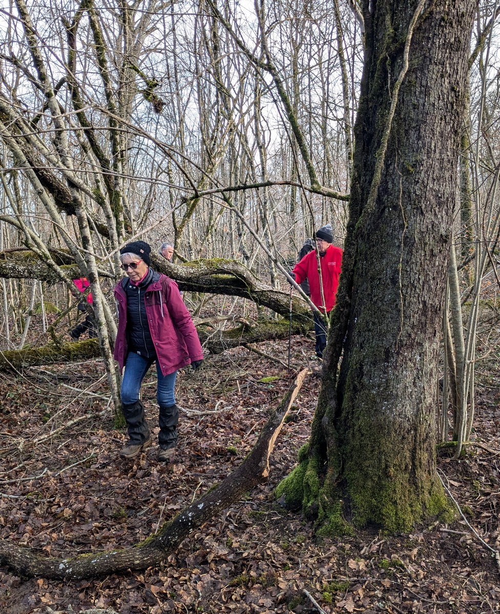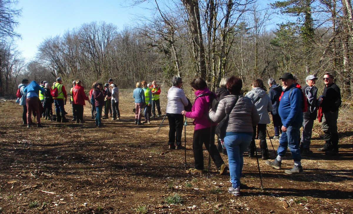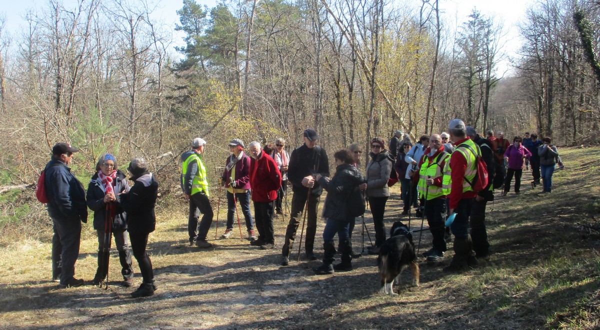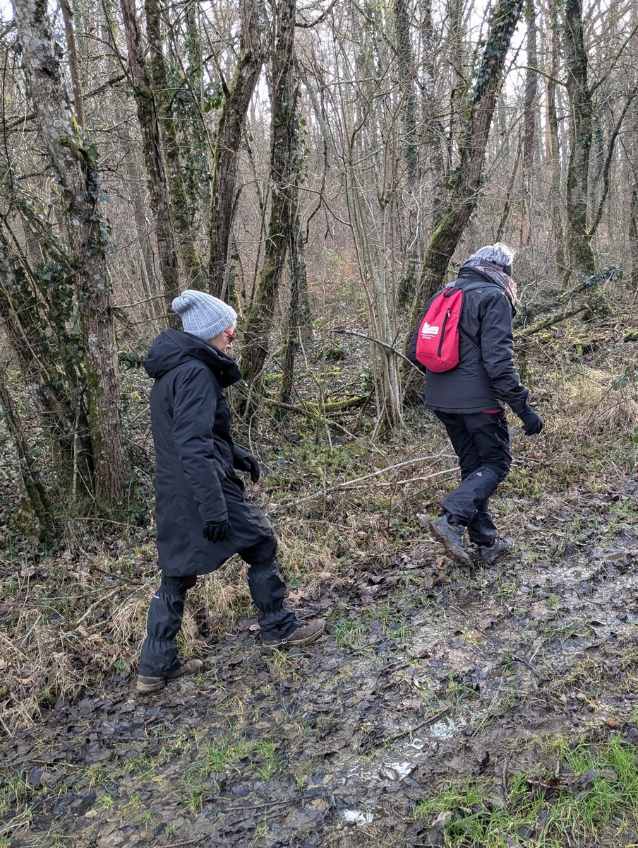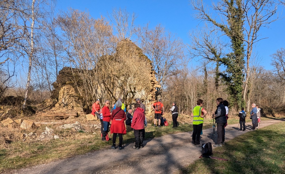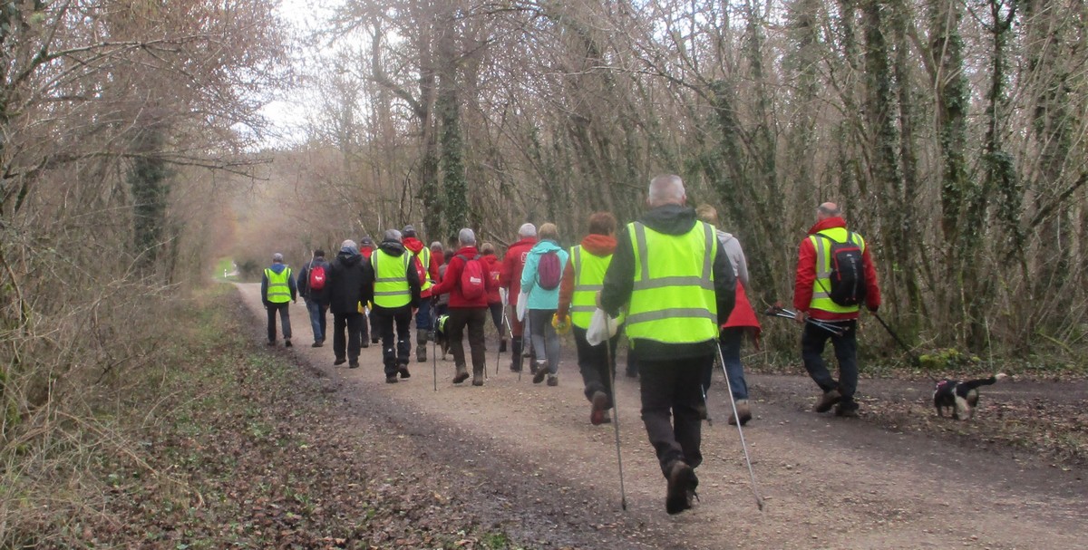 C’est parti pour une marche de 9,8 kms ; nous sommes une bonne vingtaine au départ de Noidant-Le-Rocheux, accompagné d’un ciel bleu. Nous débutons par une montée afin de parcourir notre chemin dans les sous-bois bien gouillasseux, qui nous mènent sur une plaine, de façon à rejoindre le GR 7 traversant la vallée de la Mouche. Celle-ci est bien humide et encombrée d’arbres tombés par les rafales de vent : « Un vrai parcours du combattant ». Mais aucun ne se « noie dans » un verre d’eau en traversant les rus.