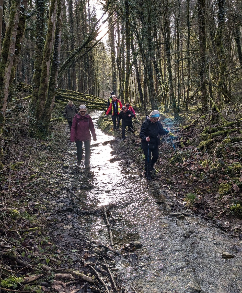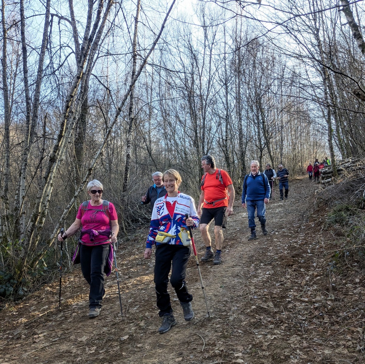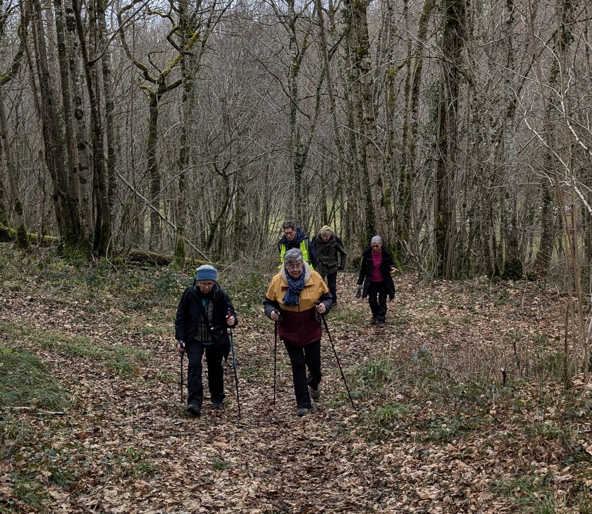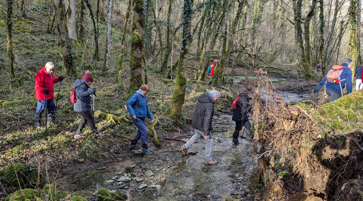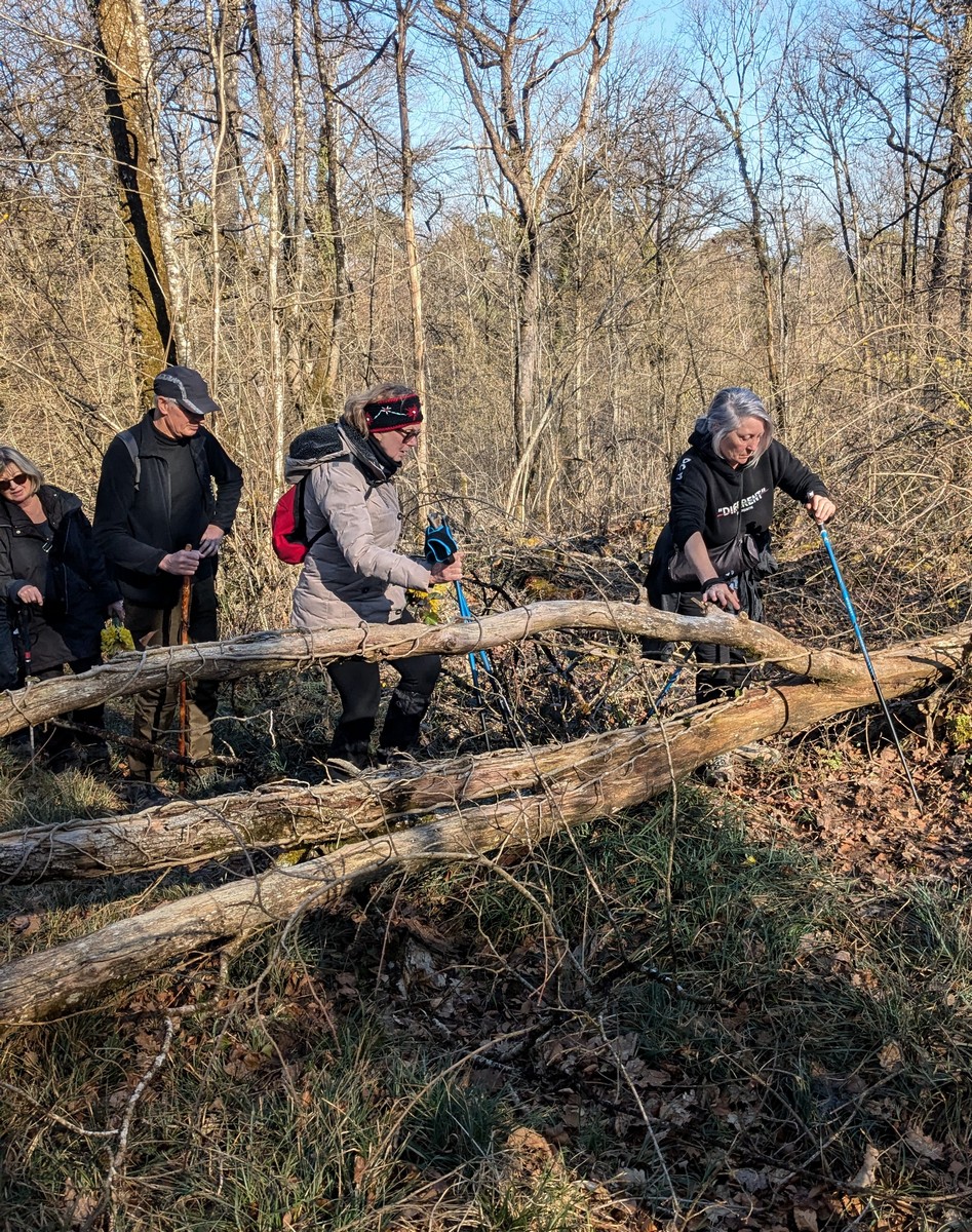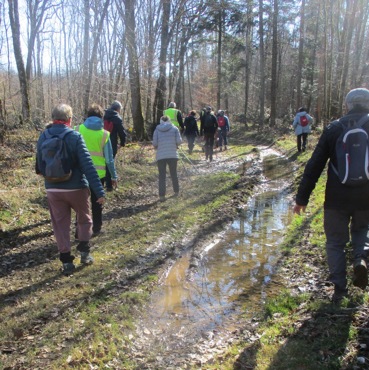 C’est parti pour une marche de 9,8 kms ; nous sommes une bonne vingtaine au départ de Noidant-Le-Rocheux, accompagné d’un ciel bleu. Nous débutons par une montée afin de parcourir notre chemin dans les sous-bois bien gouillasseux, qui nous mènent sur une plaine, de façon à rejoindre le GR 7 traversant la vallée de la Mouche. Celle-ci est bien humide et encombrée d’arbres tombés par les rafales de vent : « Un vrai parcours du combattant ». Mais aucun ne se « noie dans » un verre d’eau en traversant les rus.