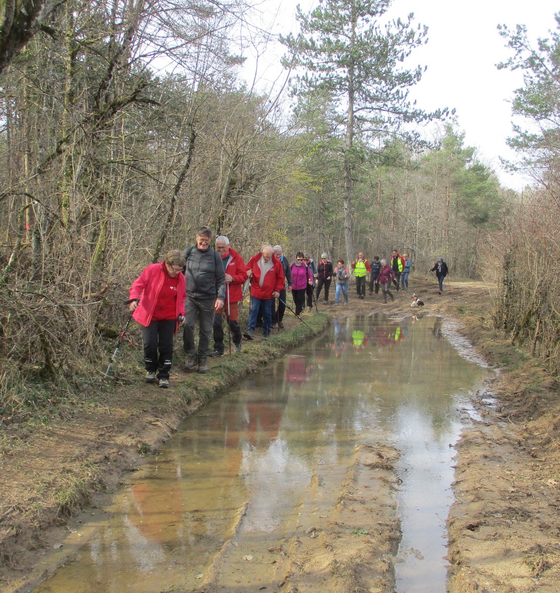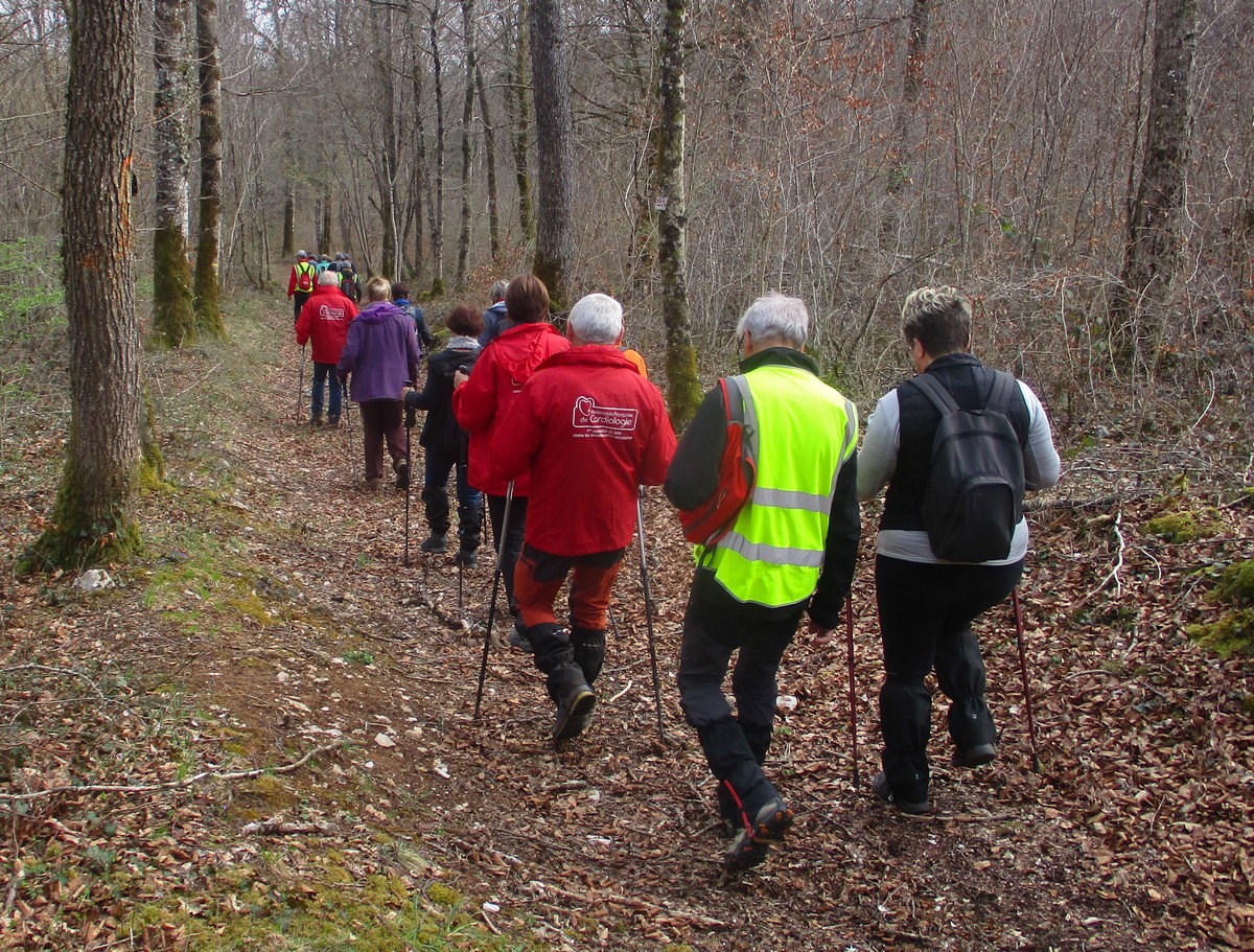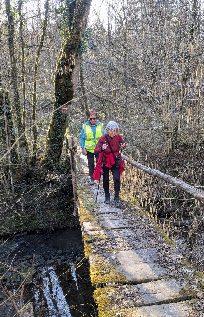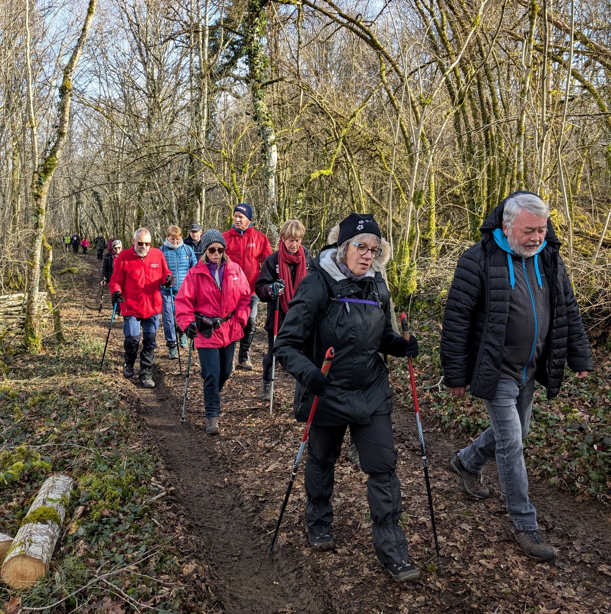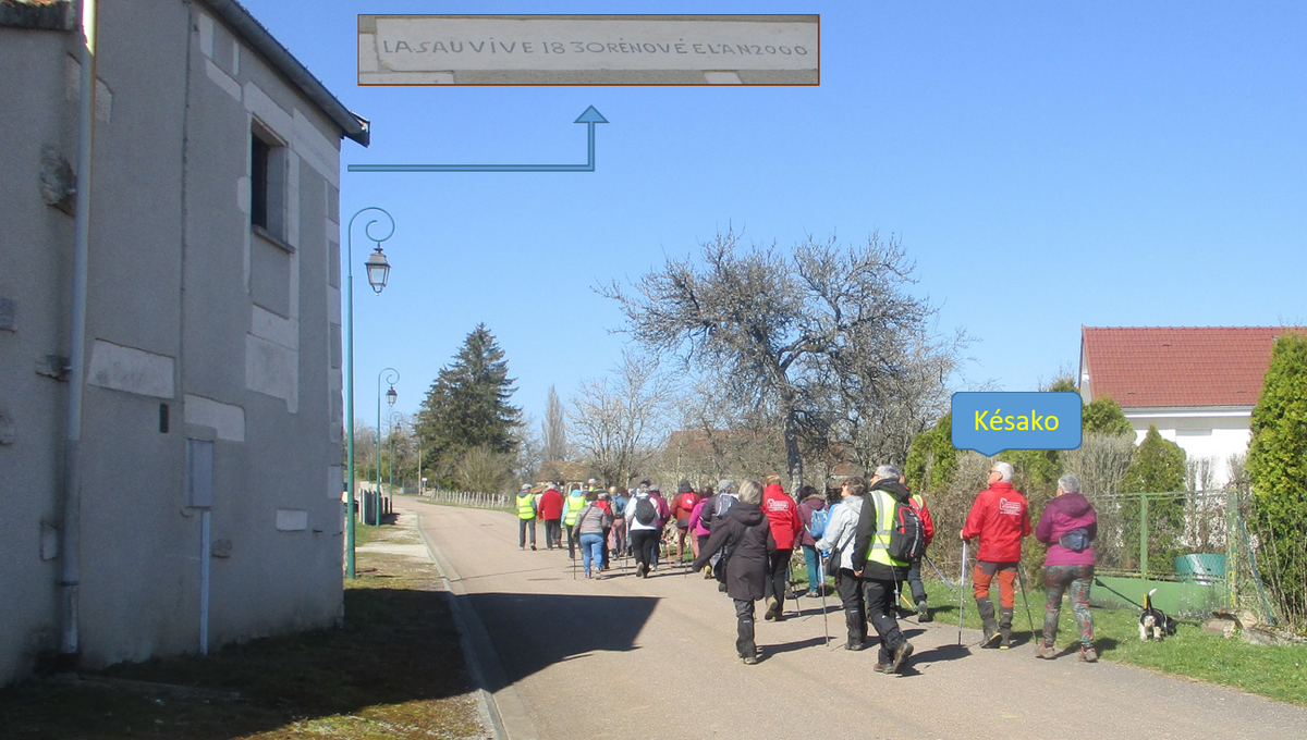 C’est parti pour une marche de 9,8 kms ; nous sommes une bonne vingtaine au départ de Noidant-Le-Rocheux, accompagné d’un ciel bleu. Nous débutons par une montée afin de parcourir notre chemin dans les sous-bois bien gouillasseux, qui nous mènent sur une plaine, de façon à rejoindre le GR 7 traversant la vallée de la Mouche. Celle-ci est bien humide et encombrée d’arbres tombés par les rafales de vent : « Un vrai parcours du combattant ». Mais aucun ne se « noie dans » un verre d’eau en traversant les rus.
