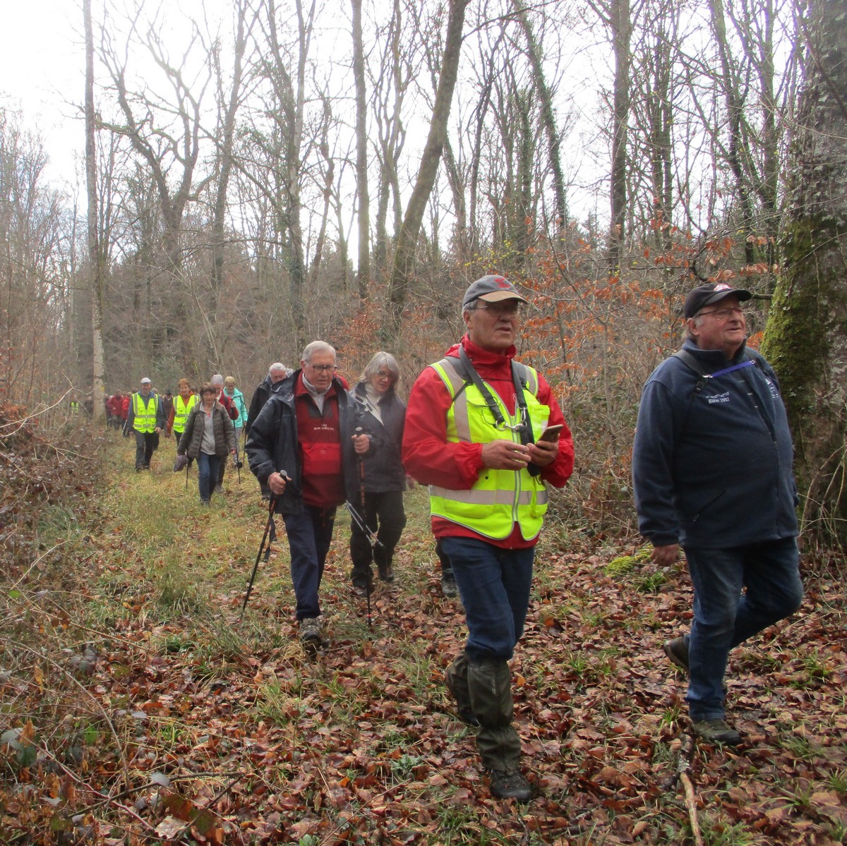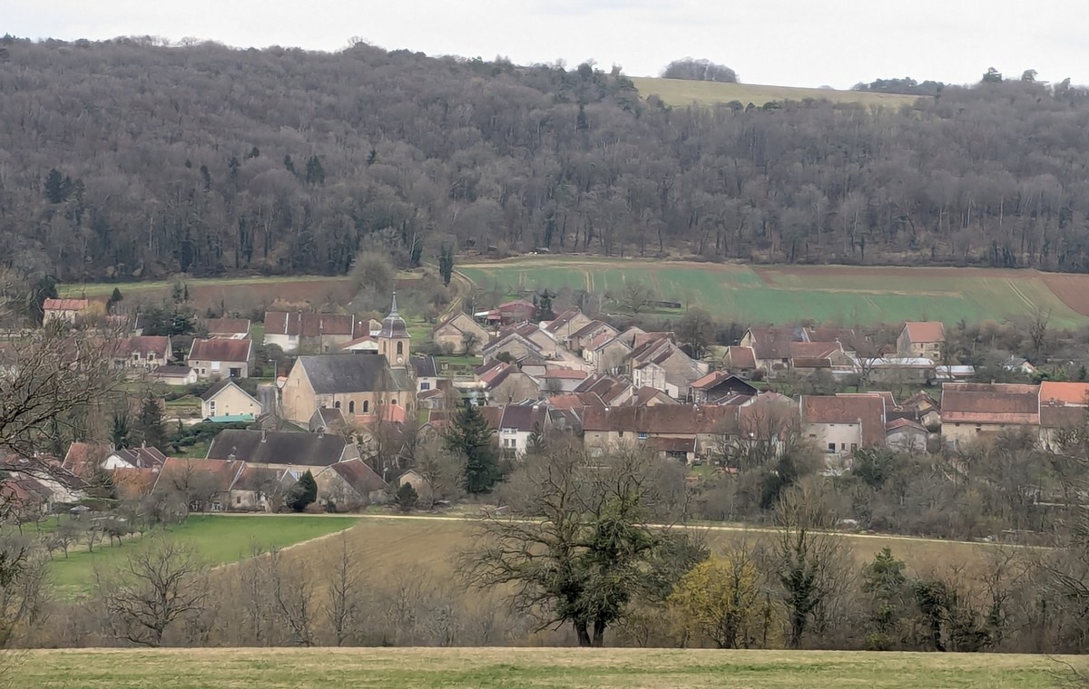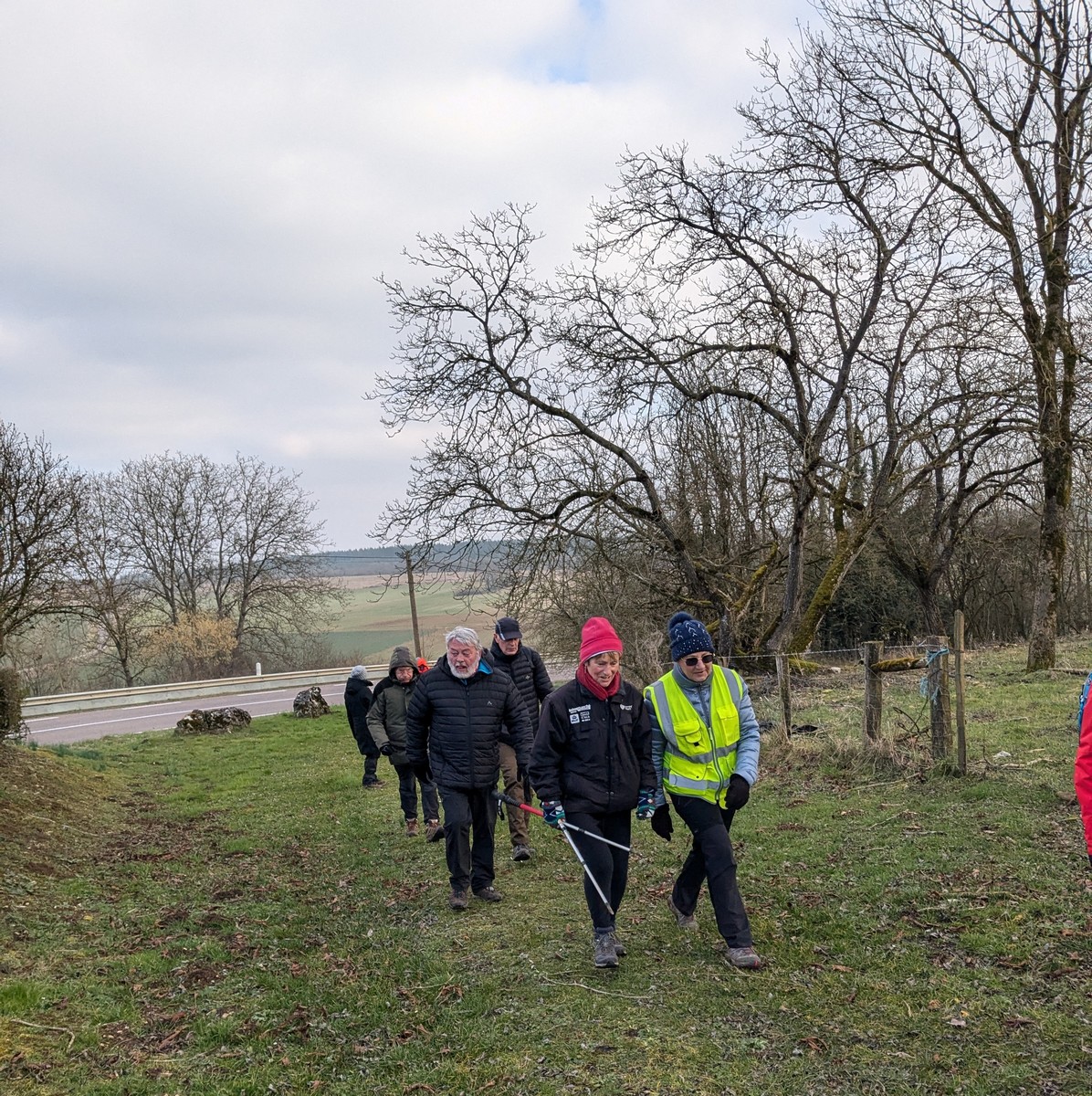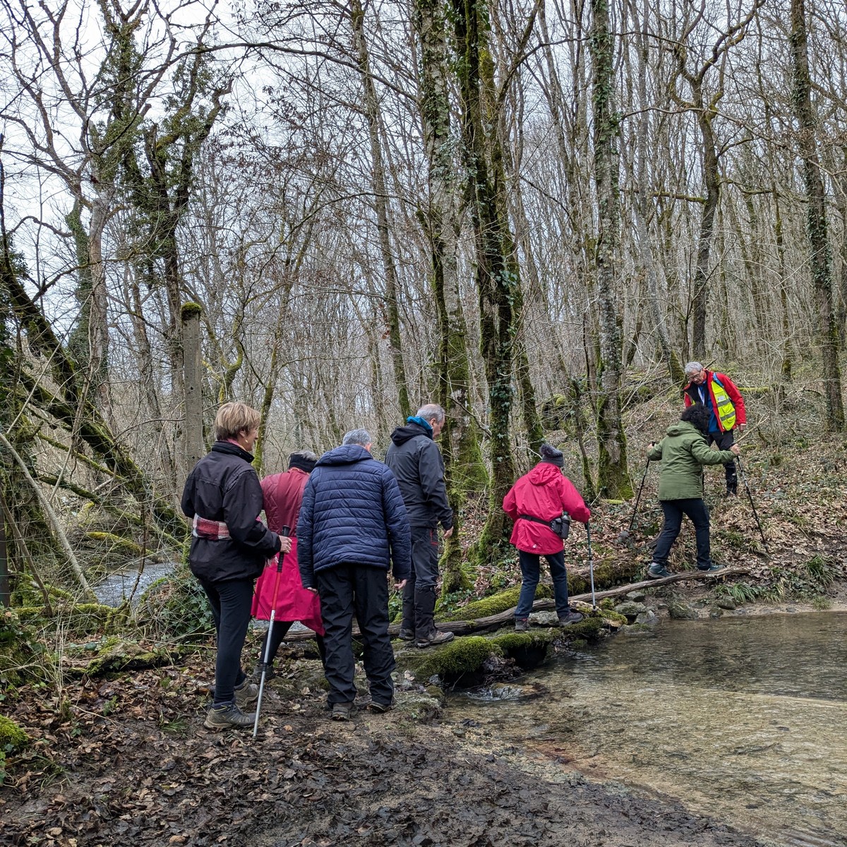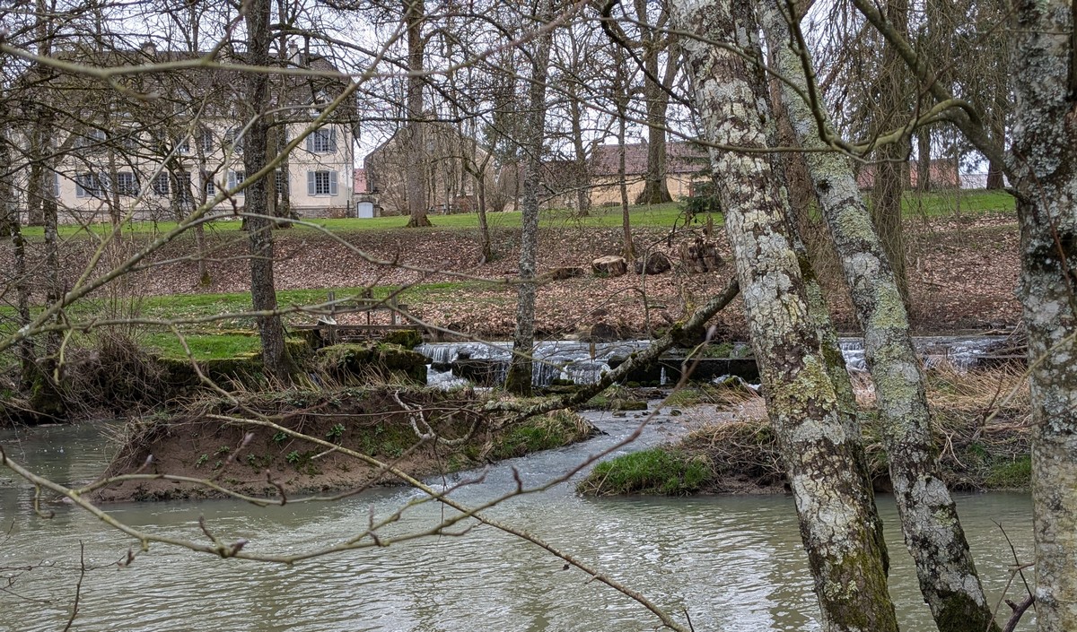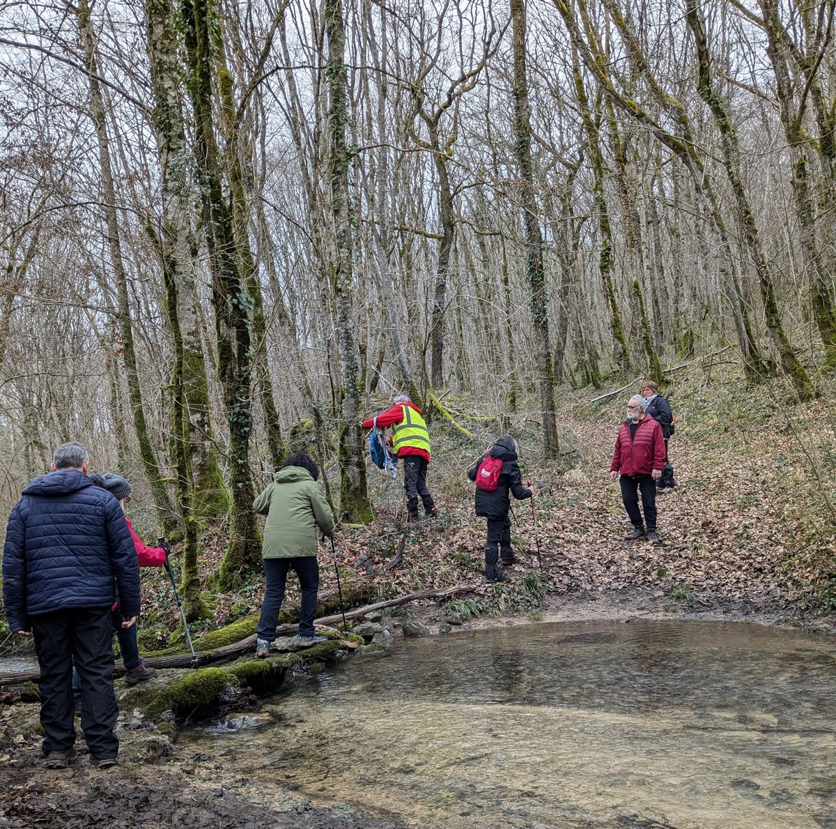 C’est parti pour une marche de 9,8 kms ; nous sommes une bonne vingtaine au départ de Noidant-Le-Rocheux, accompagné d’un ciel bleu. Nous débutons par une montée afin de parcourir notre chemin dans les sous-bois bien gouillasseux, qui nous mènent sur une plaine, de façon à rejoindre le GR 7 traversant la vallée de la Mouche. Celle-ci est bien humide et encombrée d’arbres tombés par les rafales de vent : « Un vrai parcours du combattant ». Mais aucun ne se « noie dans » un verre d’eau en traversant les rus.