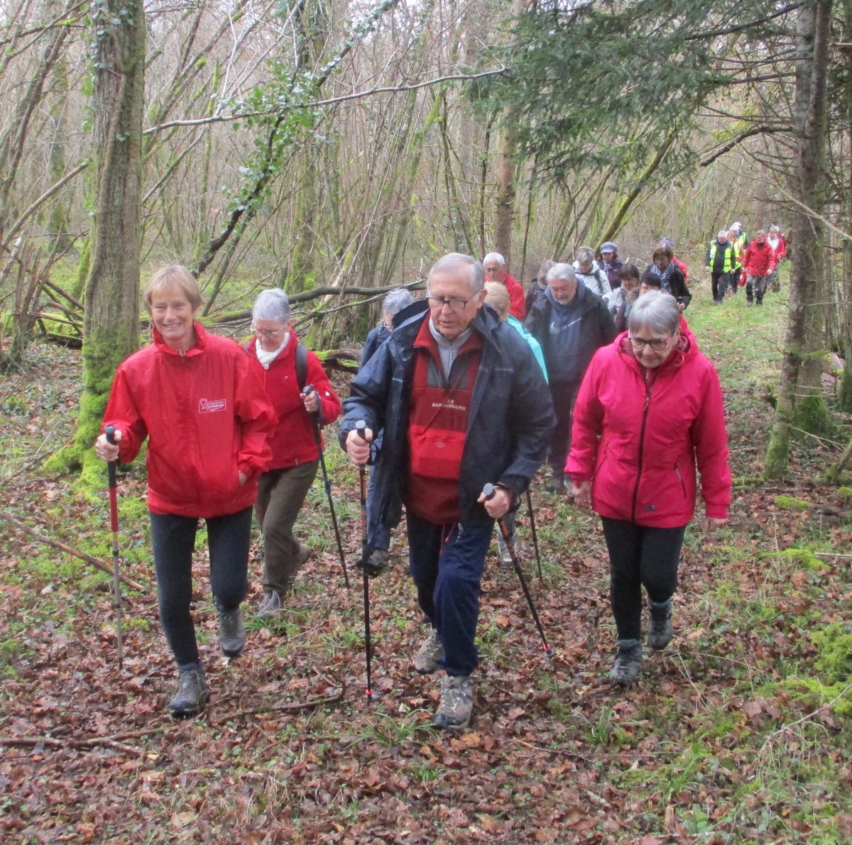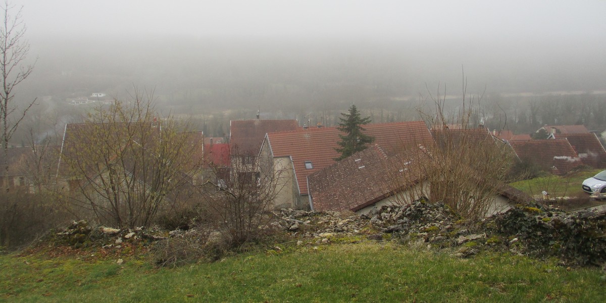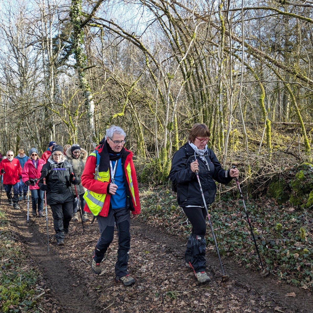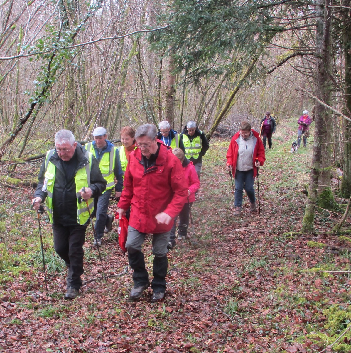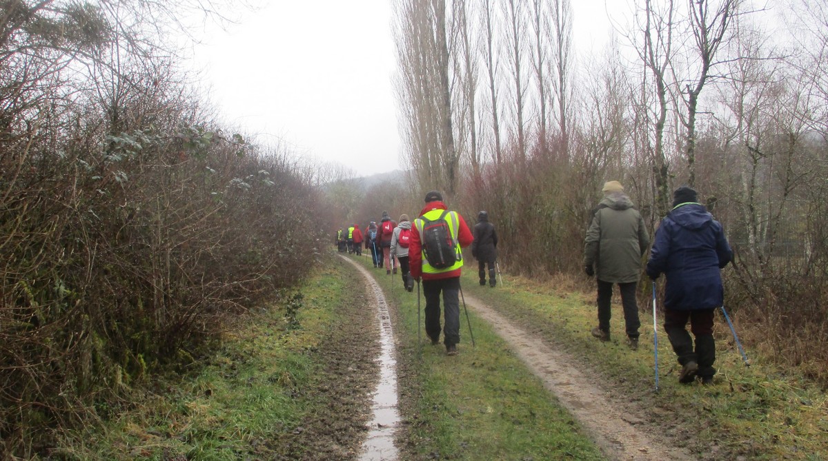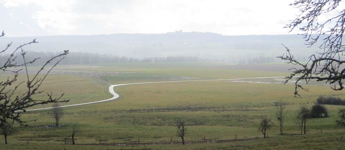 C’est parti pour une marche de 9,8 kms ; nous sommes une bonne vingtaine au départ de Noidant-Le-Rocheux, accompagné d’un ciel bleu. Nous débutons par une montée afin de parcourir notre chemin dans les sous-bois bien gouillasseux, qui nous mènent sur une plaine, de façon à rejoindre le GR 7 traversant la vallée de la Mouche. Celle-ci est bien humide et encombrée d’arbres tombés par les rafales de vent : « Un vrai parcours du combattant ». Mais aucun ne se « noie dans » un verre d’eau en traversant les rus.