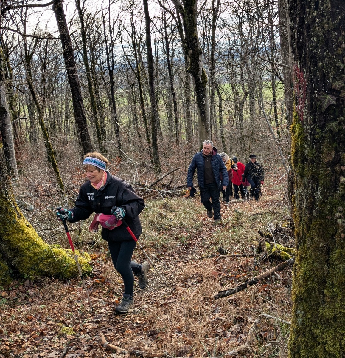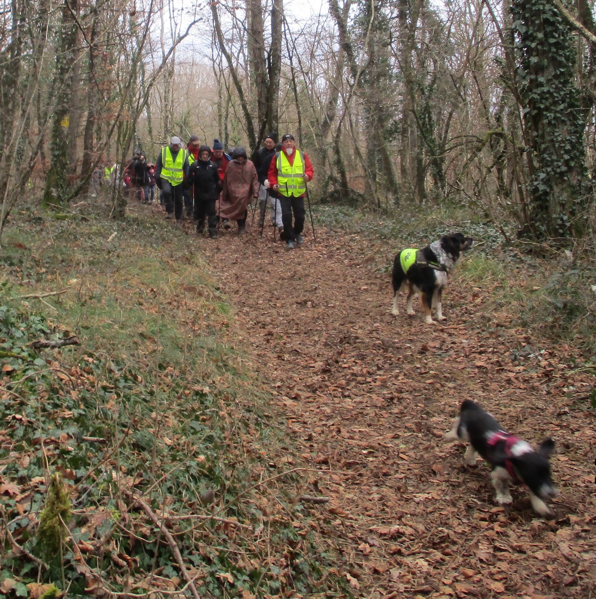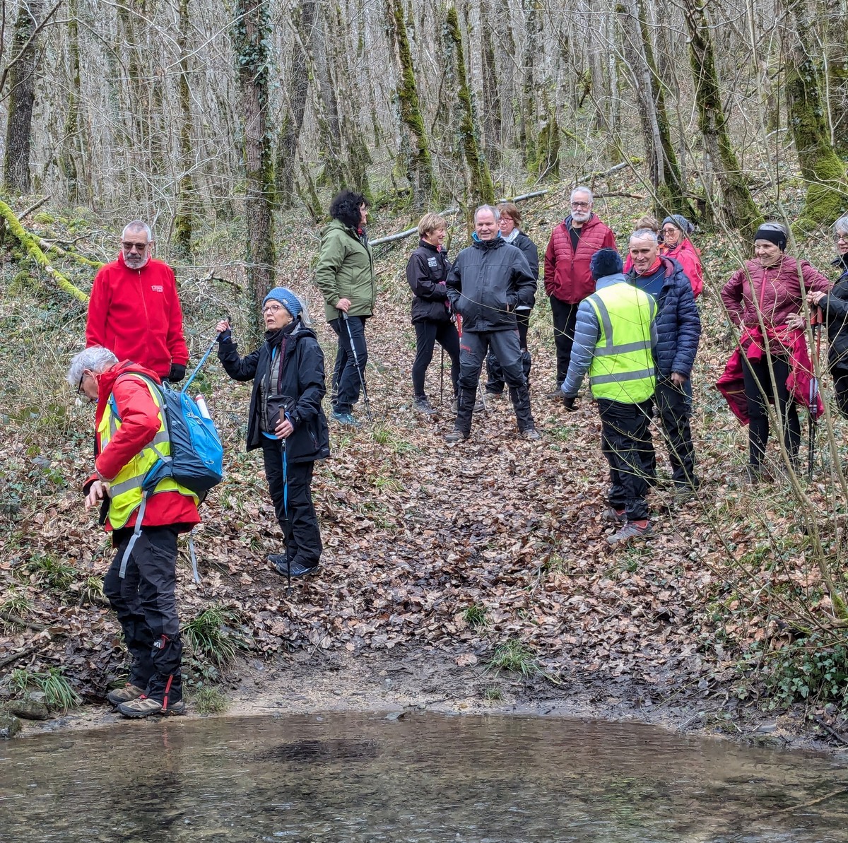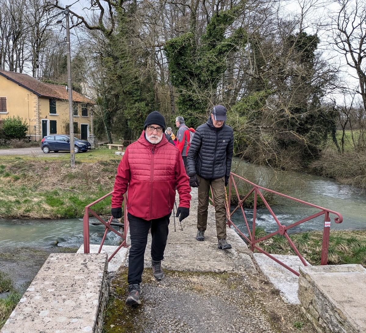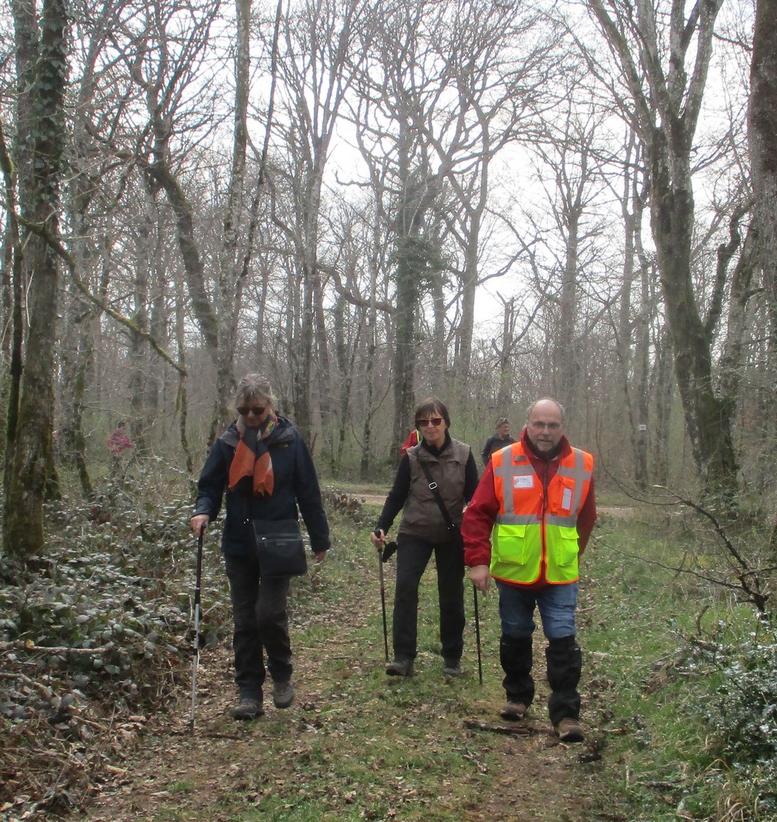 C’est parti pour une marche de 9,8 kms ; nous sommes une bonne vingtaine au départ de Noidant-Le-Rocheux, accompagné d’un ciel bleu. Nous débutons par une montée afin de parcourir notre chemin dans les sous-bois bien gouillasseux, qui nous mènent sur une plaine, de façon à rejoindre le GR 7 traversant la vallée de la Mouche. Celle-ci est bien humide et encombrée d’arbres tombés par les rafales de vent : « Un vrai parcours du combattant ». Mais aucun ne se « noie dans » un verre d’eau en traversant les rus.