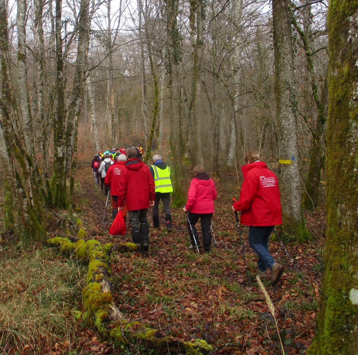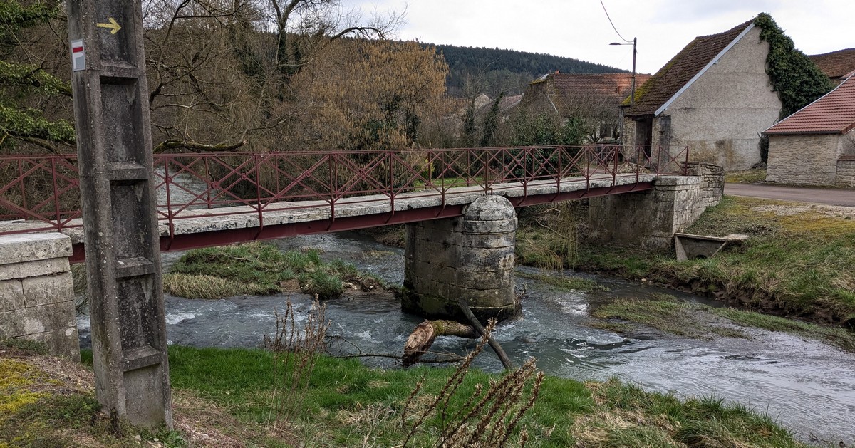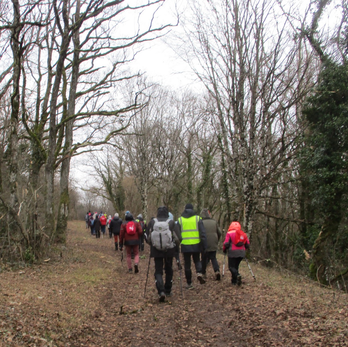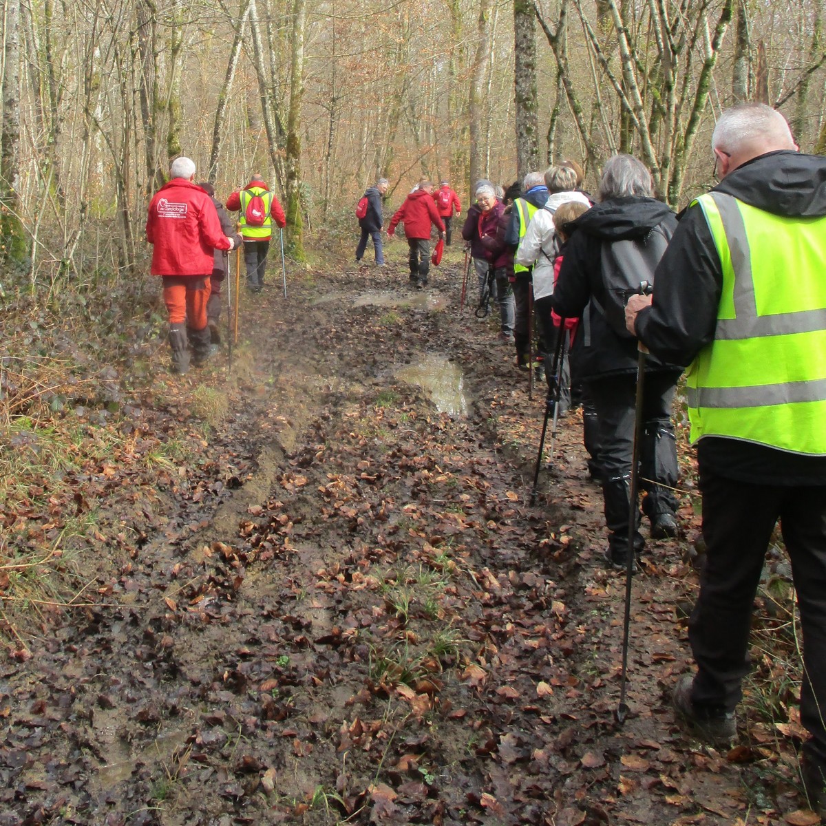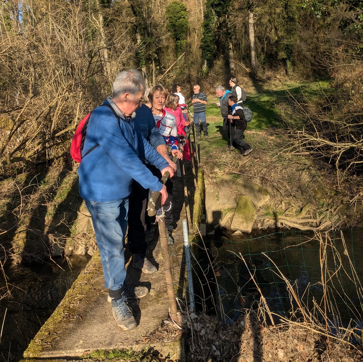 C’est parti pour une marche de 9,8 kms ; nous sommes une bonne vingtaine au départ de Noidant-Le-Rocheux, accompagné d’un ciel bleu. Nous débutons par une montée afin de parcourir notre chemin dans les sous-bois bien gouillasseux, qui nous mènent sur une plaine, de façon à rejoindre le GR 7 traversant la vallée de la Mouche. Celle-ci est bien humide et encombrée d’arbres tombés par les rafales de vent : « Un vrai parcours du combattant ». Mais aucun ne se « noie dans » un verre d’eau en traversant les rus.