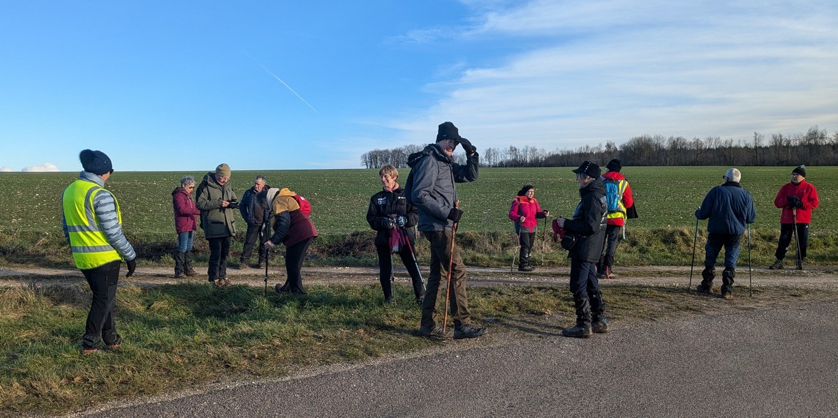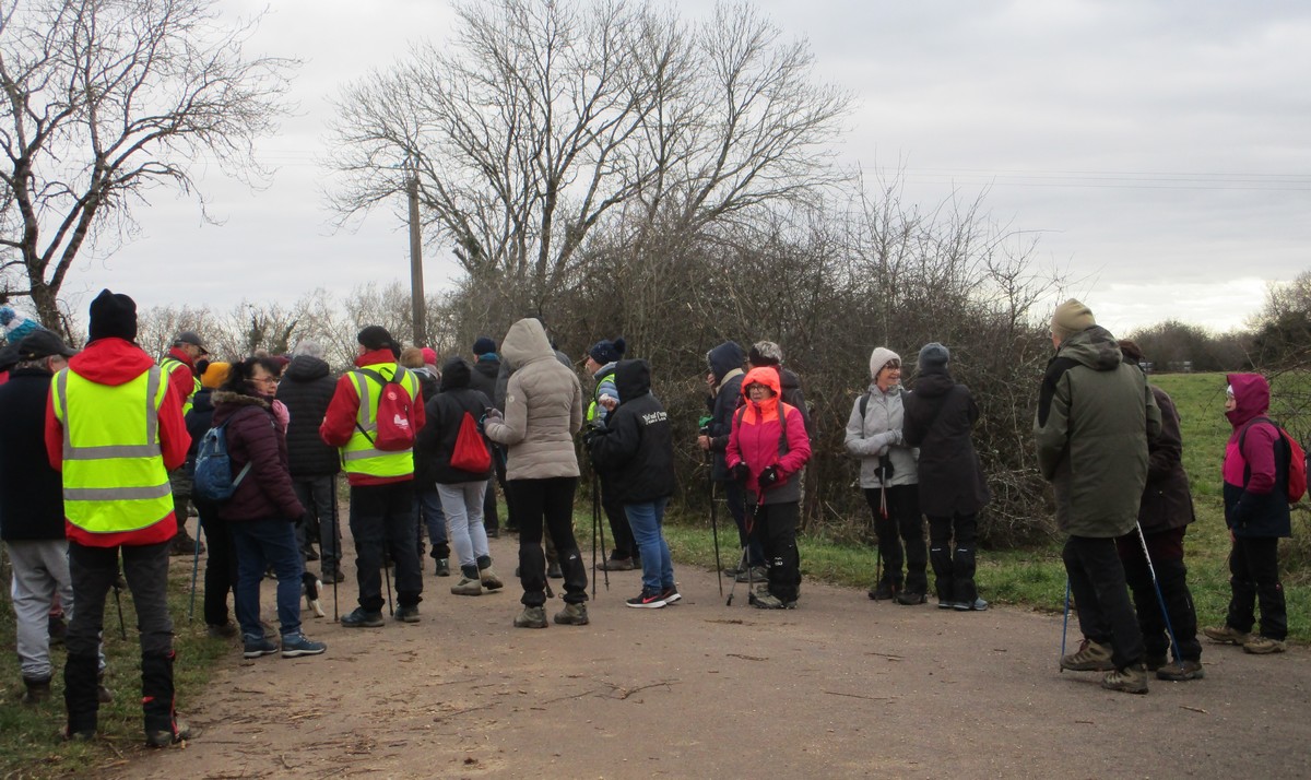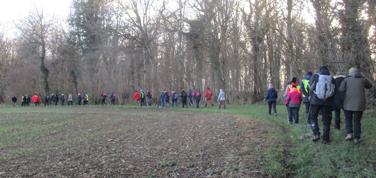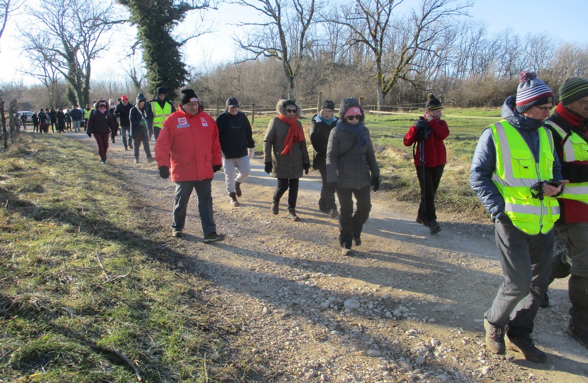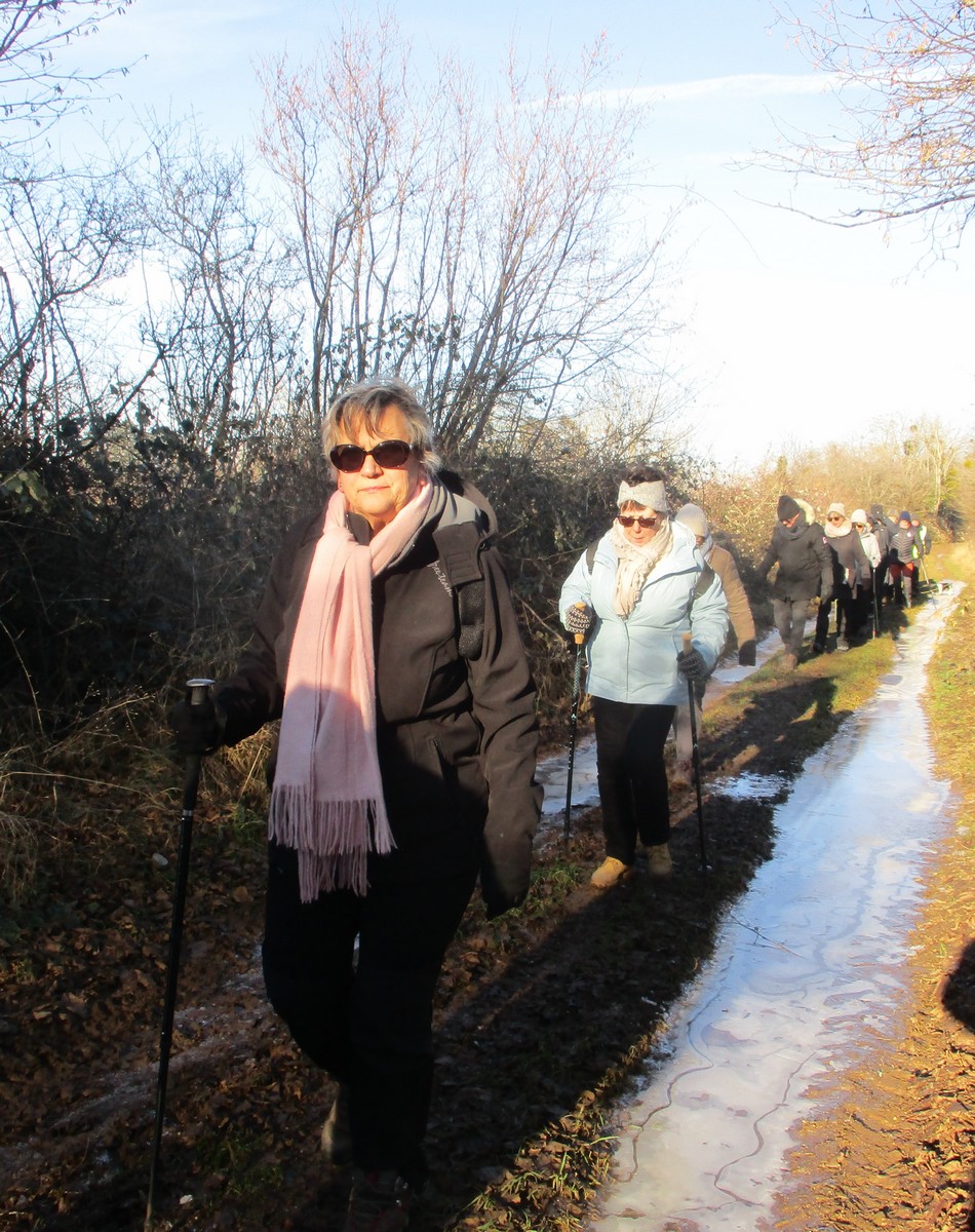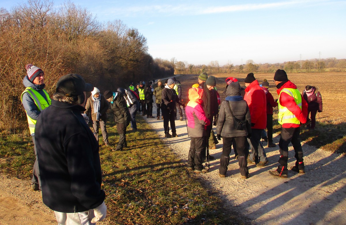 Ce mardi, ça pique un peu : le froid glacial s’installe sous un ciel bleu rayonnant. Temps idéal pour marcher depuis l’entrée du Fort de la Bonnelle. Heureusement que j’ai eu la bonne idée de planter quelques pancartes indiquant la route pour y accéder, ce qui a permis à quelques-uns d’arriver à bon Fort ! Nous sommes une quarantaine de joyeux lurons bien emmitouflés à démarrer cette petite marche de 5,2kms en direction de Buzon, en passant par l’escargot et à côté de la Chapelle de Chardonville. Violette a retrouvé Bingo. Après avoir marché sur des chemins stabilisés, nous nous engageons dans un sentier quasi-impraticable qui, à défaut d’être « gouillasseux », est plutôt « glaçouilleux ». Tant pis pour les chaussures ; nous évitons quand même de glisser sur les plaques de verglas recouvrant les ornières. A la sortie de la partie boisée, on en profite pour faire la photo de groupe : en fonction de la position du soleil, tout le groupe s’est retrouvé dans le champ où la terre collait aux chaussures. Au bout d’un bon kilomètre, nous retrouvons enfin le stabilisé et nous en profitons alors pour nettoyer sommairement nos godillots sur l’herbe. Nous terminons notre périple jusqu’à l’arrivée, toujours sous le soleil, là où nos voitures gardent l’entrée du Fort !