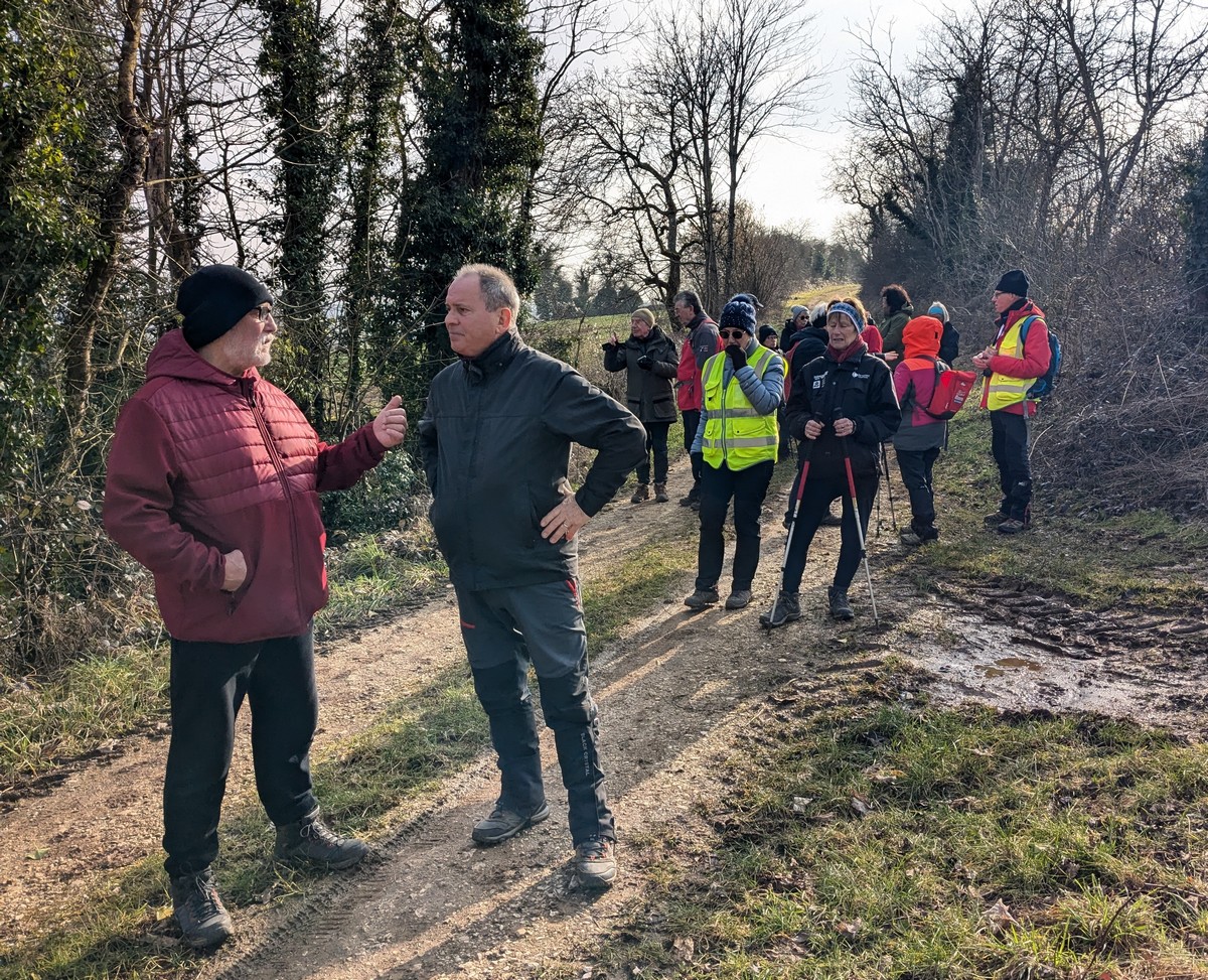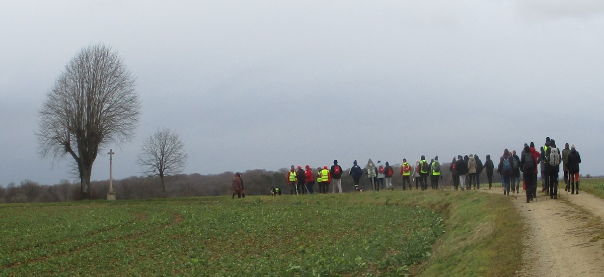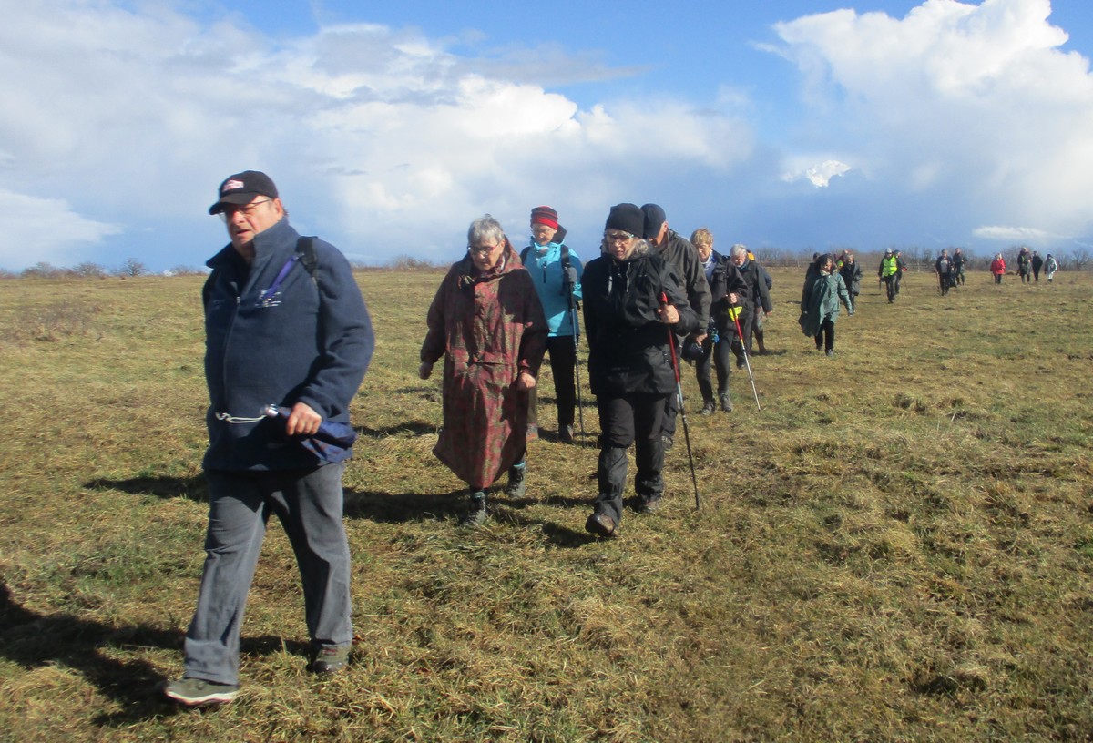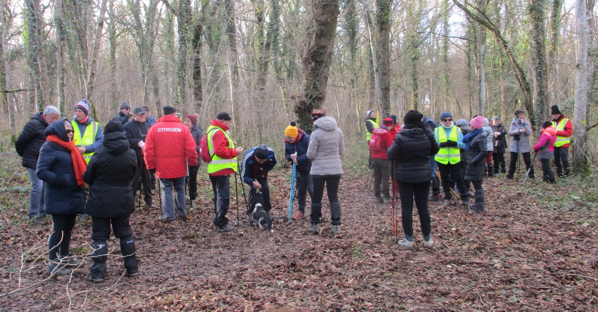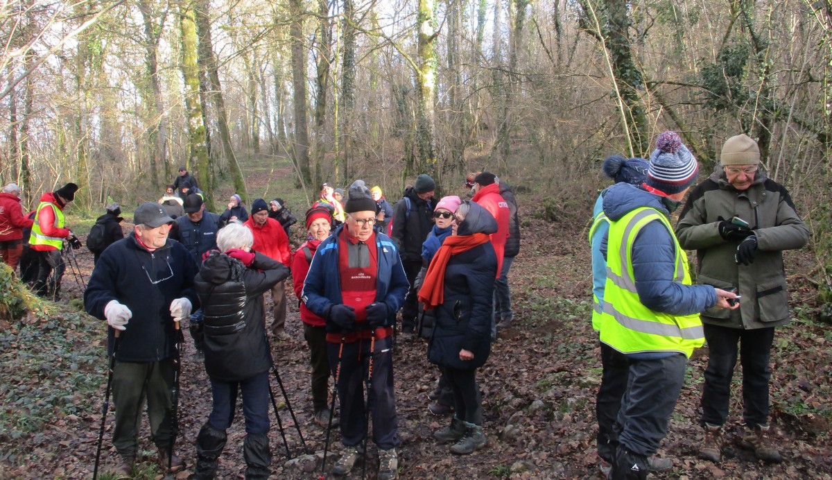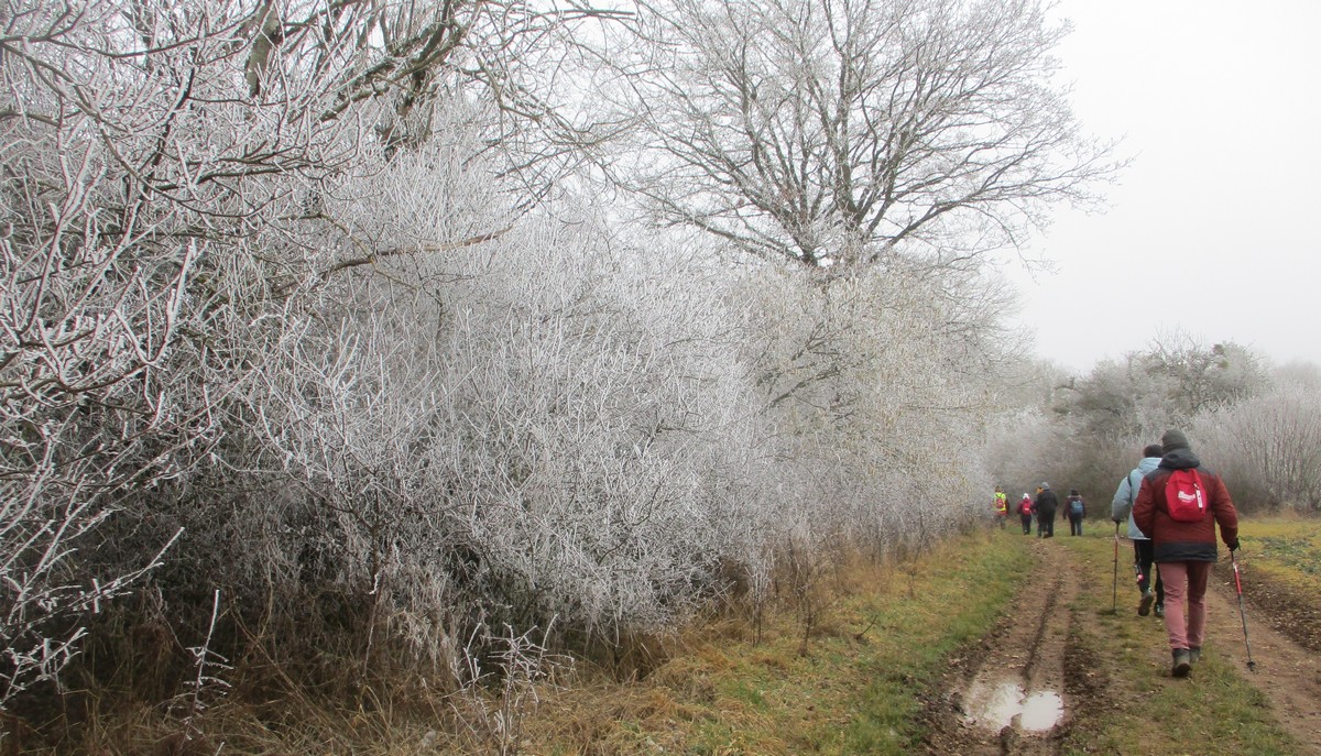 Ce mardi, ça pique un peu : le froid glacial s’installe sous un ciel bleu rayonnant. Temps idéal pour marcher depuis l’entrée du Fort de la Bonnelle. Heureusement que j’ai eu la bonne idée de planter quelques pancartes indiquant la route pour y accéder, ce qui a permis à quelques-uns d’arriver à bon Fort ! Nous sommes une quarantaine de joyeux lurons bien emmitouflés à démarrer cette petite marche de 5,2kms en direction de Buzon, en passant par l’escargot et à côté de la Chapelle de Chardonville. Violette a retrouvé Bingo. Après avoir marché sur des chemins stabilisés, nous nous engageons dans un sentier quasi-impraticable qui, à défaut d’être « gouillasseux », est plutôt « glaçouilleux ». Tant pis pour les chaussures ; nous évitons quand même de glisser sur les plaques de verglas recouvrant les ornières. A la sortie de la partie boisée, on en profite pour faire la photo de groupe : en fonction de la position du soleil, tout le groupe s’est retrouvé dans le champ où la terre collait aux chaussures. Au bout d’un bon kilomètre, nous retrouvons enfin le stabilisé et nous en profitons alors pour nettoyer sommairement nos godillots sur l’herbe. Nous terminons notre périple jusqu’à l’arrivée, toujours sous le soleil, là où nos voitures gardent l’entrée du Fort !