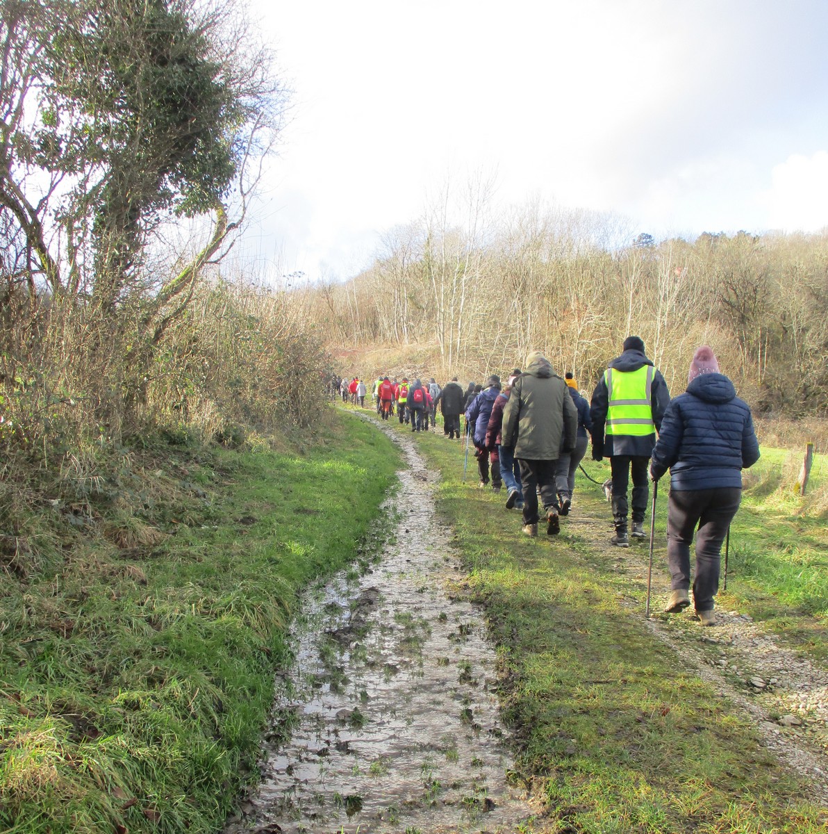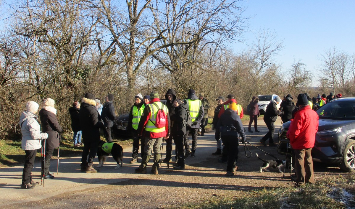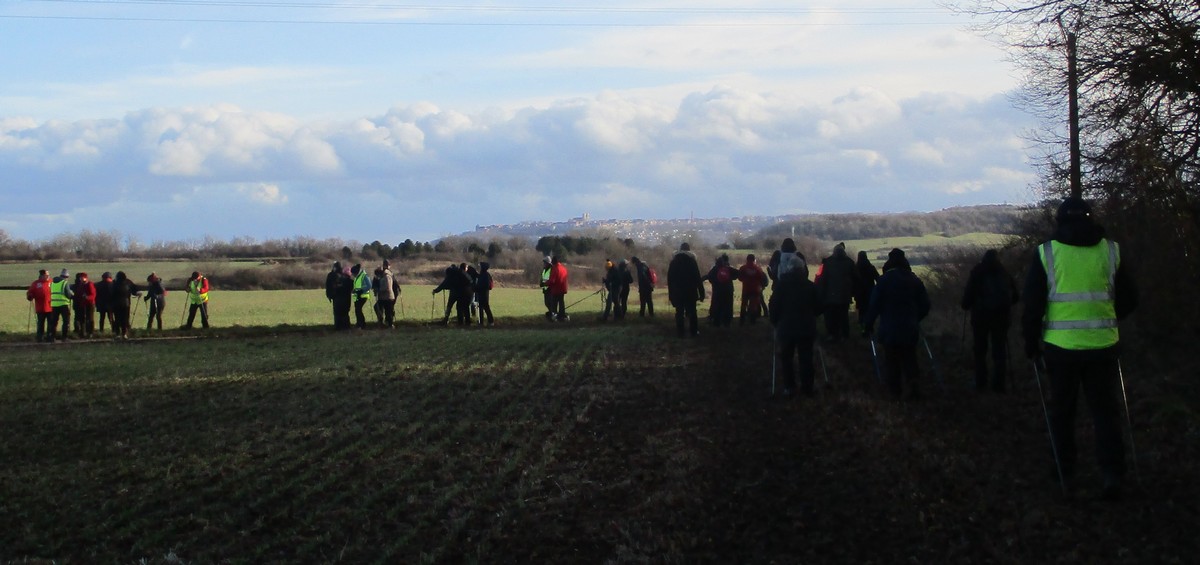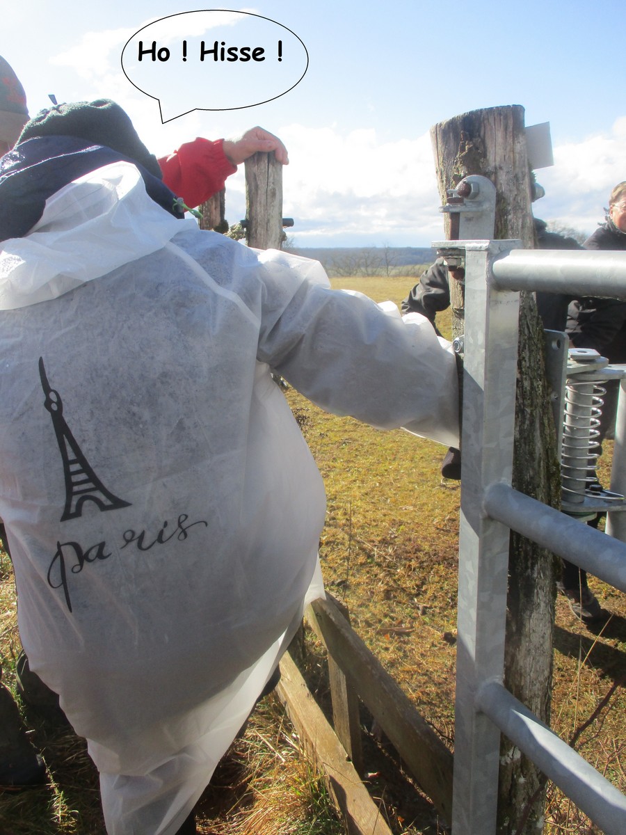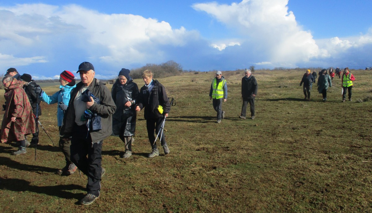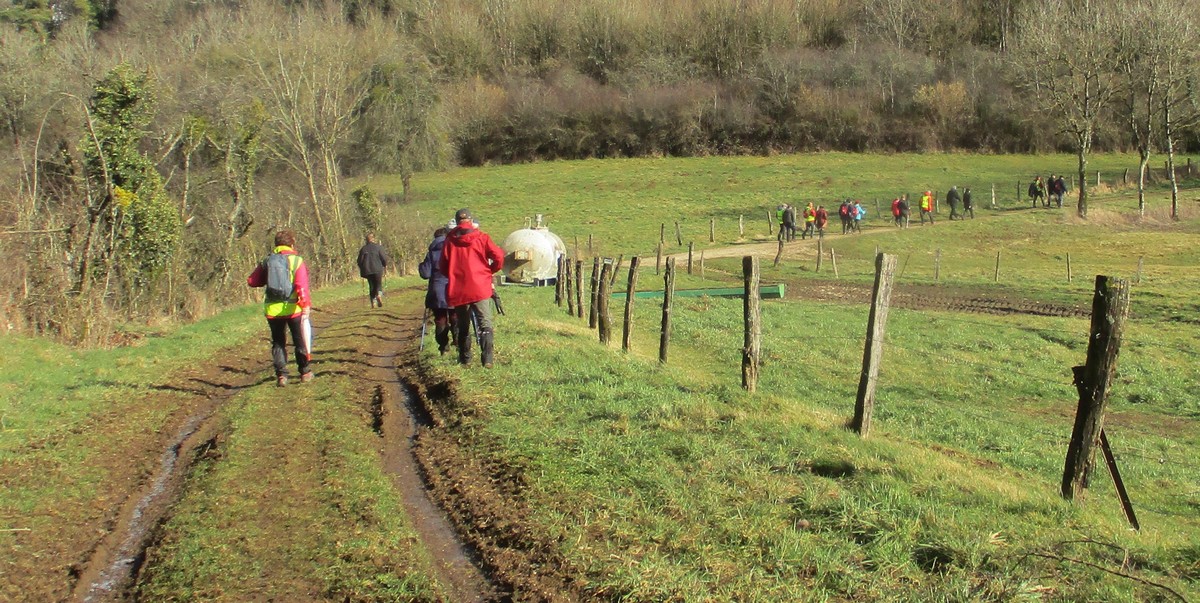 Ce mardi, ça pique un peu : le froid glacial s’installe sous un ciel bleu rayonnant. Temps idéal pour marcher depuis l’entrée du Fort de la Bonnelle. Heureusement que j’ai eu la bonne idée de planter quelques pancartes indiquant la route pour y accéder, ce qui a permis à quelques-uns d’arriver à bon Fort ! Nous sommes une quarantaine de joyeux lurons bien emmitouflés à démarrer cette petite marche de 5,2kms en direction de Buzon, en passant par l’escargot et à côté de la Chapelle de Chardonville. Violette a retrouvé Bingo. Après avoir marché sur des chemins stabilisés, nous nous engageons dans un sentier quasi-impraticable qui, à défaut d’être « gouillasseux », est plutôt « glaçouilleux ». Tant pis pour les chaussures ; nous évitons quand même de glisser sur les plaques de verglas recouvrant les ornières. A la sortie de la partie boisée, on en profite pour faire la photo de groupe : en fonction de la position du soleil, tout le groupe s’est retrouvé dans le champ où la terre collait aux chaussures. Au bout d’un bon kilomètre, nous retrouvons enfin le stabilisé et nous en profitons alors pour nettoyer sommairement nos godillots sur l’herbe. Nous terminons notre périple jusqu’à l’arrivée, toujours sous le soleil, là où nos voitures gardent l’entrée du Fort !