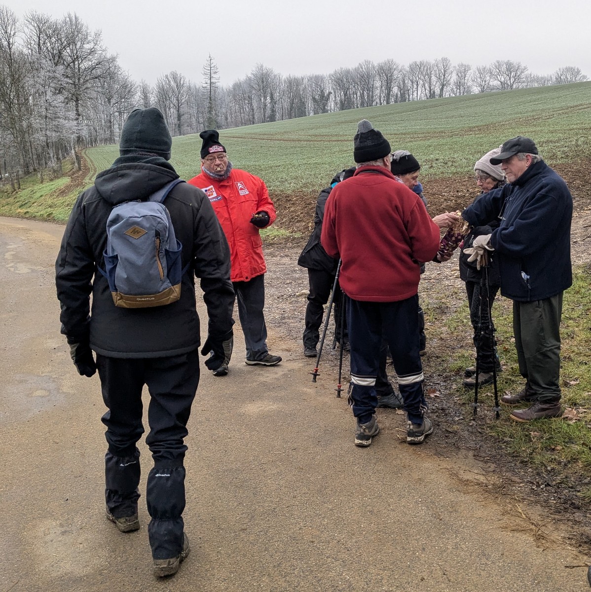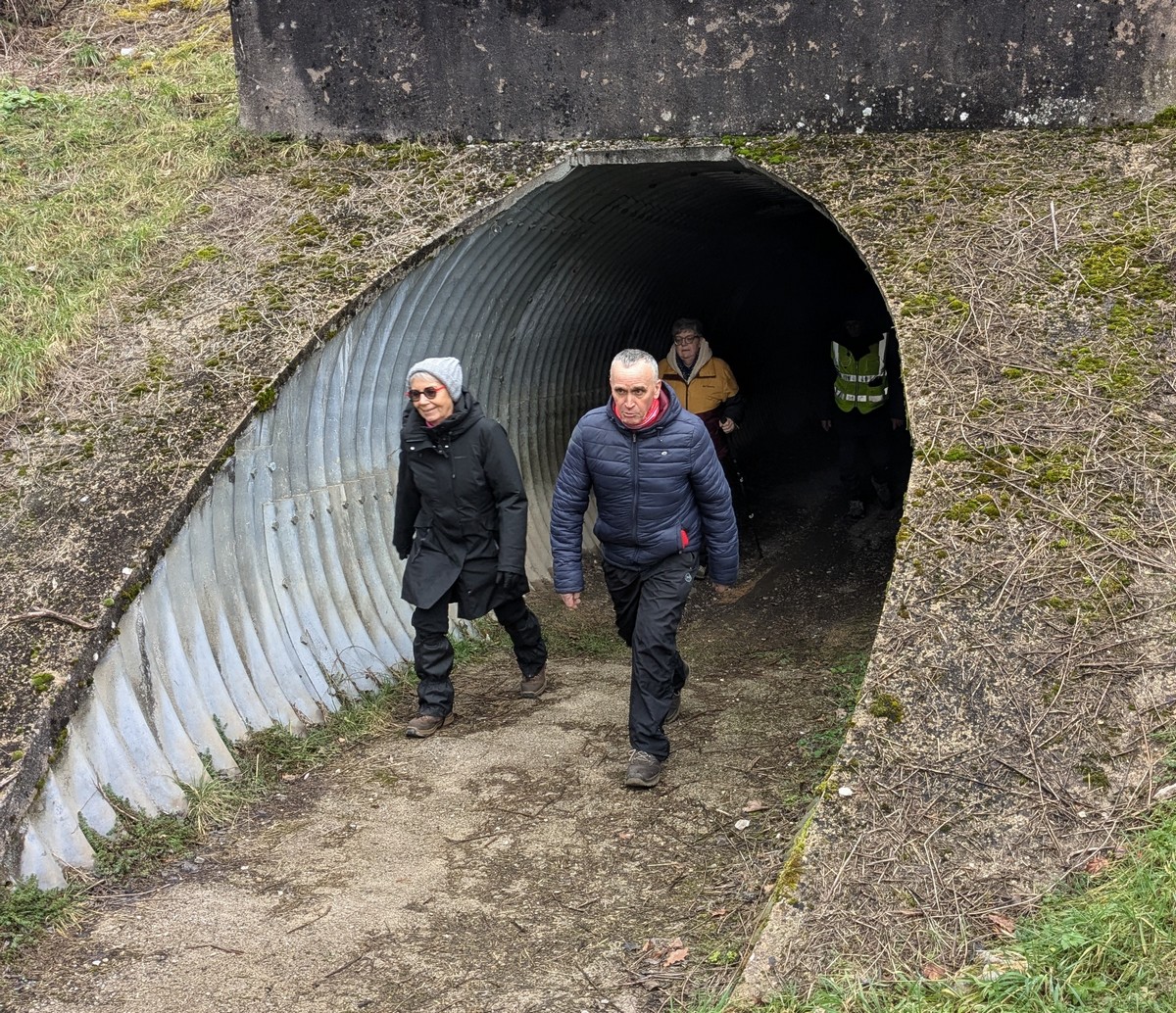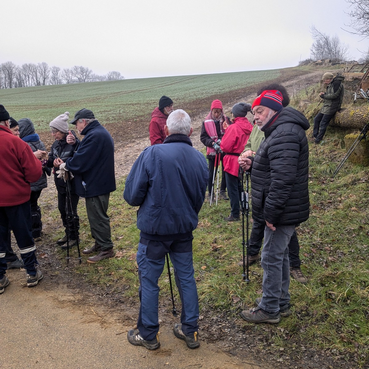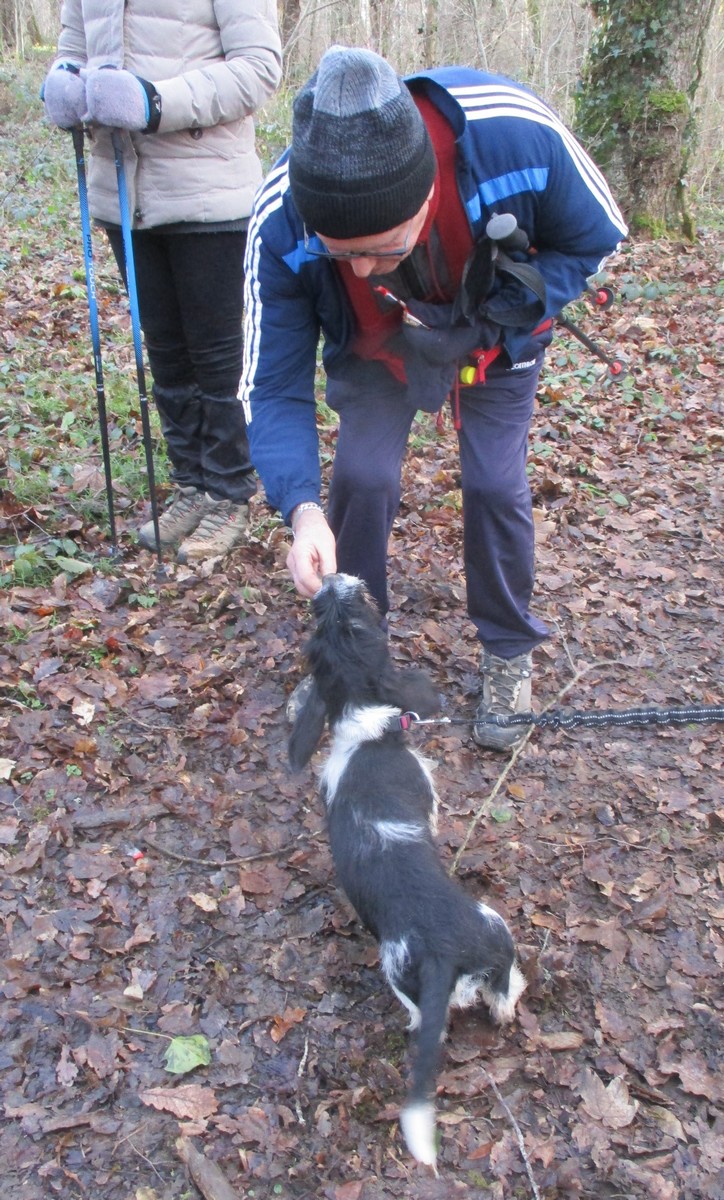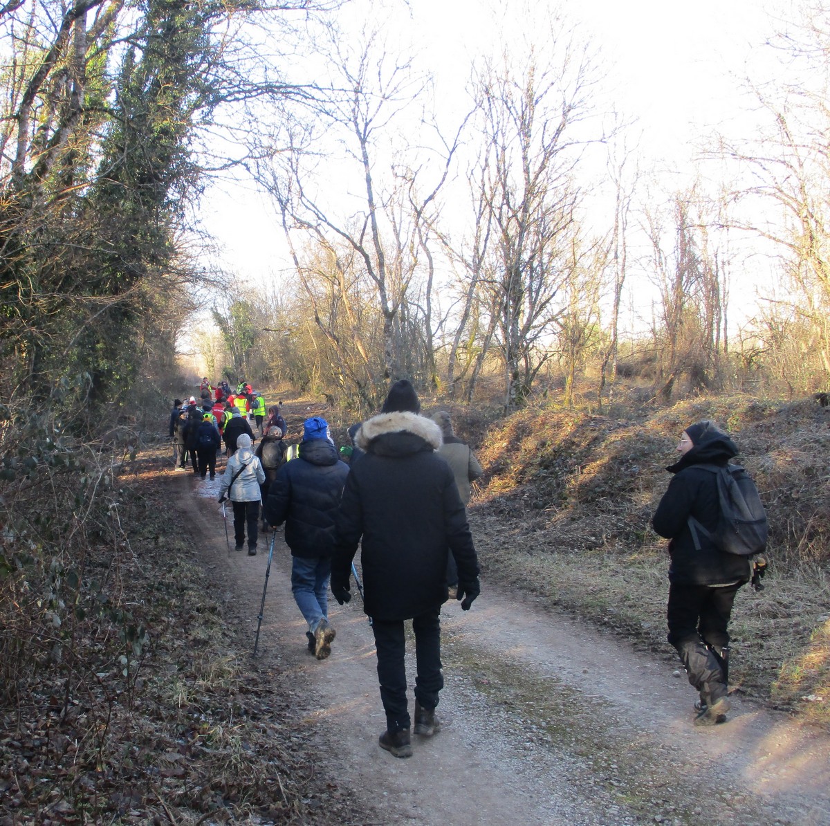 Ce mardi, ça pique un peu : le froid glacial s’installe sous un ciel bleu rayonnant. Temps idéal pour marcher depuis l’entrée du Fort de la Bonnelle. Heureusement que j’ai eu la bonne idée de planter quelques pancartes indiquant la route pour y accéder, ce qui a permis à quelques-uns d’arriver à bon Fort ! Nous sommes une quarantaine de joyeux lurons bien emmitouflés à démarrer cette petite marche de 5,2kms en direction de Buzon, en passant par l’escargot et à côté de la Chapelle de Chardonville. Violette a retrouvé Bingo. Après avoir marché sur des chemins stabilisés, nous nous engageons dans un sentier quasi-impraticable qui, à défaut d’être « gouillasseux », est plutôt « glaçouilleux ». Tant pis pour les chaussures ; nous évitons quand même de glisser sur les plaques de verglas recouvrant les ornières. A la sortie de la partie boisée, on en profite pour faire la photo de groupe : en fonction de la position du soleil, tout le groupe s’est retrouvé dans le champ où la terre collait aux chaussures. Au bout d’un bon kilomètre, nous retrouvons enfin le stabilisé et nous en profitons alors pour nettoyer sommairement nos godillots sur l’herbe. Nous terminons notre périple jusqu’à l’arrivée, toujours sous le soleil, là où nos voitures gardent l’entrée du Fort !
