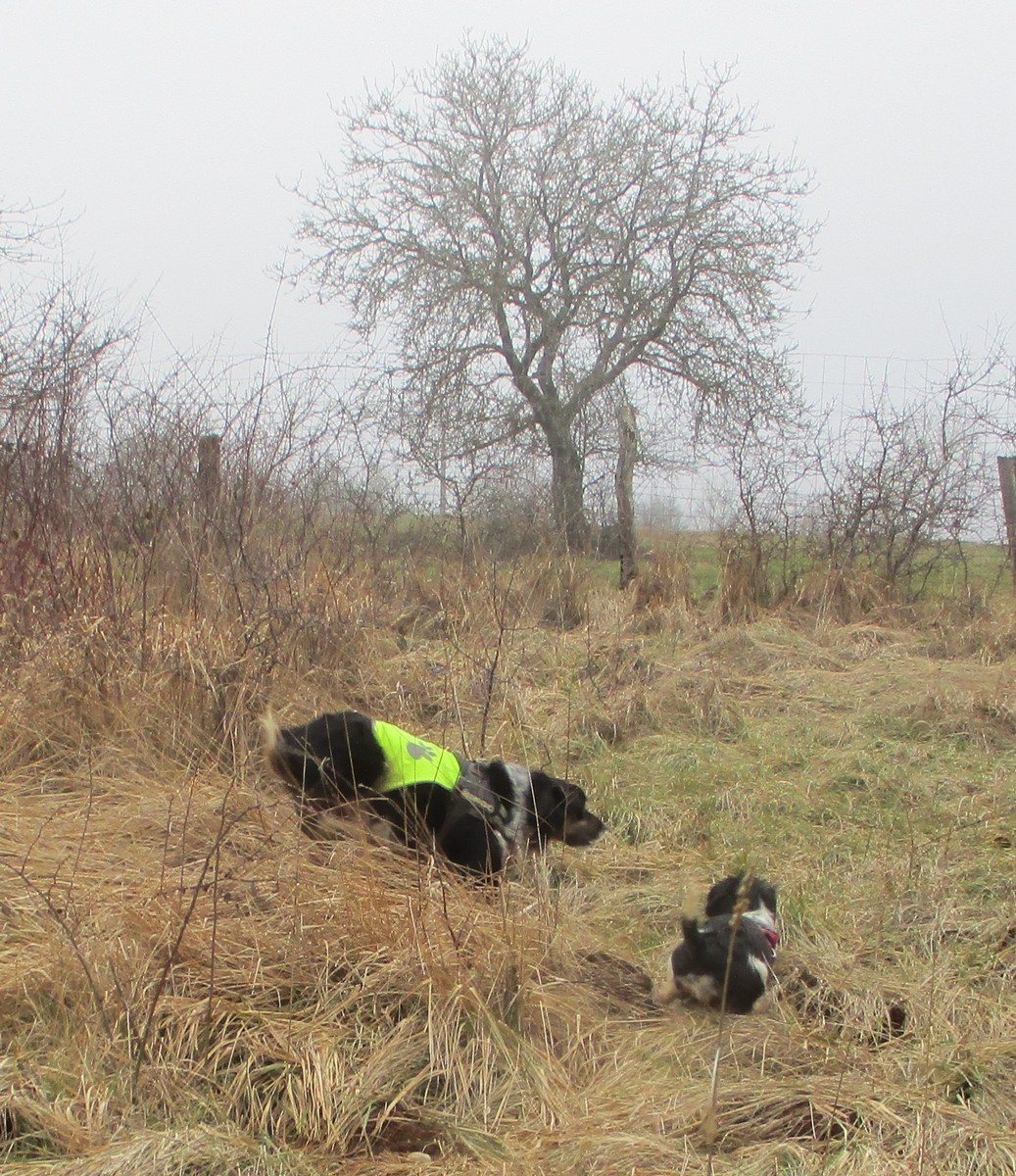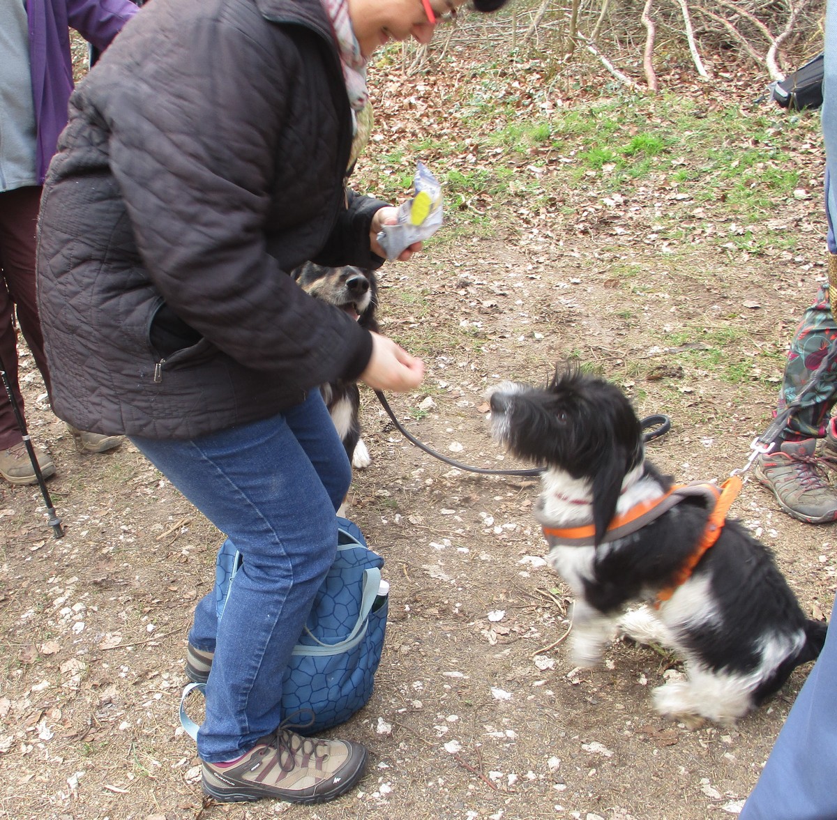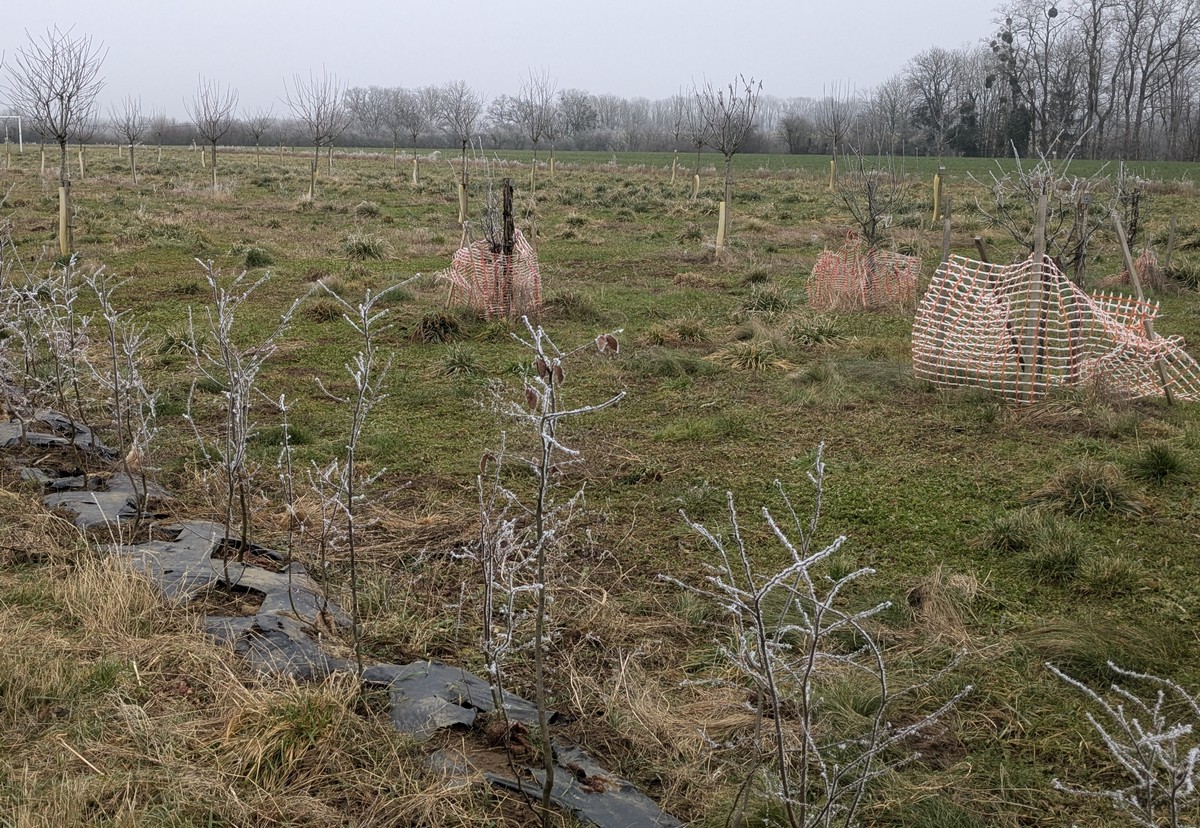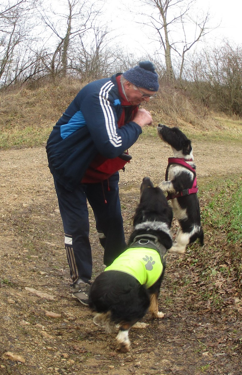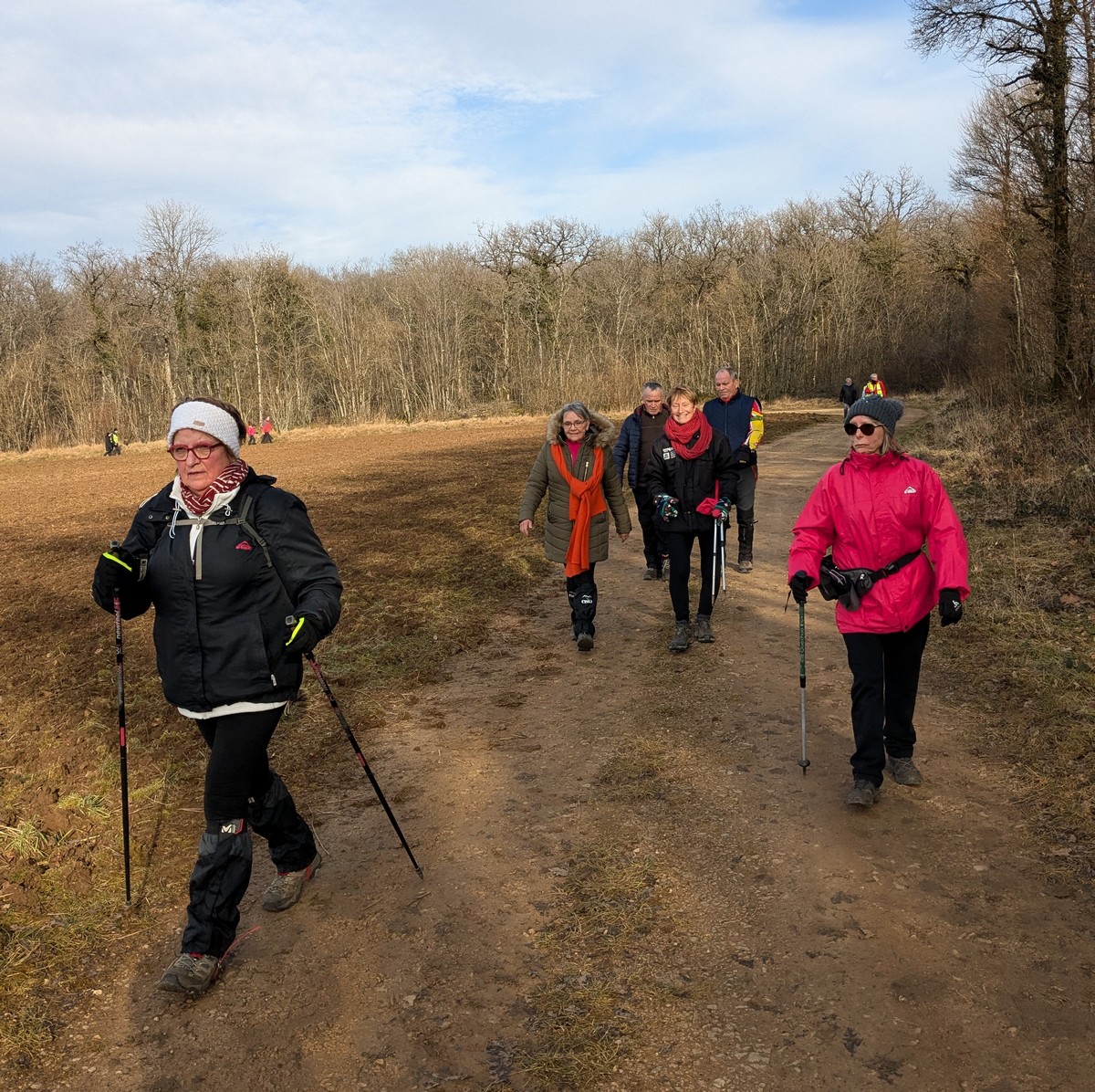 Ce mardi, ça pique un peu : le froid glacial s’installe sous un ciel bleu rayonnant. Temps idéal pour marcher depuis l’entrée du Fort de la Bonnelle. Heureusement que j’ai eu la bonne idée de planter quelques pancartes indiquant la route pour y accéder, ce qui a permis à quelques-uns d’arriver à bon Fort ! Nous sommes une quarantaine de joyeux lurons bien emmitouflés à démarrer cette petite marche de 5,2kms en direction de Buzon, en passant par l’escargot et à côté de la Chapelle de Chardonville. Violette a retrouvé Bingo. Après avoir marché sur des chemins stabilisés, nous nous engageons dans un sentier quasi-impraticable qui, à défaut d’être « gouillasseux », est plutôt « glaçouilleux ». Tant pis pour les chaussures ; nous évitons quand même de glisser sur les plaques de verglas recouvrant les ornières. A la sortie de la partie boisée, on en profite pour faire la photo de groupe : en fonction de la position du soleil, tout le groupe s’est retrouvé dans le champ où la terre collait aux chaussures. Au bout d’un bon kilomètre, nous retrouvons enfin le stabilisé et nous en profitons alors pour nettoyer sommairement nos godillots sur l’herbe. Nous terminons notre périple jusqu’à l’arrivée, toujours sous le soleil, là où nos voitures gardent l’entrée du Fort !