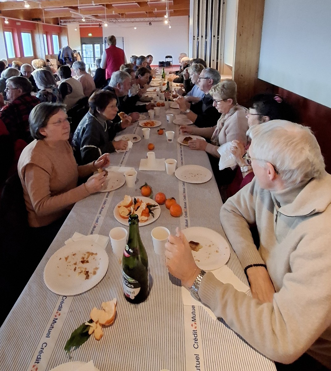 Puis tout ce petit monde a pris sa chaise pour s’installer autour des tables dressées pour l’occasion. En plus de la part de galette que chacun a eu dans son assiette, des clémentines ornaient également les tables. Au bout de quelques minutes, les fèves sont sorties des bouches de certains, sans se casser les dents. Mais, pour le sacre … il n’y avait pas de couronnes, lesquelles n’avaient pas été livrées avec les galettes au grand dam des reines et rois du jour. Les galettes étaient excellentes : c’est le principal. Arriva la tombée de la nuit où chacun et chacune repartaient à la maison en attendant de se revoir prochainement dans leurs activités respectives.