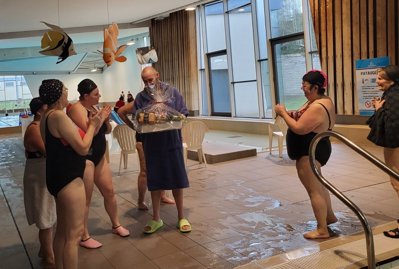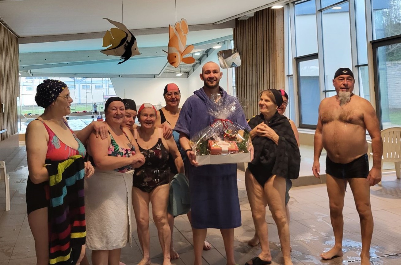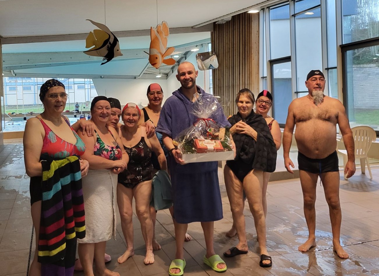 Aujourd’hui premier lundi de l’année 2025 et on se jette à l’eau en ce début d’après-midi. Nous sommes moins d’une dizaine à démarrer l’an nouveau, coaché par notre Jérôme. Après la séance, on s’est tous retrouvés hors de l’eau pour souhaiter nos vœux à notre coach et lui offrir un petit cadeau afin qu’il continue à nous faire bosser en douceur … mais efficacement. Le deuxième trimestre de la saison est maintenant lancé !