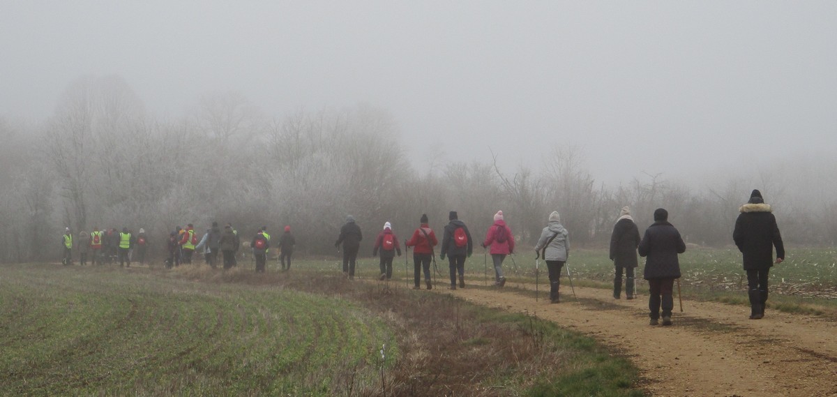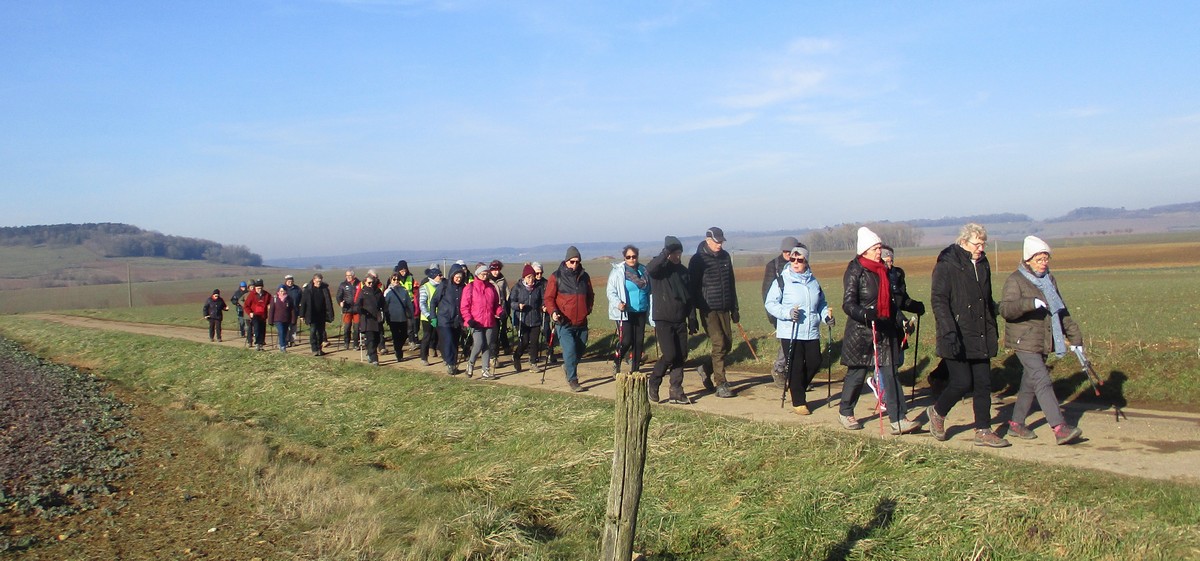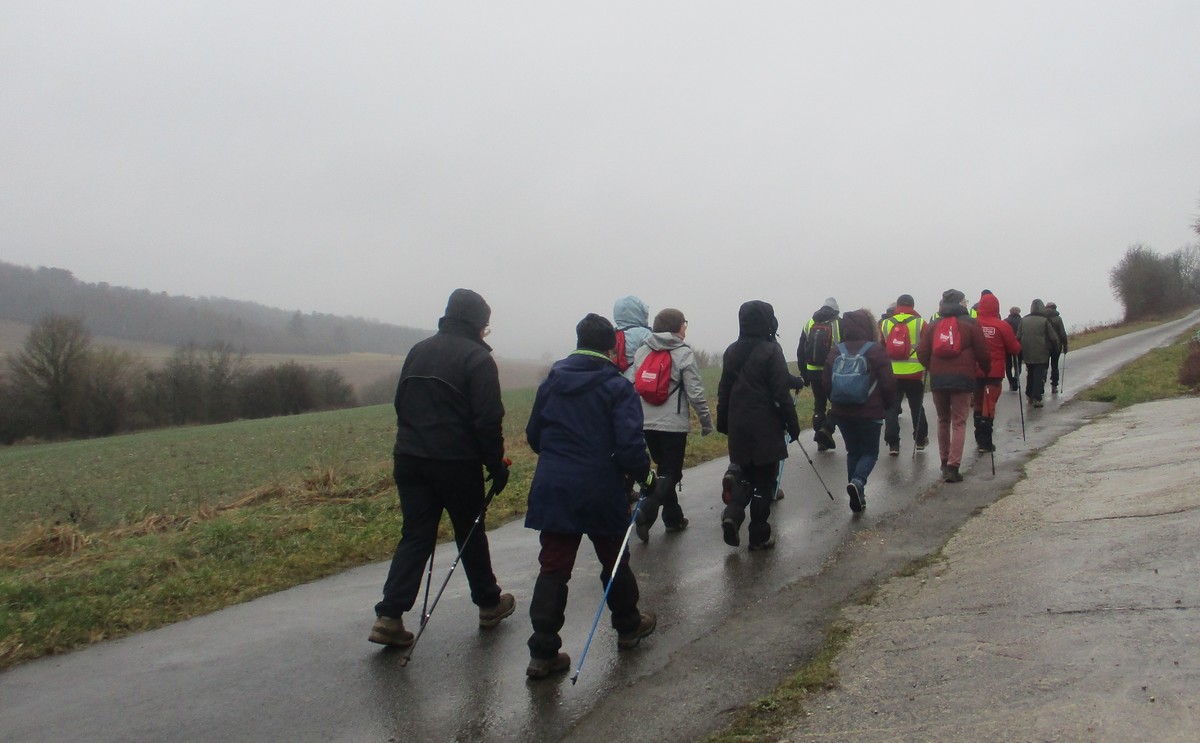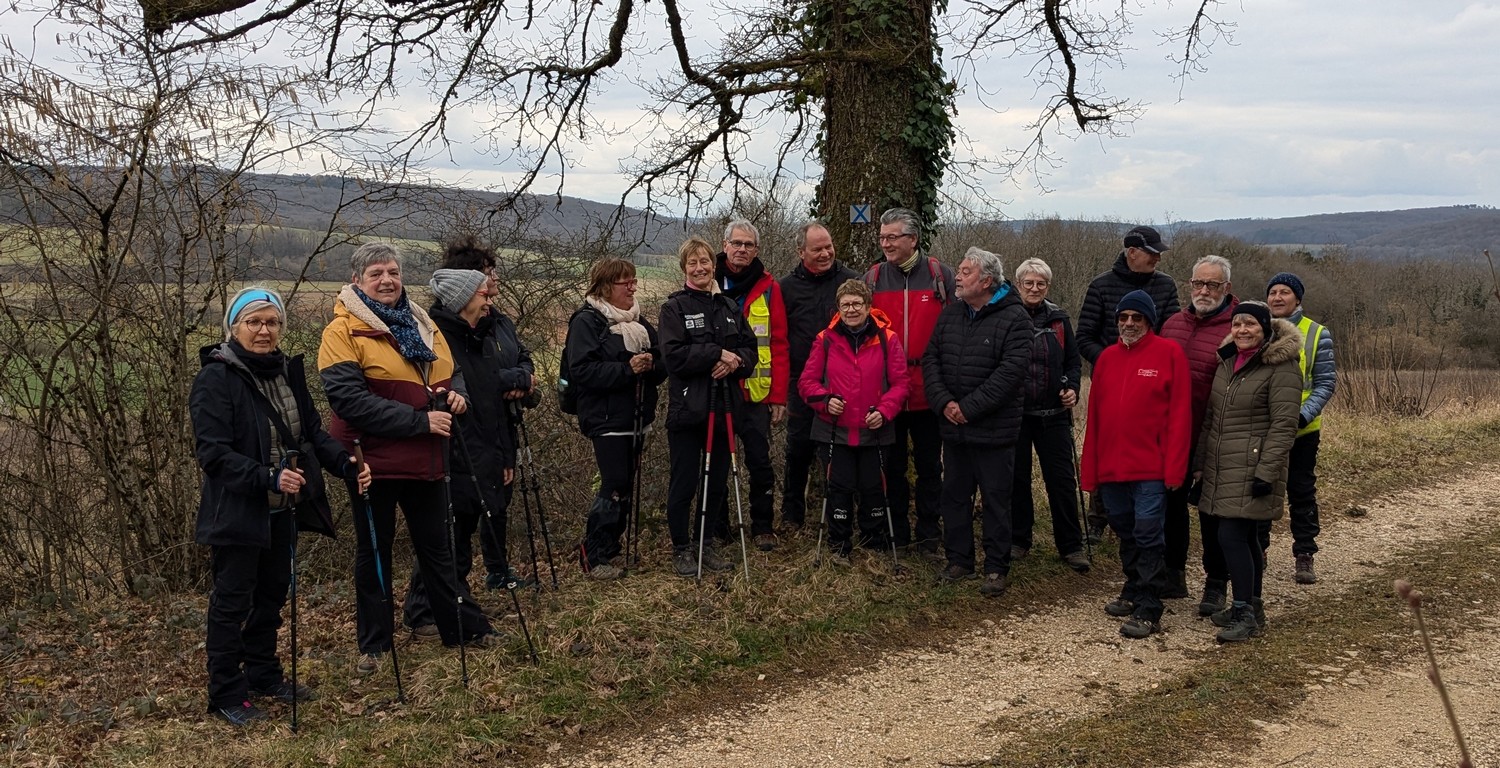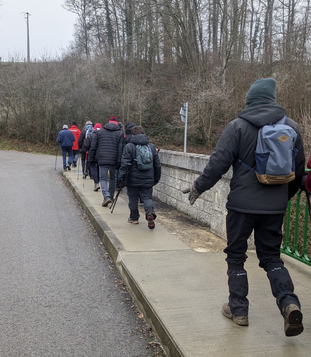 Nous sommes une petite vingtaine au départ de Vesaignes, la température est de 8°. Nous prenons la direction de Marnay-sur-Marne en longeant le canal pour reprendre un tunnel. S’en suit une côte avant l’entrée du village, puis pose photos devant le lavoir de la Potesse. Nous repartons pour une longue montée afin de rejoindre la plaine avec une magnifique vue dominant la vallée de la Marne. Ensuite une descente dans le bois ou l’on peut apercevoir les cabanes insolites du domaine du Moulin de Trimeule. Pour finir, petit passage scabreux de façon à attaquer la dernière montée et redescendre sur Vesaignes, soit 9,8 kms.